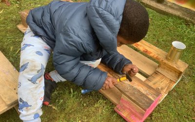 Hierzu waren verschiedene Stationen aufgebaut, an denen die Kinder schneiden, kleben, malen und bauen konnten. Mit Pinsel und Farbe wurden Blechdosen bemalt, Nägel in Bretter gehämmert, Holz geschmirgelt und Zäune mit bunten Bändern geschmückt.
