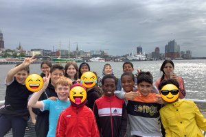 Am Morgen machte sich die 4b mit Frau Brümmer und Herrn Röseler auf den Weg. Die Anreise war schon ein Abenteuer: Erst mit der Bahn nach Altona, dann zu Fuß über den Altonaer Balkon zum Dockland, von dort mit der Fähre zu den Landungsbrücken und schließlich mit dem Bus zum Spielort.