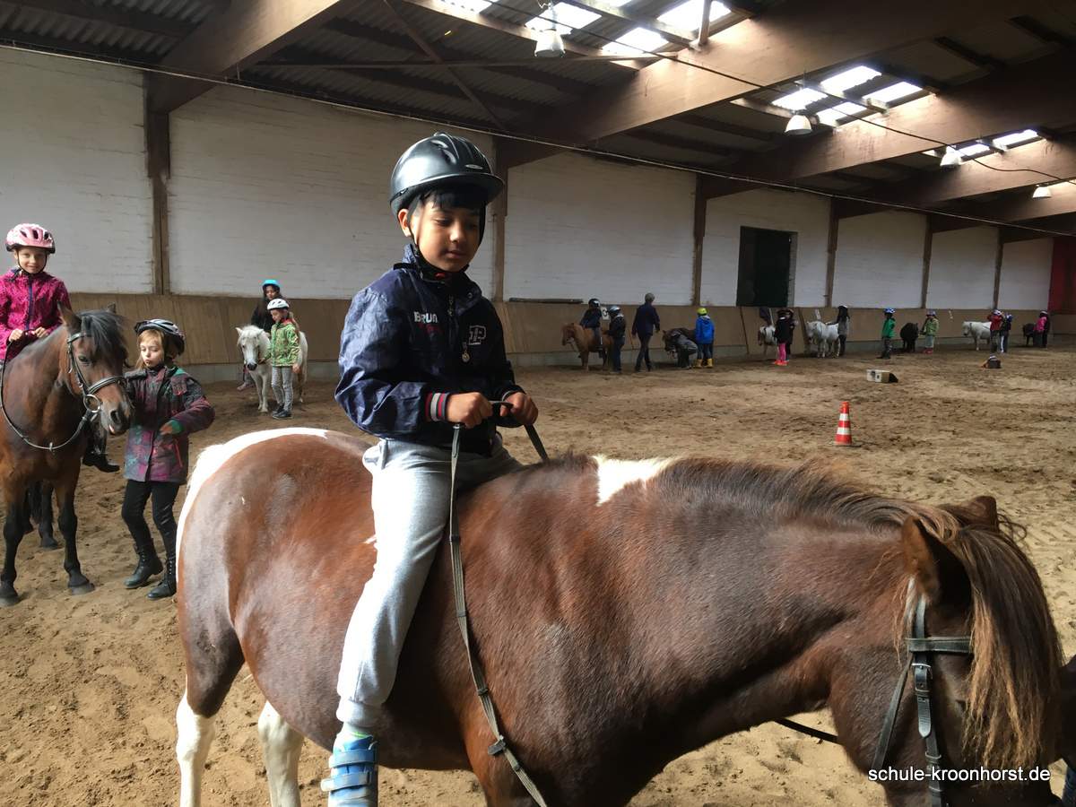 Reiten: Wir waren in einer Halle. Aber erstmal mussten wir die Ponys putzen. Dann waren wir in einem Wald. Da waren wir mit den Ponys.