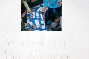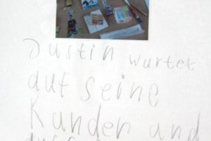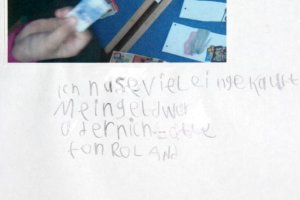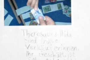 Die Klasse 2b hat sich in der vergangenen Woche mit dem Thema Geld befasst. Die Kinder haben sich überlegt, wie es wäre, ein Geschäft zu haben und verschiedene "Waren" zu verkaufen. Also haben sie Bilder aus Zeitschriften ausgeschnitten, sich in der Klasse "kleine Läden" eingerichtet und sich gegenseitig ihr Angebot verkauft.
