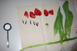 Der hat allerdings nicht lange überlebt, denn die kleinen Forscher rückten mit Lupe und Pinzette an, um das Wesen einer Tulpe vom Blatt bis zum Stempel zu ergründen.