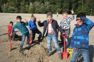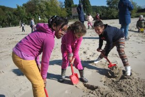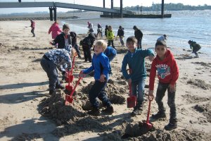 Trotz der plötzlich einsetzenden Kälte haben wir viel Spaß, schließlich gibt es Winterjacken, Mützen, Handschuhe und vor allem: Gummistiefel!!! Denn die sind für das Buddeln am Elbstrand unbedingt nötig!