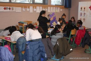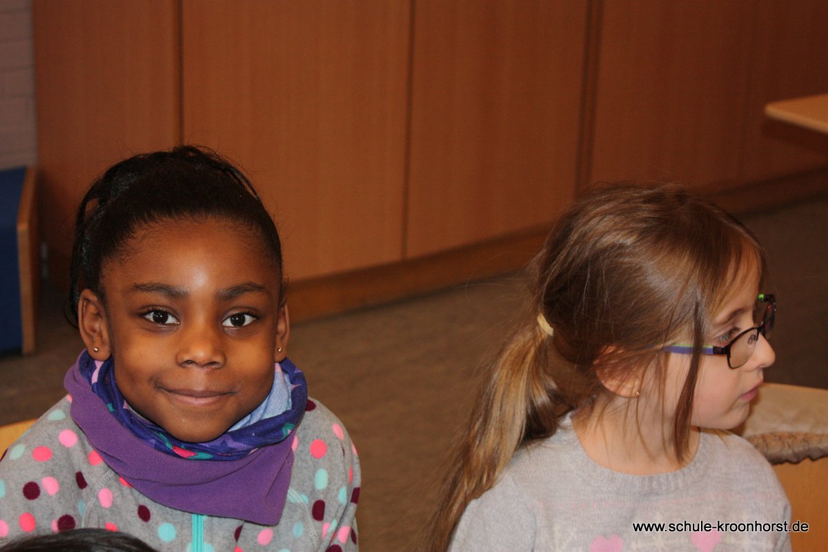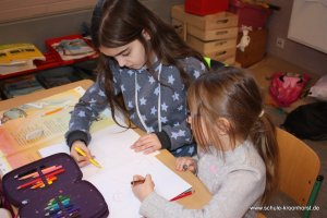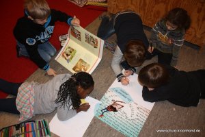 Die Vorschüler der Elefantenklasse besuchen ihre Paten in der 3b. Alle sind schon vorher sehr aufgeregt. Die „Elefanten“, weil sie sich auf ihre Paten freuen und die „Großen“ , weil sie Märchen vorlesen wollen und schon sehr lange dafür geübt haben.