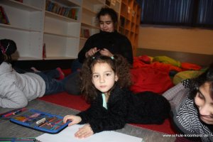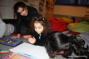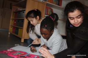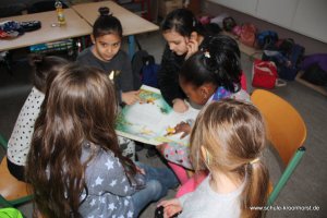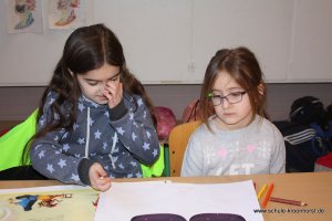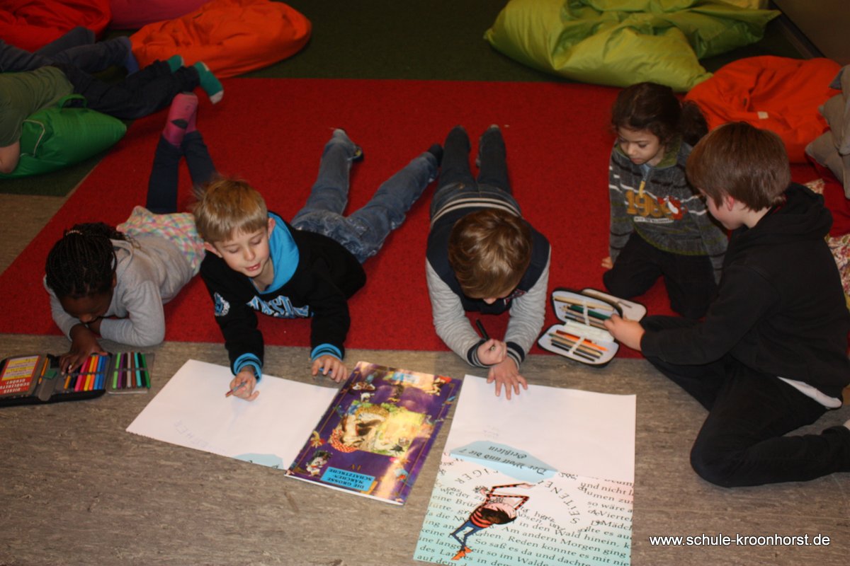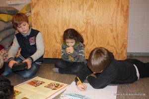 Nach der ersten wuseligen Begrüßung verteilen sich die Kinder in kleinen Gruppen im ganzen Gebäude und es erklingen die Märchen von Aladin, Dornröschen, der Hexe im Turm …. und noch einige mehr. Im Anschluss werden die Stifte ausgepackt und ein Bild zum Märchen entsteht.