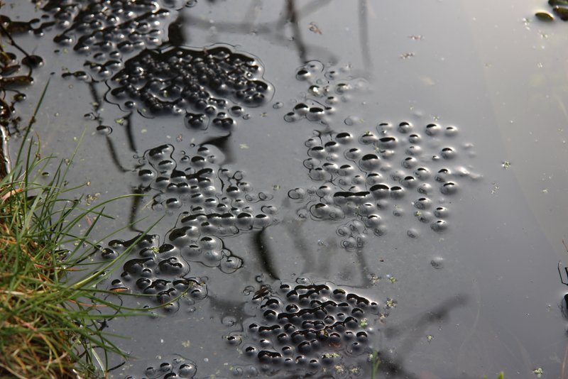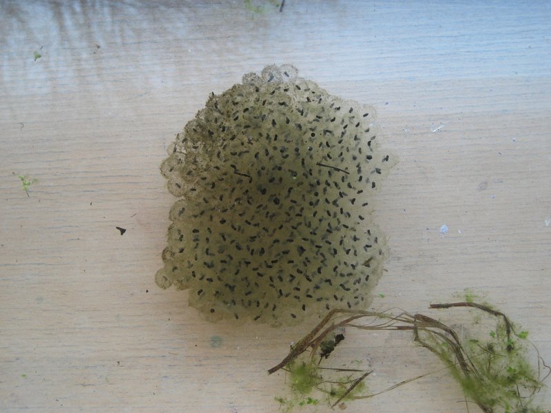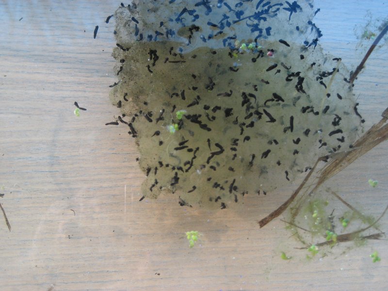Etwas Froschlaich haben wir uns "ausgeliehen" und in ein Auquarium gelegt. In den Eizellen sind kleine schwarze, längliche Punkte zu sehen. Daraus haben sich schon ganz winzige Kaulquappen entwickelt.