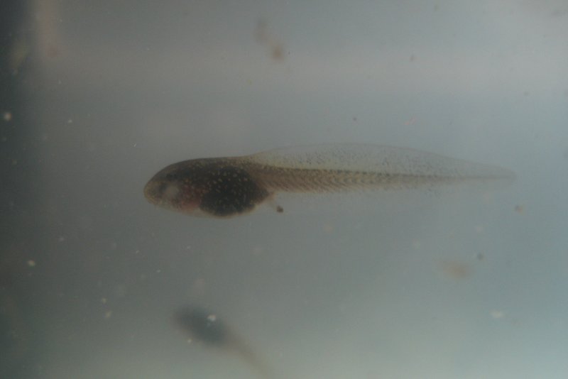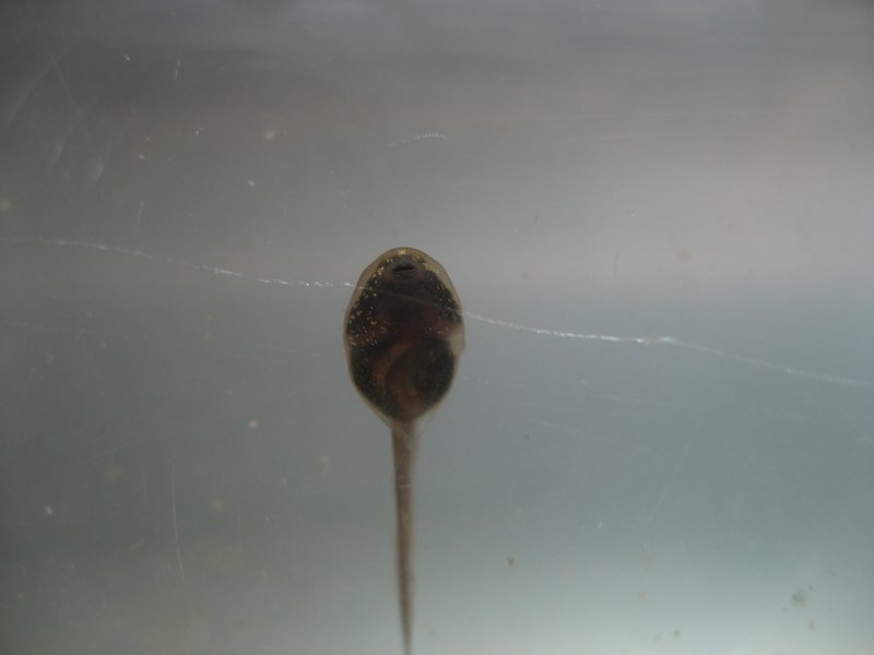 Die ersten Kaulquappen sind geschlüpft. Wir können deulich den langen Schwanz, Augen, den Mund und den breiten Oberkörper erkennen.