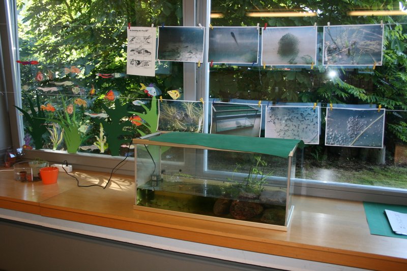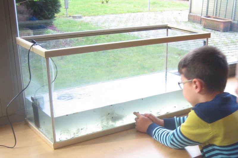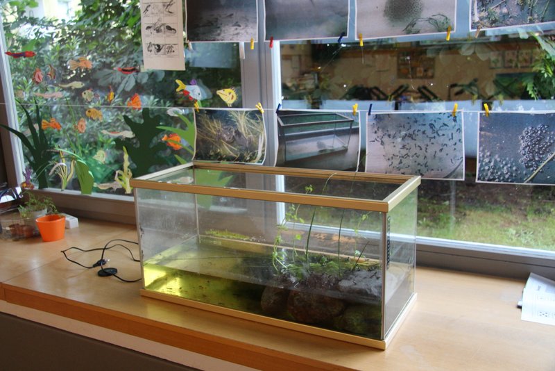 Am nächsten Tag organisiert Herr Rennhack ein Aquarium und eine Pumpe. Mit einem Eimer wird ganz vorsichtig etwas Froschlaich, so nennt man die Froscheier, aus dem Teich geholt und in das vorbereitete Aquarium gelegt. Und nun beobachten wir jeden Tag, was passiert.