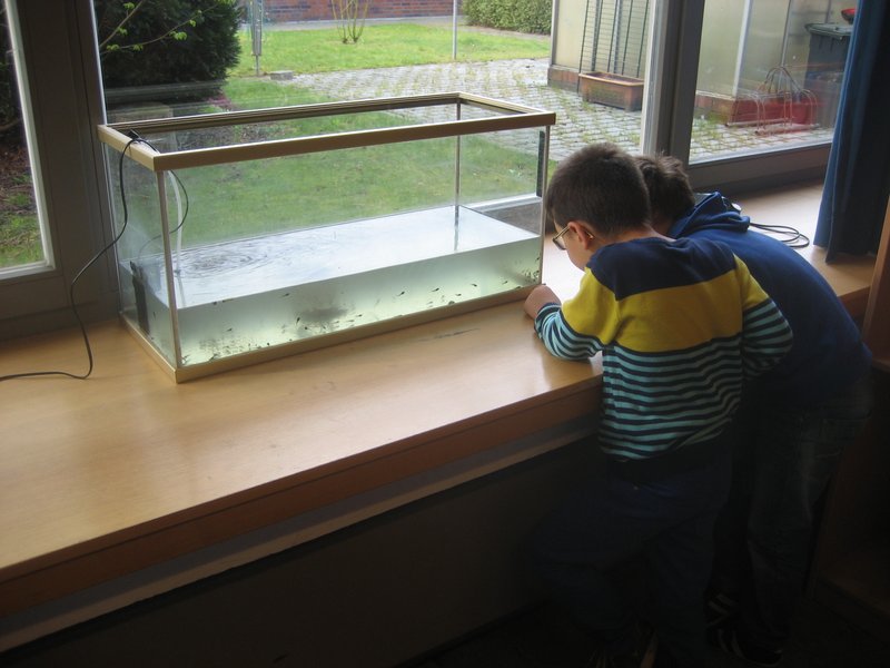 Die Kaulquappen sind ständig auf der Suche nach Nahrung. Deshalb haben wir Fischfutter aus der Zoohandlung besorgt. Außerdem sind reichlich Wasserpflanzen im Aquarium.