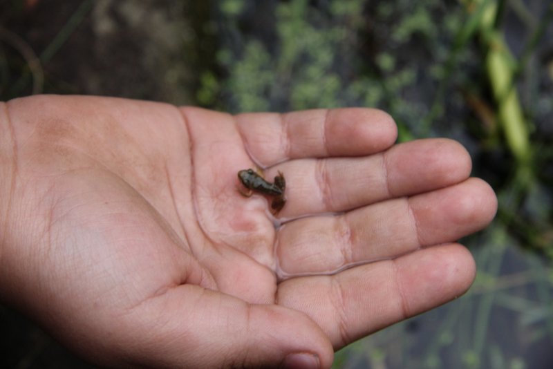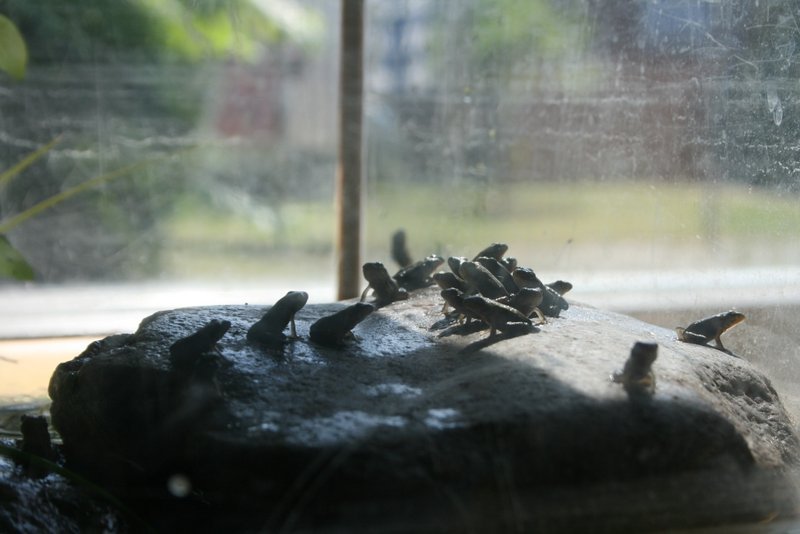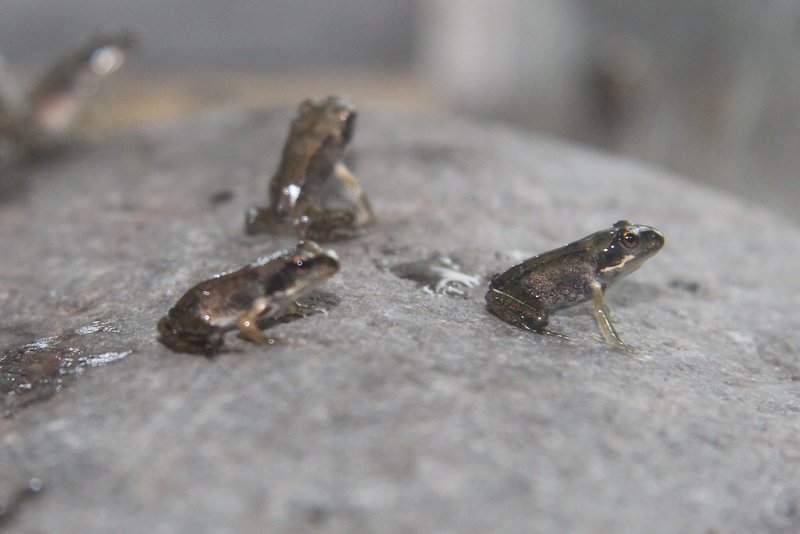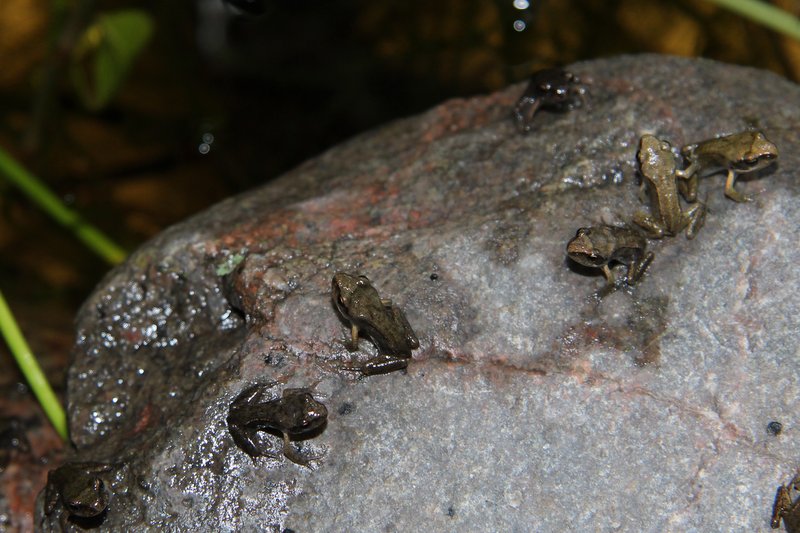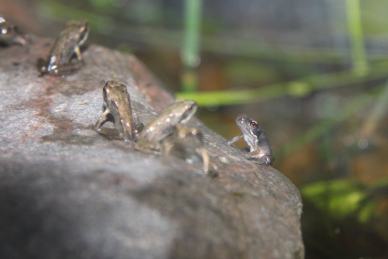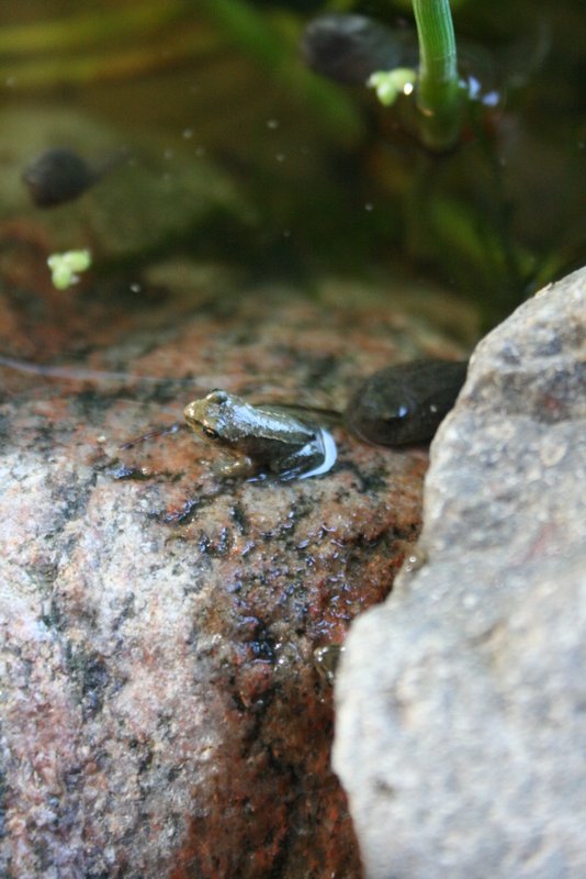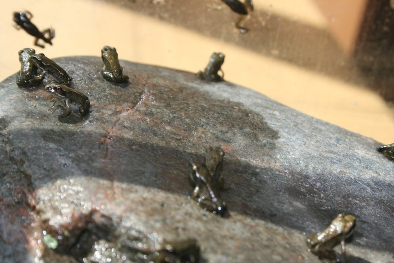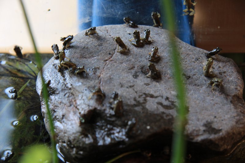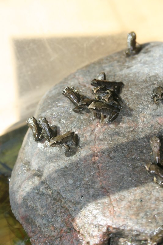 Hurra! Die ersten 5 Frösche haben sich aus den Kaulquappen entwickelt. Damit die Tiere atmen können, haben wir aus großen Steinen kleine Inseln gebaut. Dort sitzen sie gern drauf und beobachten uns beim Lernen. Einige haben noch einen kleinen Schwanz. Dieser wird sich aber bald ganz zurück entwickelt haben.