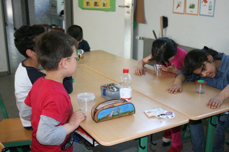 Faul liegen die vier Frösche im Wasser und sonnen sich in der warmen Frühlingssonne.  „Und was ist das?“, fragt Hassan. Yusif weiß Bescheid, denn schon im Vorschuljahr hat er den Teich besucht. „Das sind Froscheier. Weiß doch jeder. Ist doch Baby-Eier-leicht“, ruft er etwas vorlaut.  Herr Rennhack meint, dass man doch daraus ein kleines Projekt machen könnte. Alle sind begeistert.