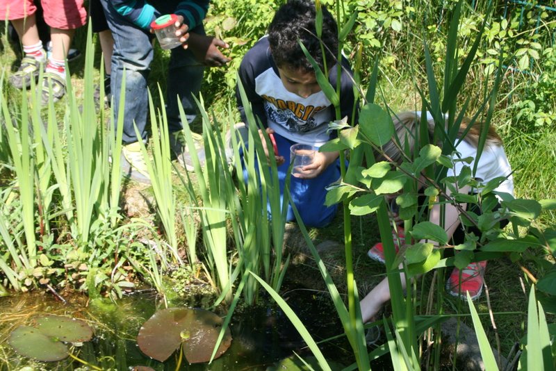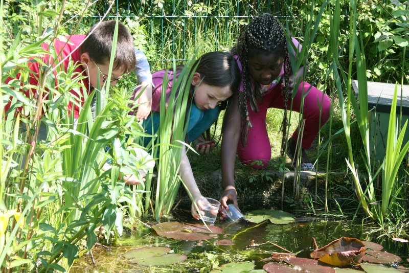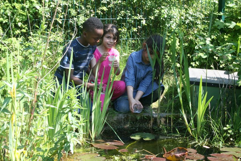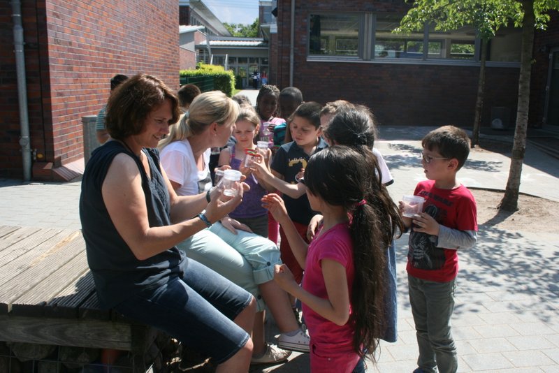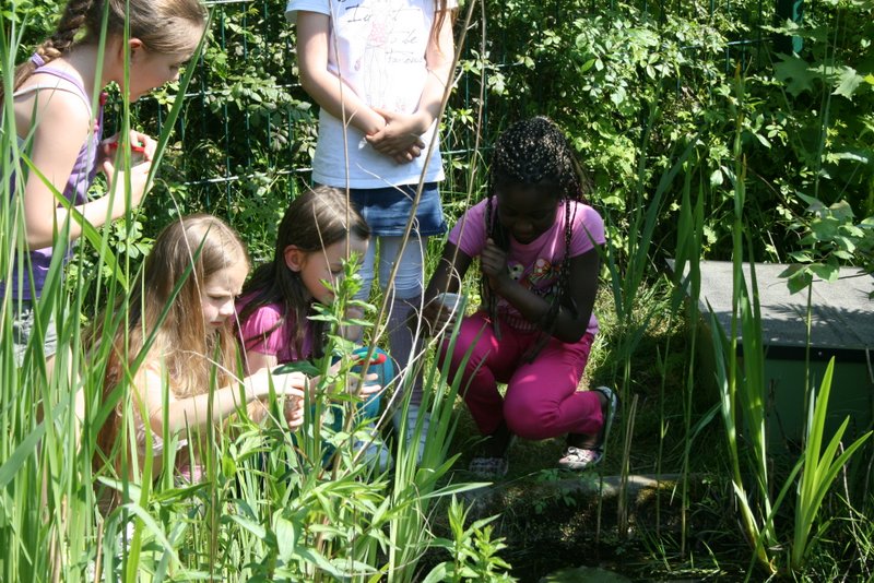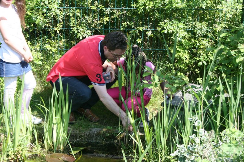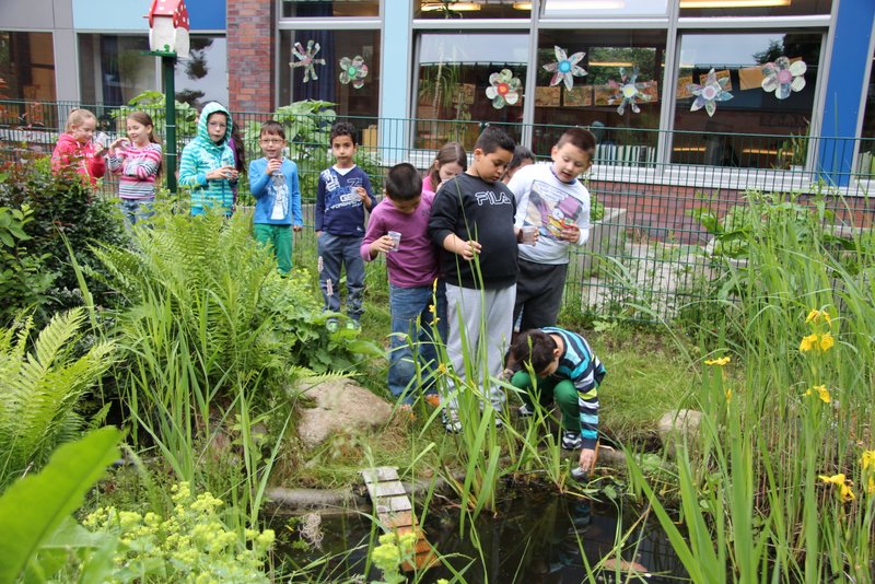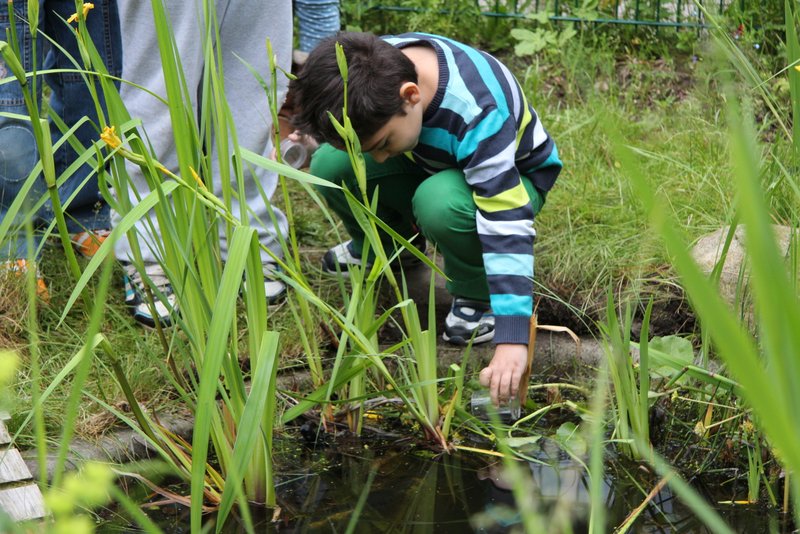 3 gut entwickelte kleine Frösche werden uns heute verlassen. Für alle Kinder ist das sehr spannend. Yusif darf die kleinen Frösche in den Schulteich setzen.