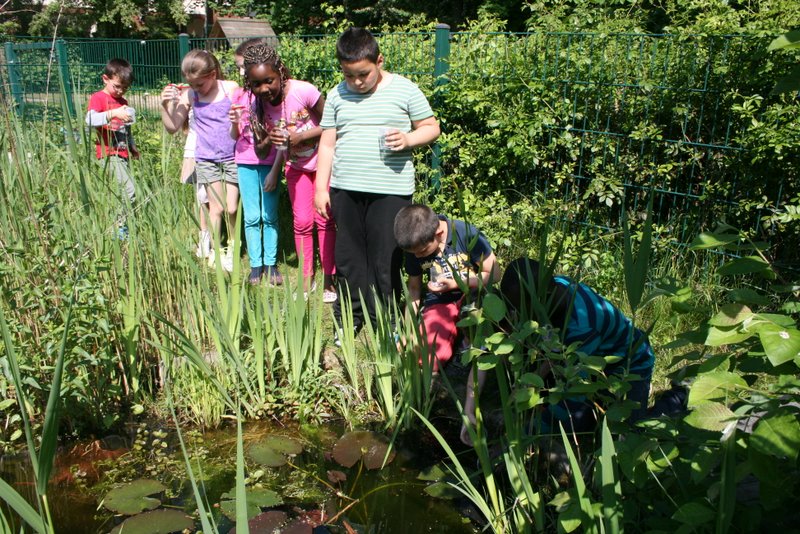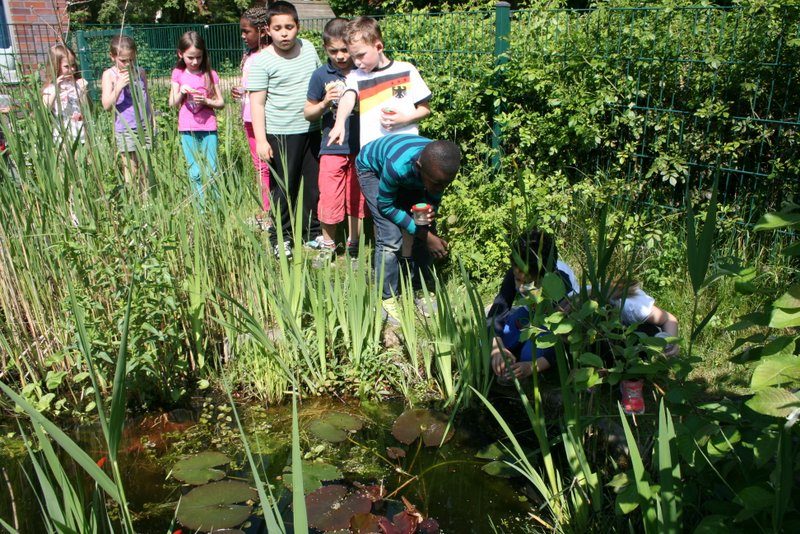 In unserem Schulteich befinden sich Frösche, Goldfische, viele Wasserpflanzen und Froschlaich.