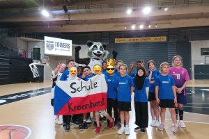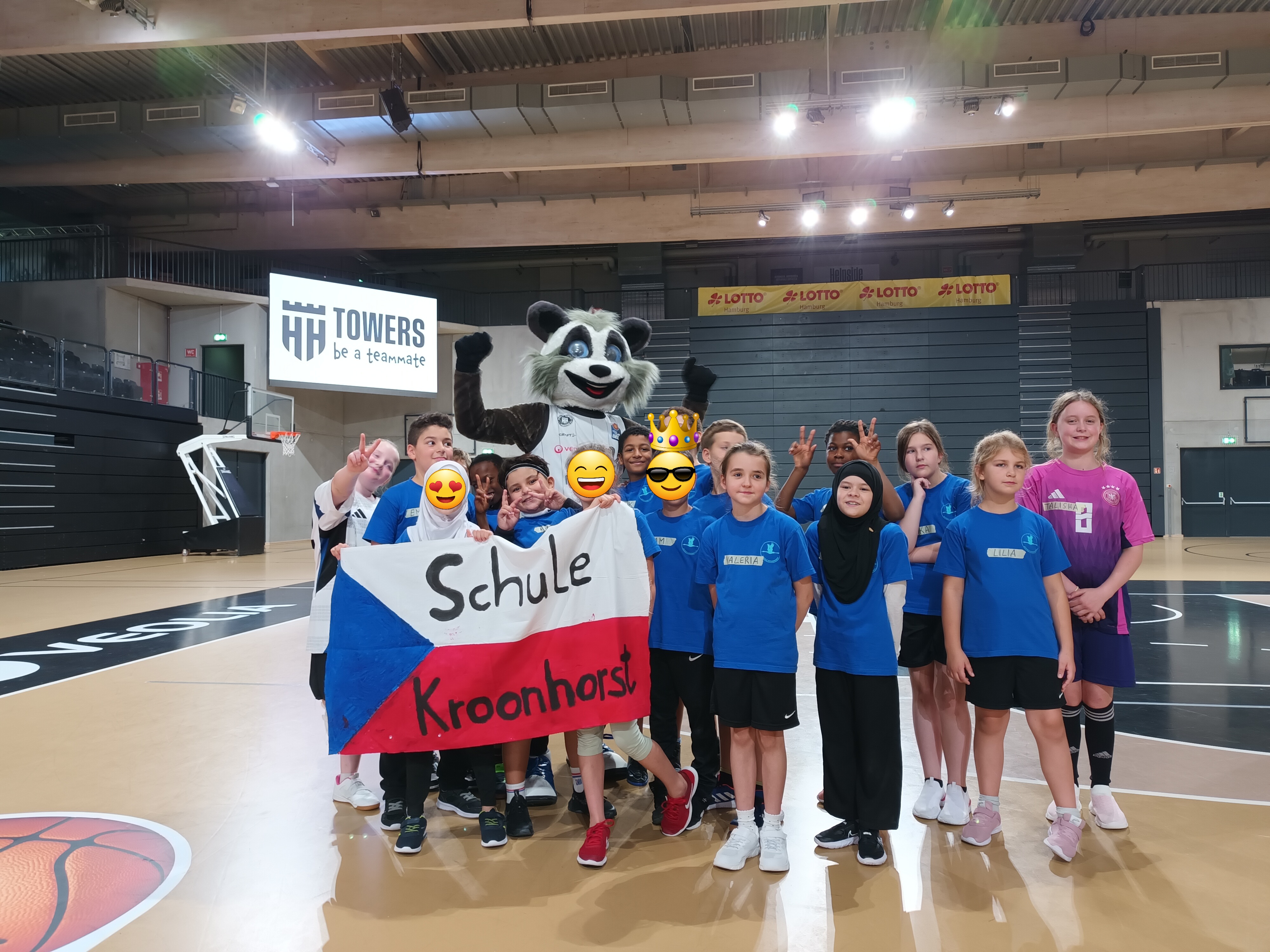 Dort empfingen uns Trainerinnen und Trainer der "Hamburg Towers", dem großen Basketballverein aus der Bundesliga. Viele weitere Grundschulen hatten sich im Vorfeld um die Teilnahme beworben, wir hatten großes Glück und durften dabei sein.