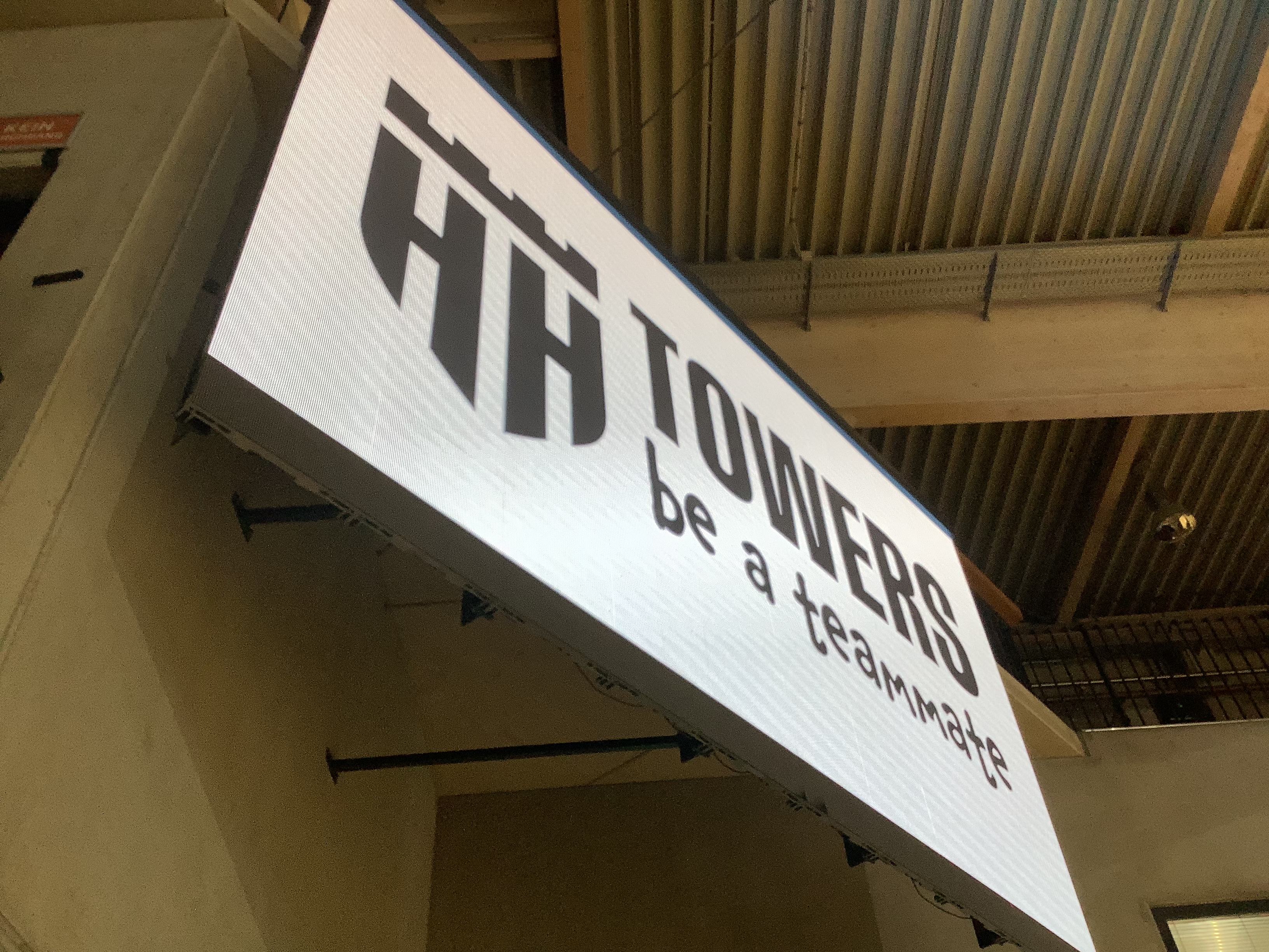 Zum Abschluss des bis dahin schon ereignisreichen Tages überraschte uns ein besonderer Ehrengast. Das Maskottchen der Towers, ein riesiger Waschbär namens Willy, betrat unter großem Jubel die Halle. Prompt versammelte sich das Team Kroonhorst um Willy, klatschte mit ihm ab und posierte gemeinsam für ein Foto - ein herrliches Ende unserer langen Tour.