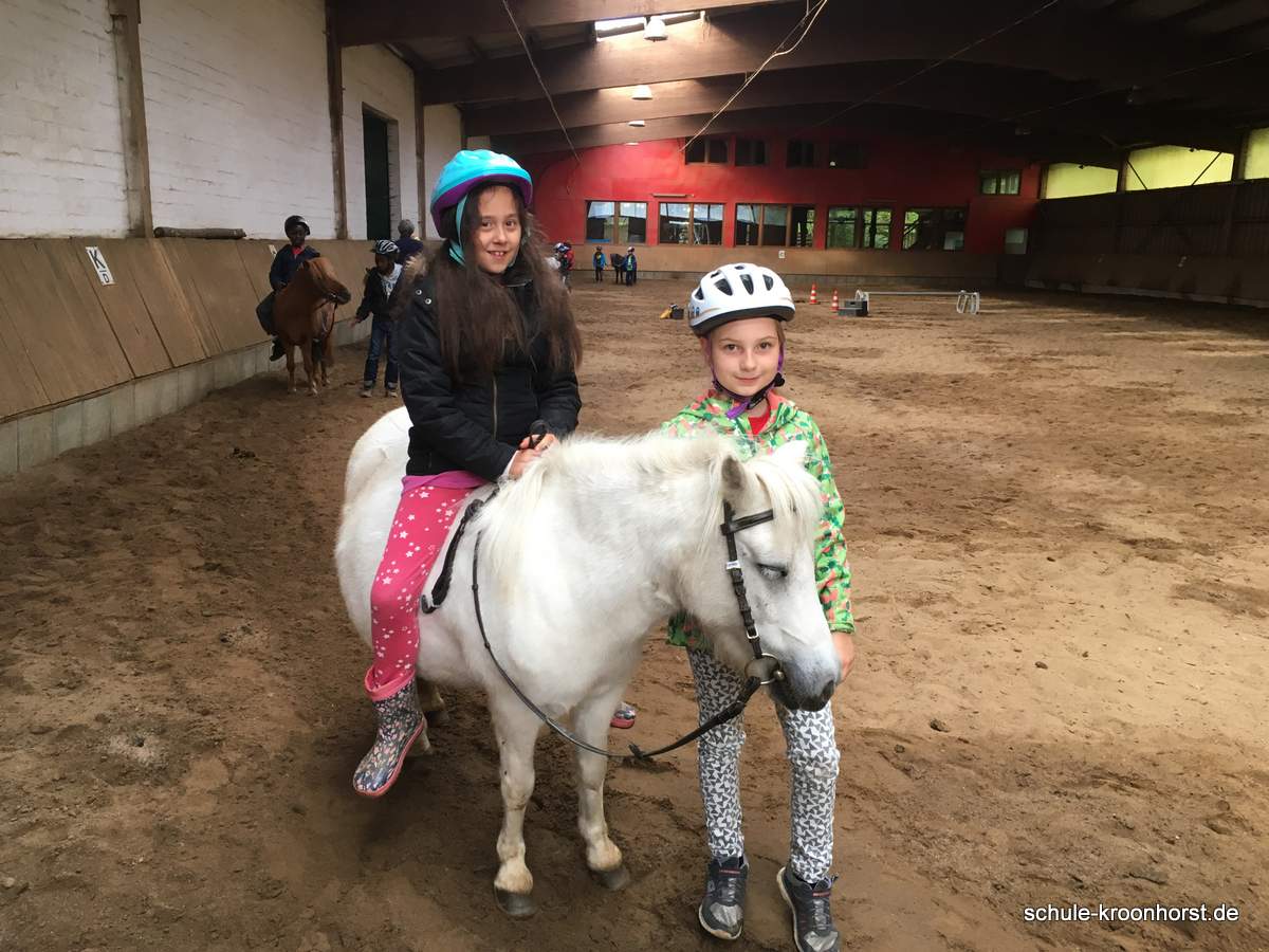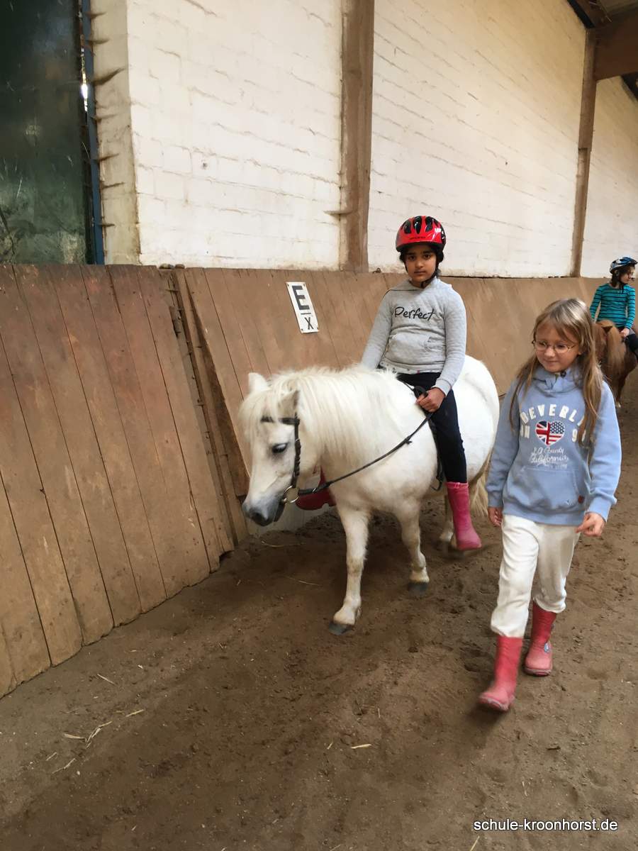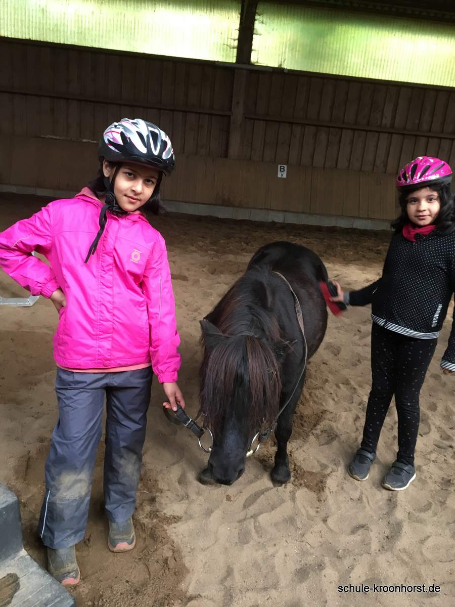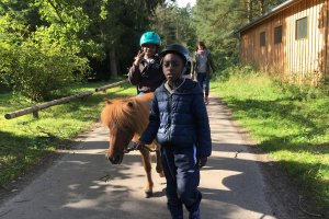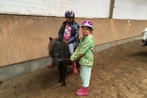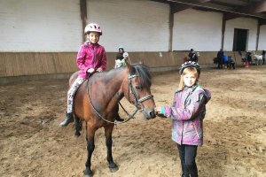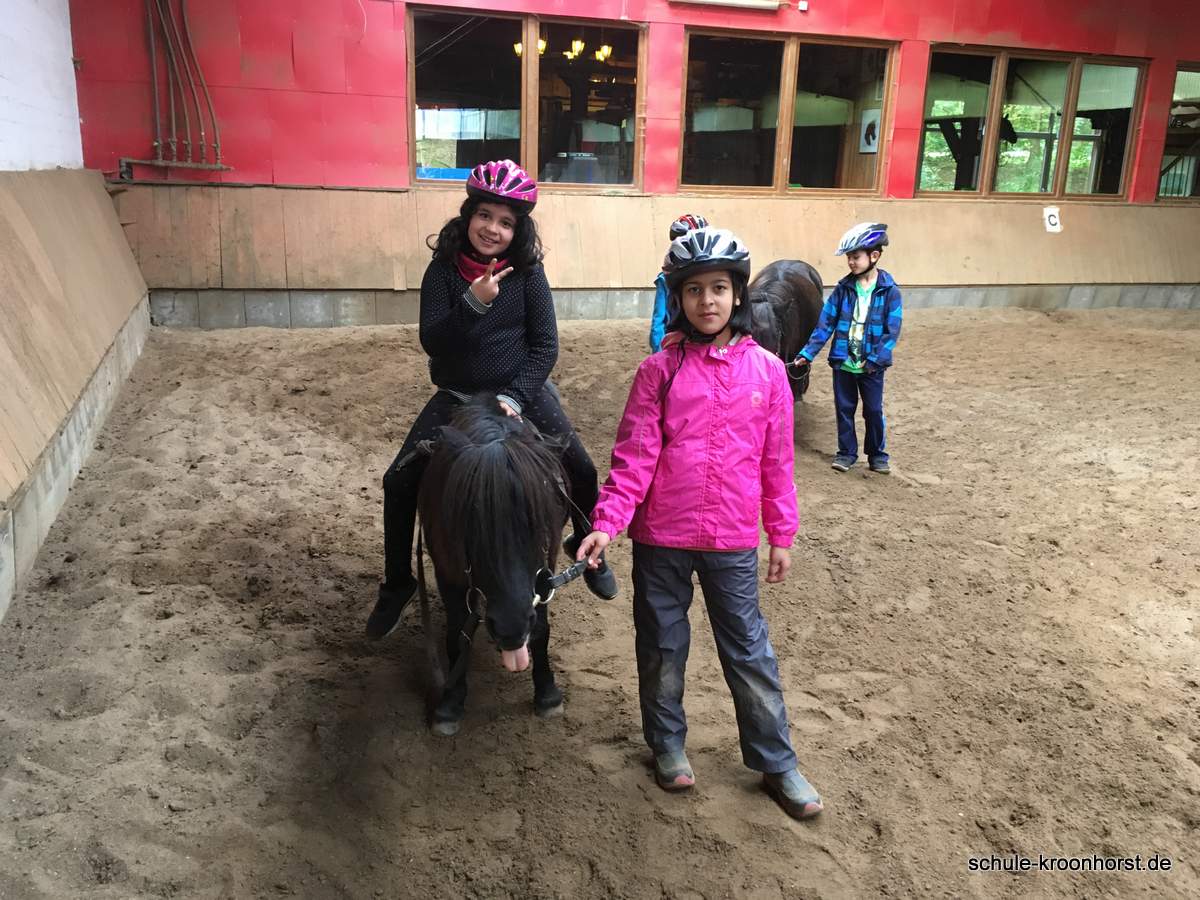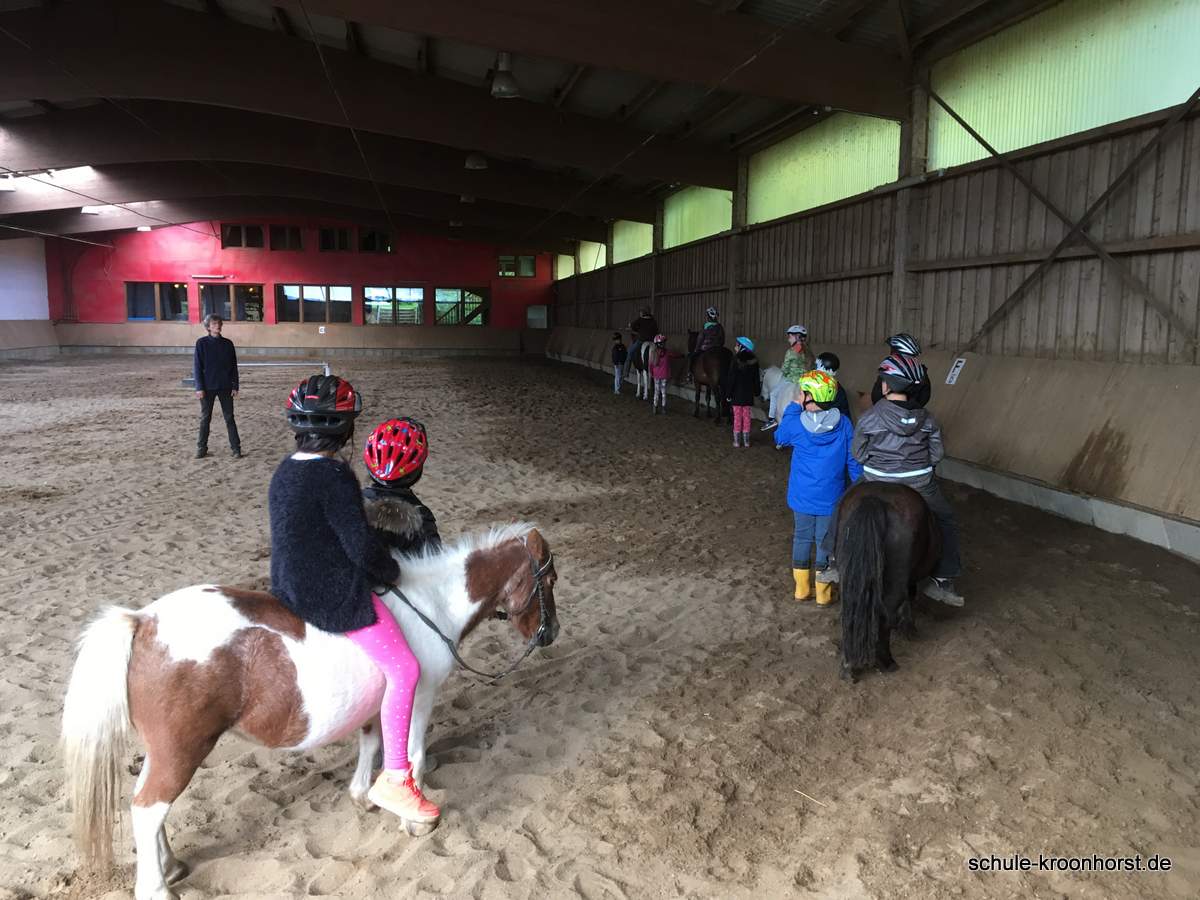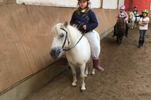 Reiten: Wir waren in einer Halle. Aber erstmal mussten wir die Ponys putzen. Dann waren wir in einem Wald. Da waren wir mit den Ponys.