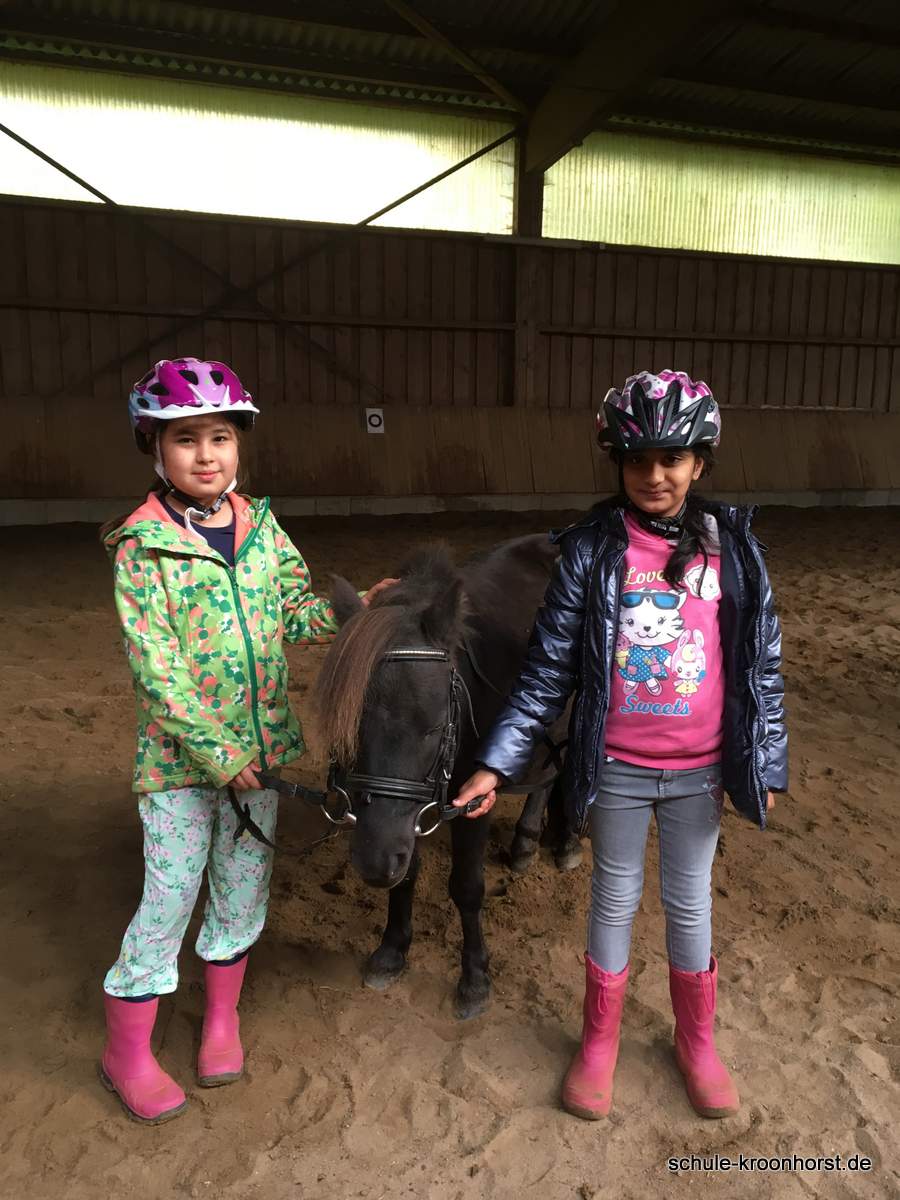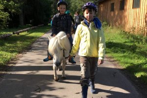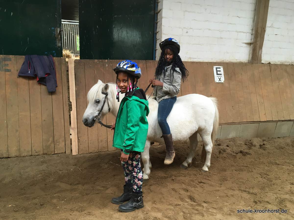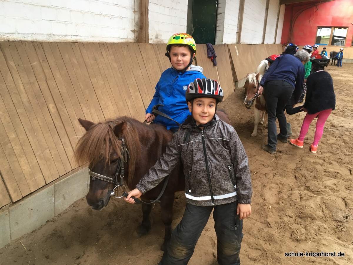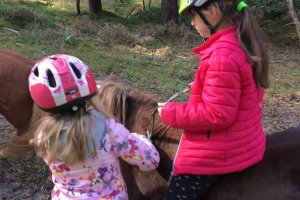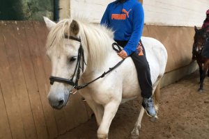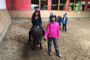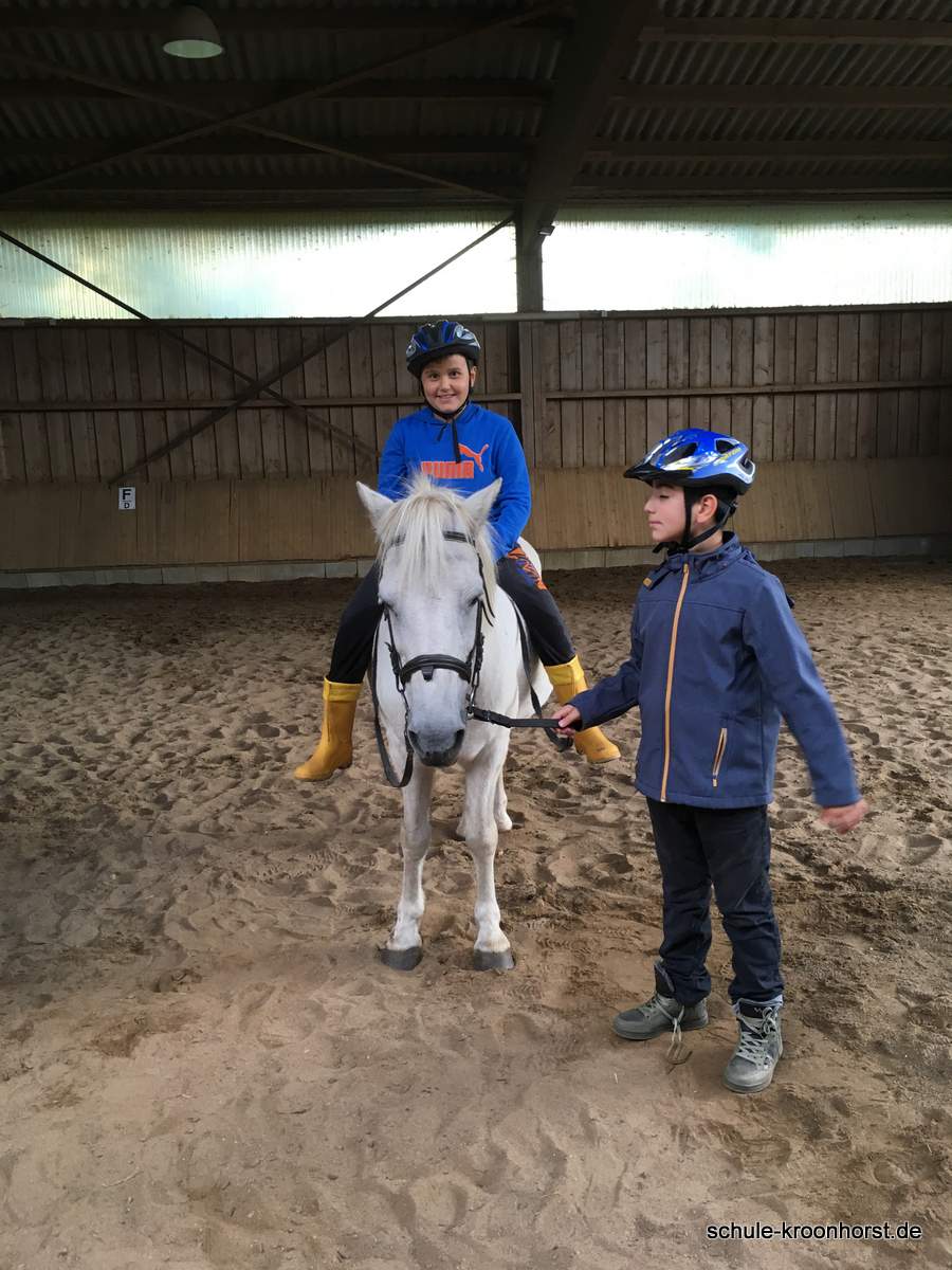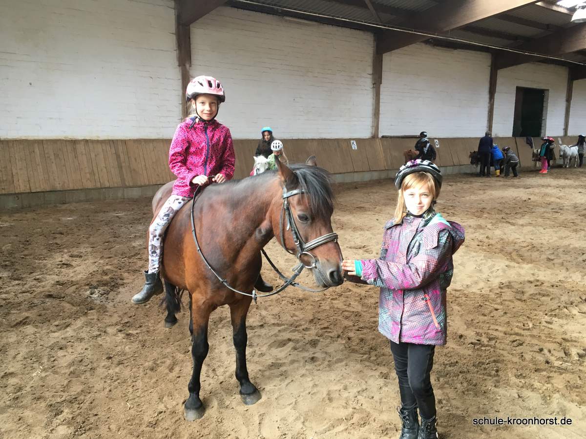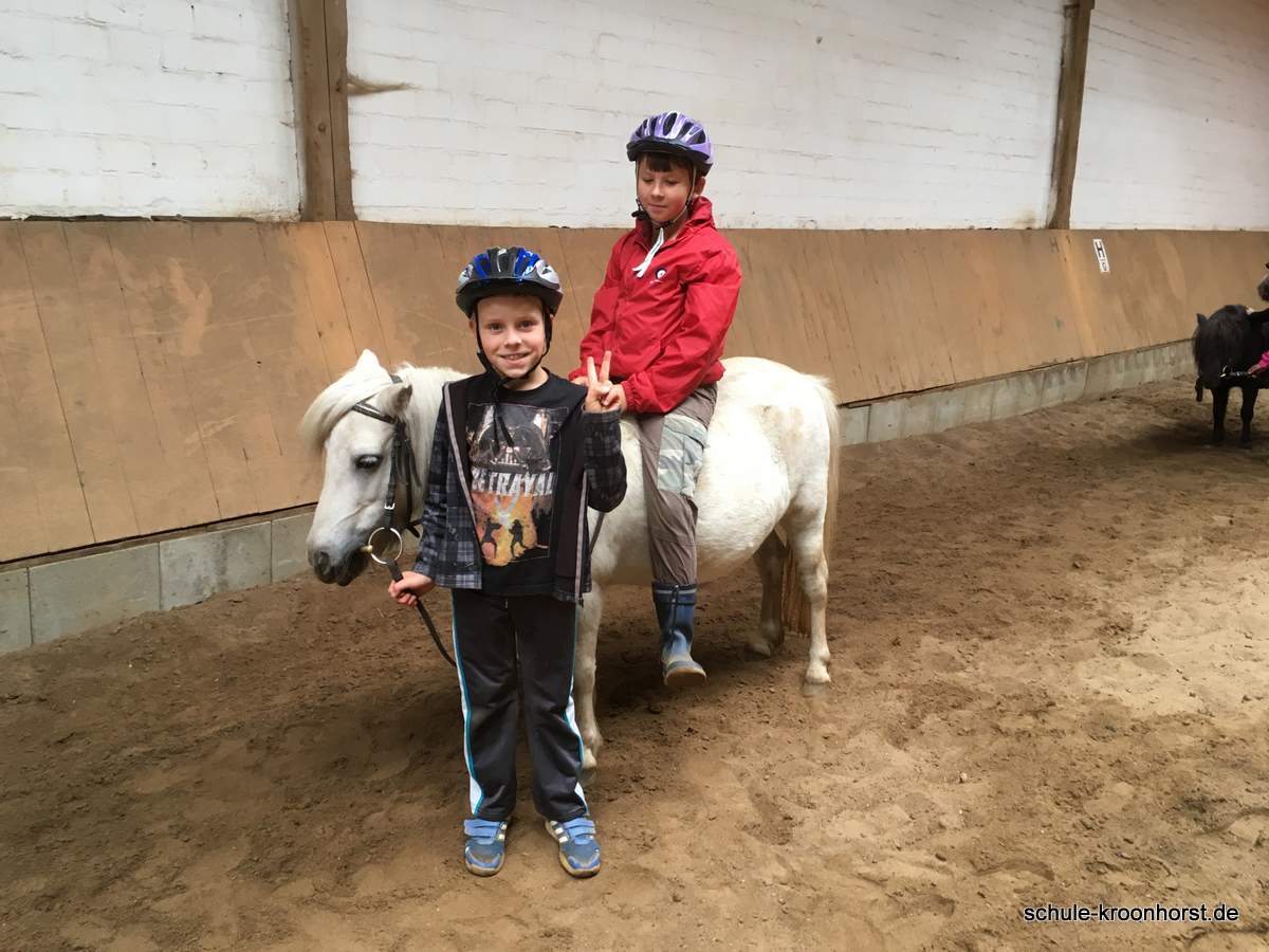 Reiten: Wir waren in einer Halle. Aber erstmal mussten wir die Ponys putzen. Dann waren wir in einem Wald. Da waren wir mit den Ponys.