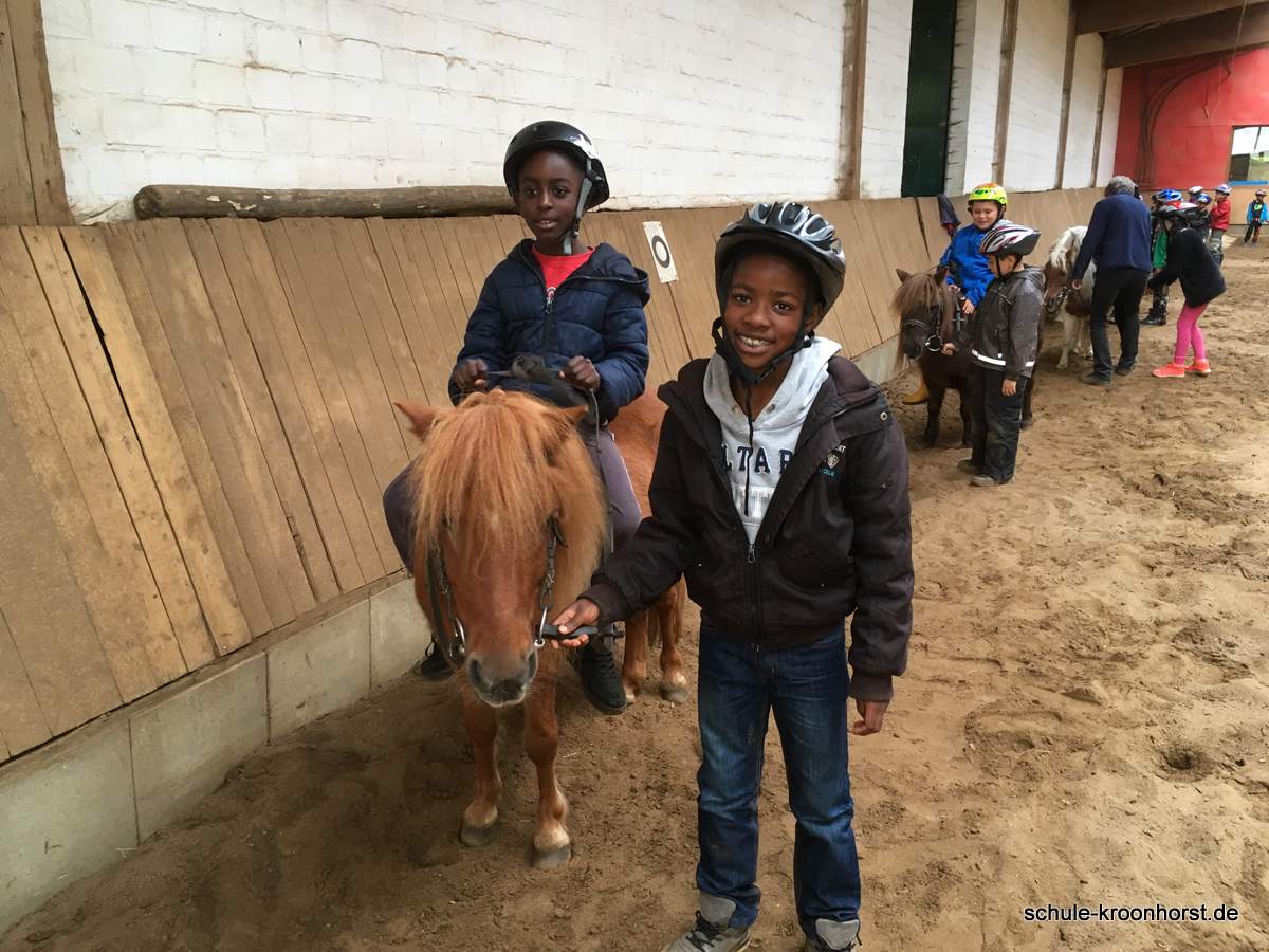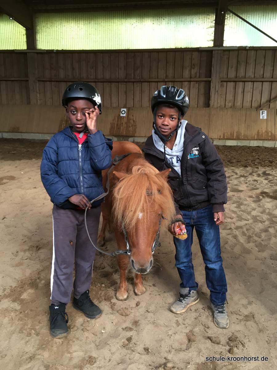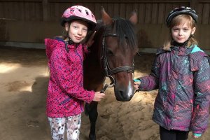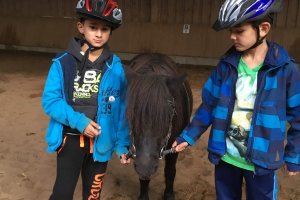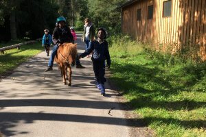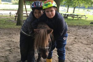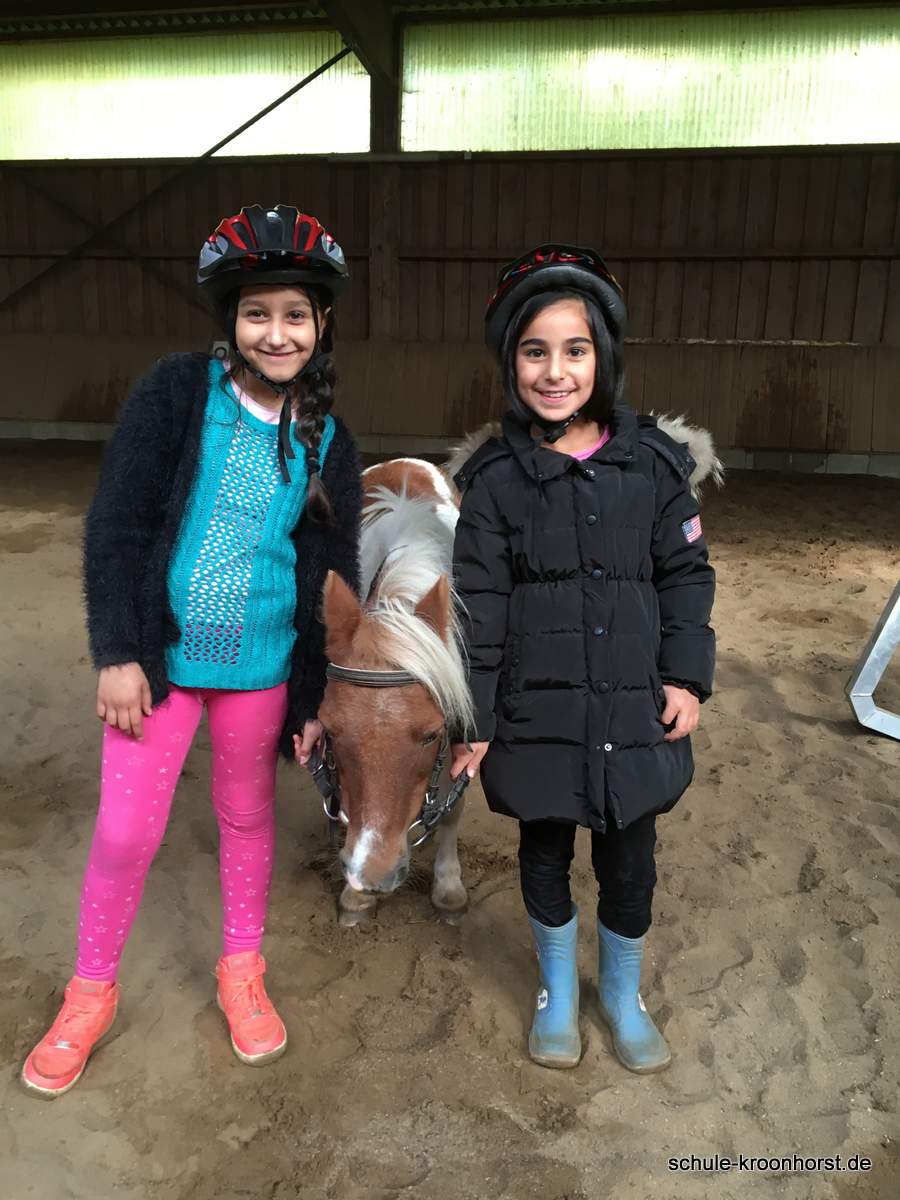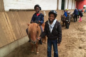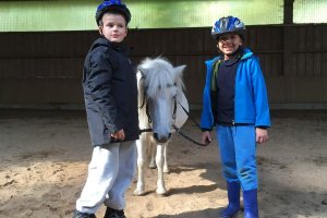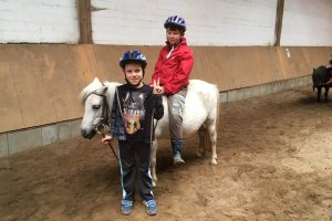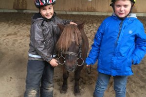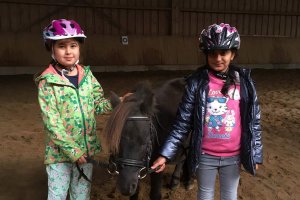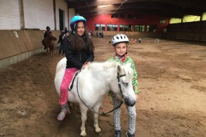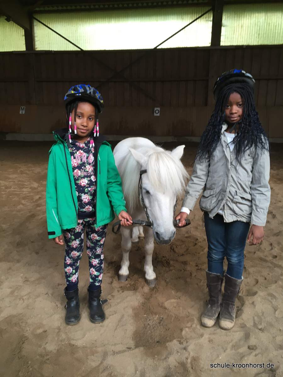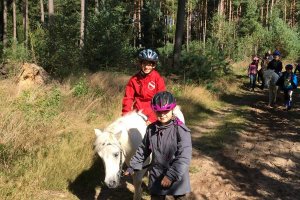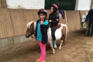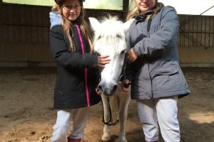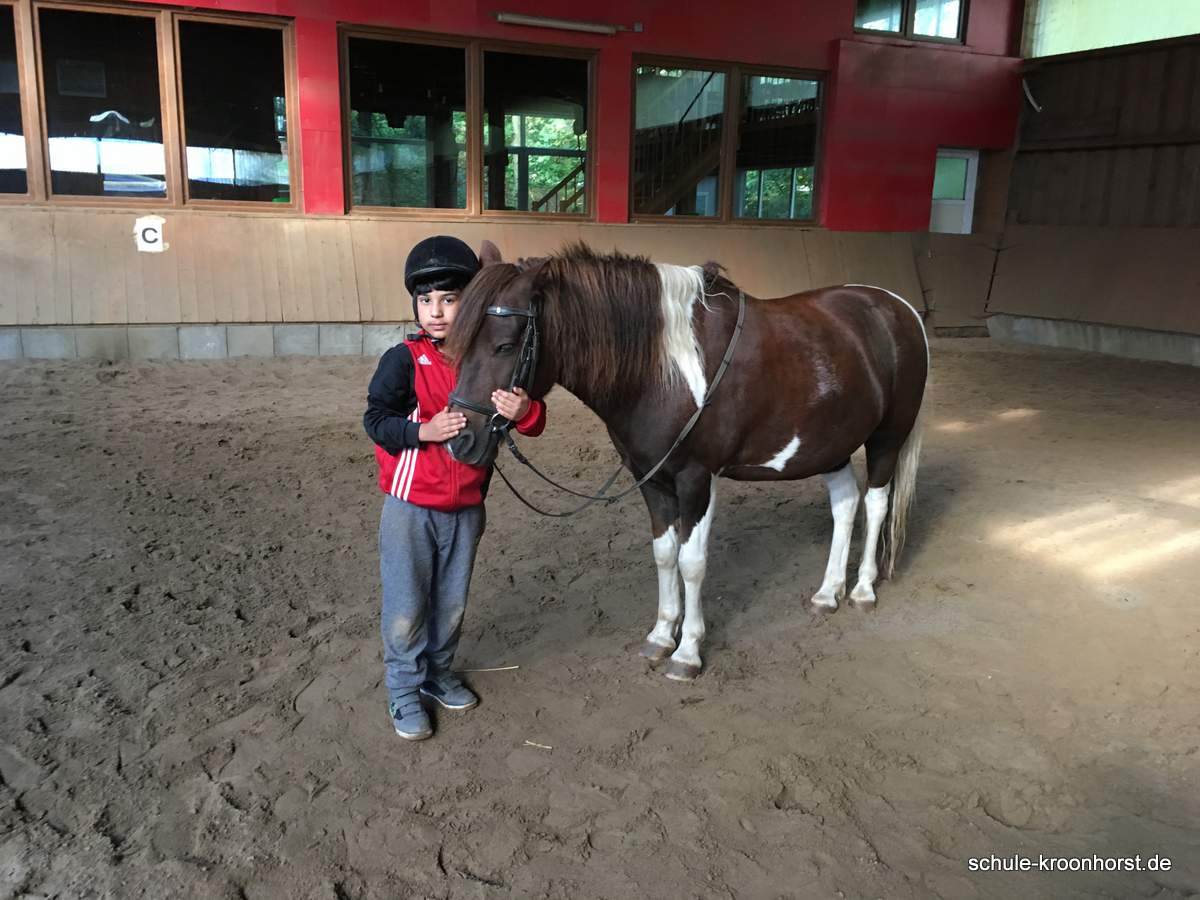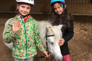 Reiten: Wir waren in einer Halle. Aber erstmal mussten wir die Ponys putzen. Dann waren wir in einem Wald. Da waren wir mit den Ponys.
