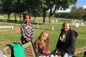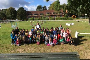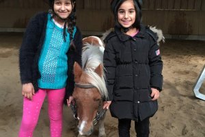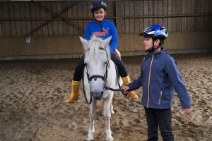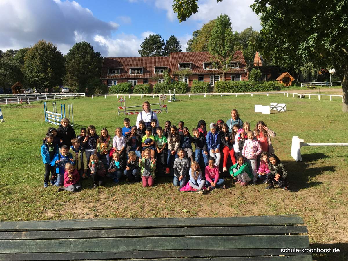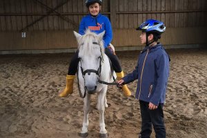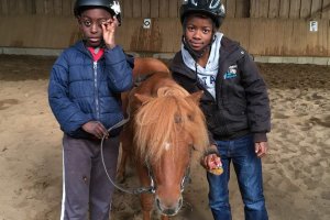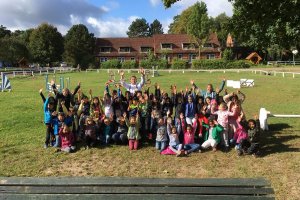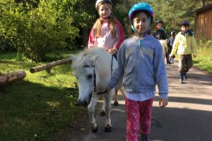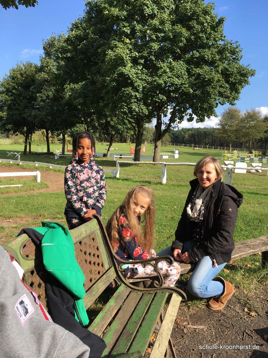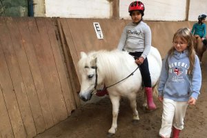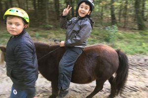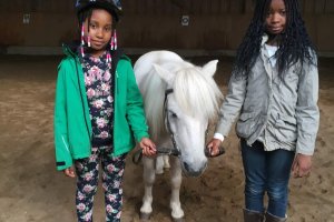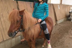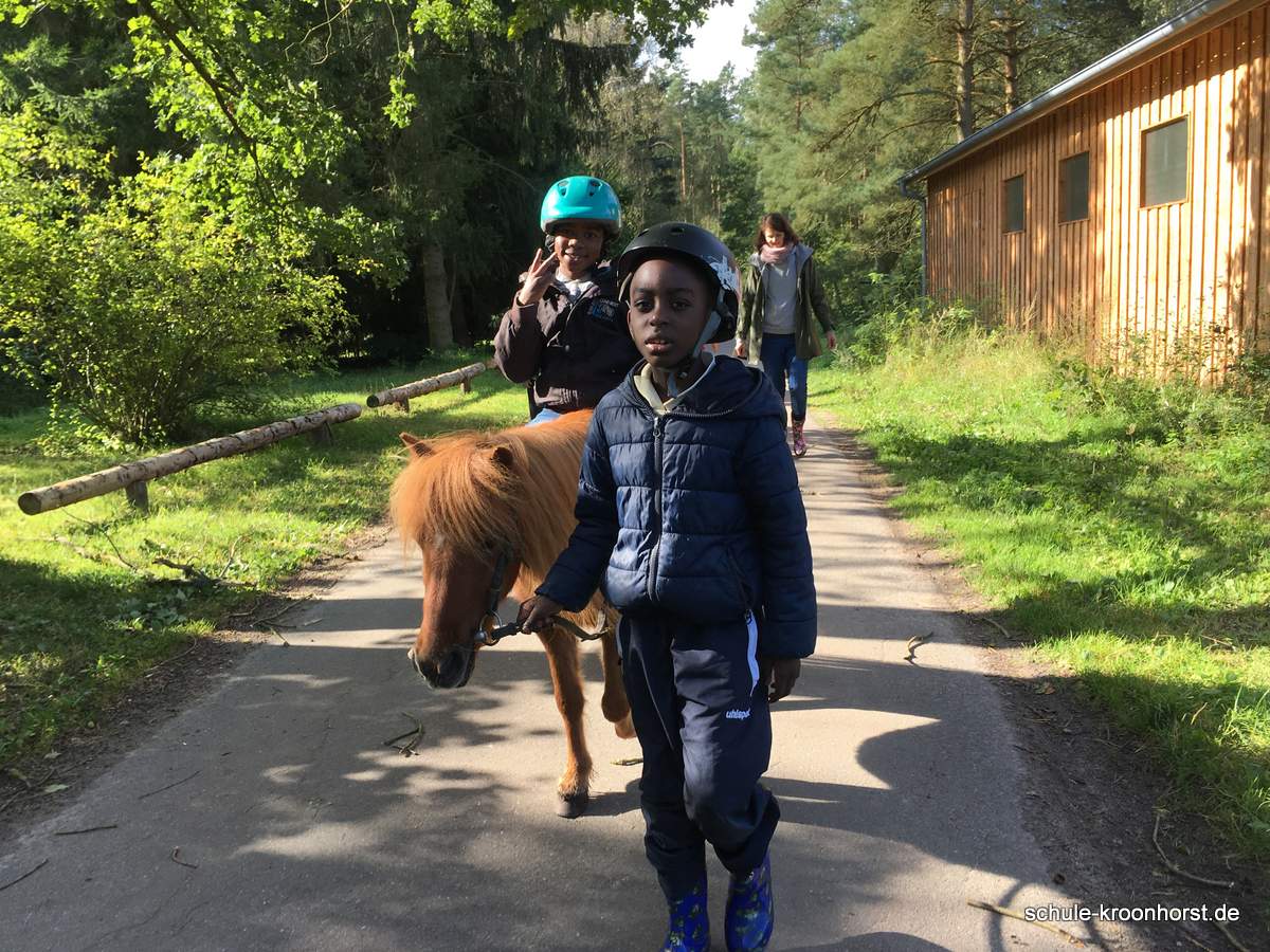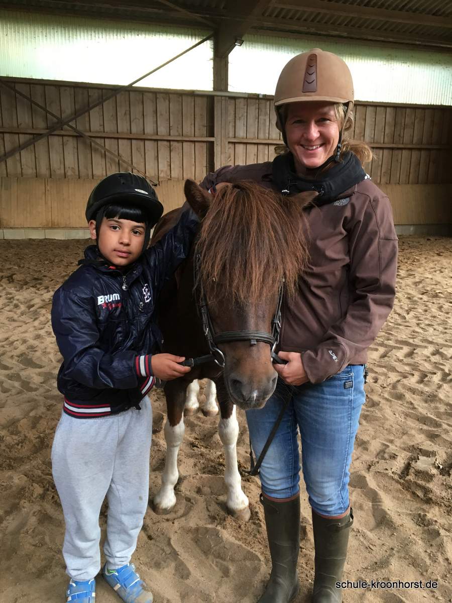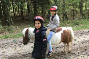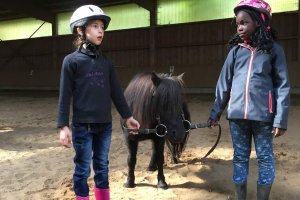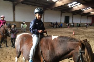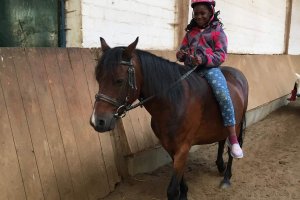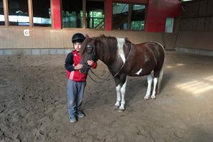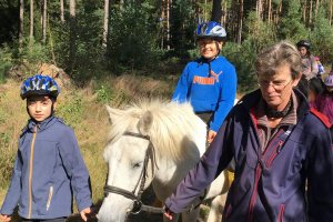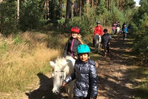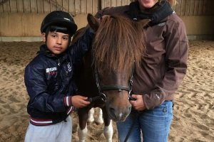Reiten: Wir waren in einer Halle. Aber erstmal mussten wir die Ponys putzen. Dann waren wir in einem Wald. Da waren wir mit den Ponys.