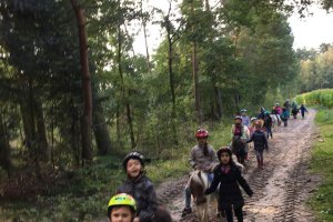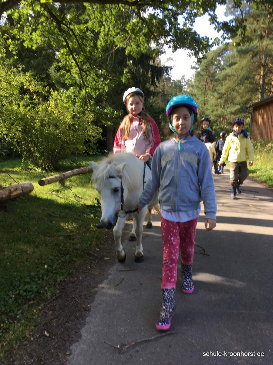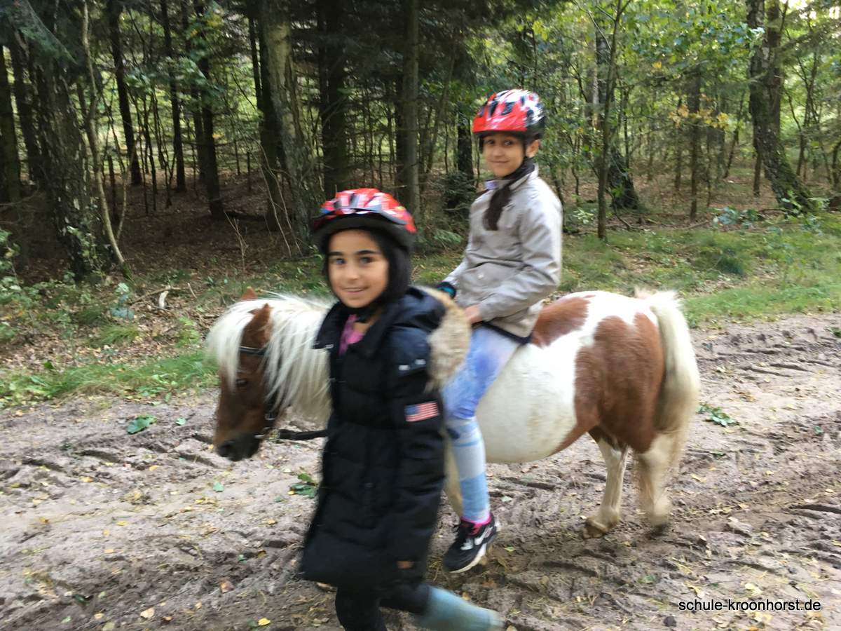 Wir sind alleine geritten, aber davor haben wir die Ponys geputzt. Danach sind wir zum Wald geritten.