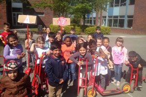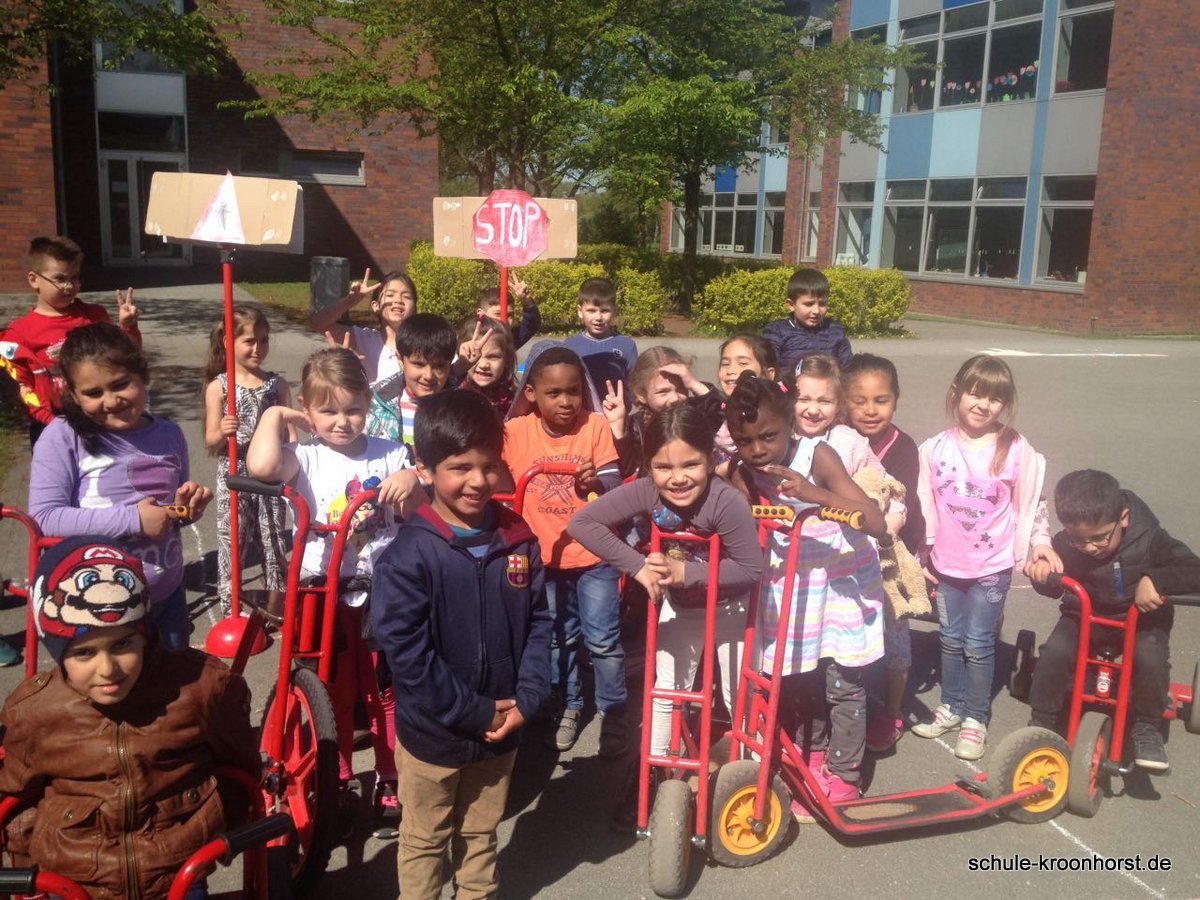 Im Rahmen dessen haben die Schüler zunächst einige Verkehrsschilder kennengelernt. Mit selbst gebastelten und bemalten Schildern, konnten die Kinder zeigen, dass sie diese in einem Parcours, bestehend aus Hütchen und mit Kreide aufgemalten Straßen wiedererkennen und sich entsprechend verhalten können. Am Ende erhielt jeder Teilnehmer seinen eigenen Fahrzeugführerschein.