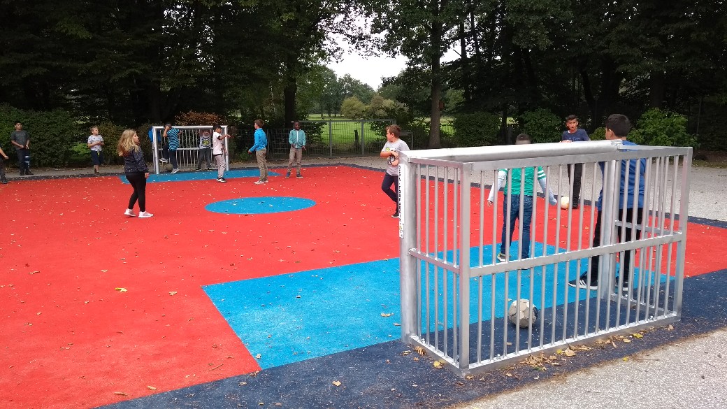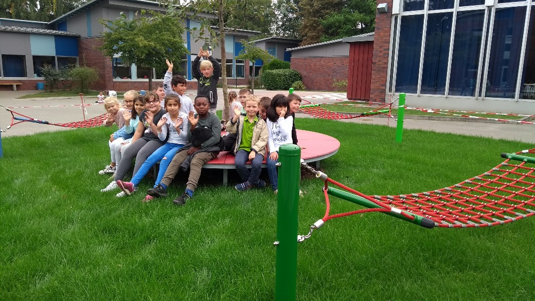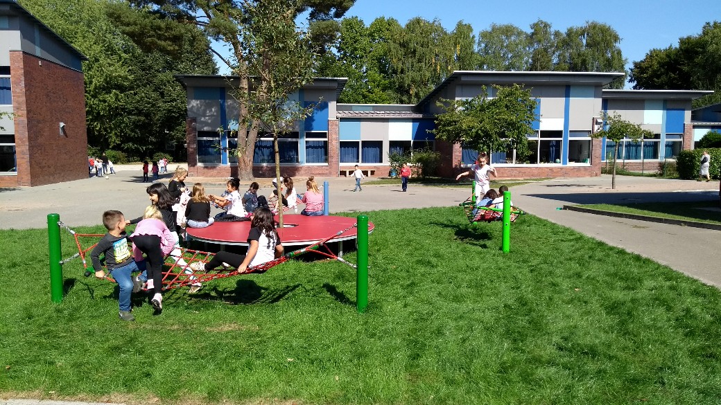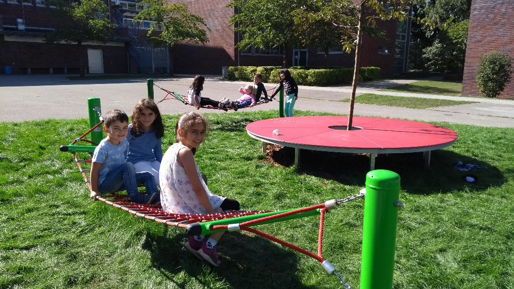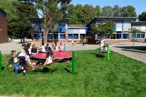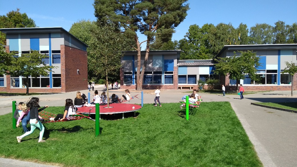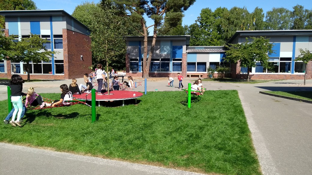 Eine grüne Oase ist im Zentrum des Schulhofes entstanden. Auf den coolen Hängematten und dem Rumdumsitzbaum kann man sich so richtig entspannen. Auch des neue Fußballfeld mit dem Kunstbelag ist der Renner. Damit noch mehr junge Fußballspieler in den Pausen und Angeboten blessurenfrei spielen können, wurde gleich neben dem alten Feld nun ein weiteres Feld mit tollen großen Toren gebaut.