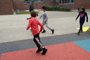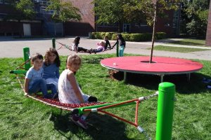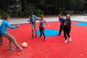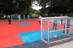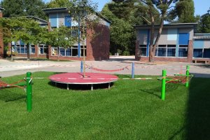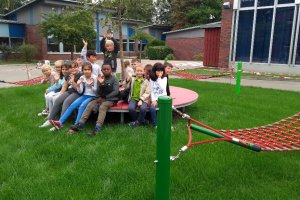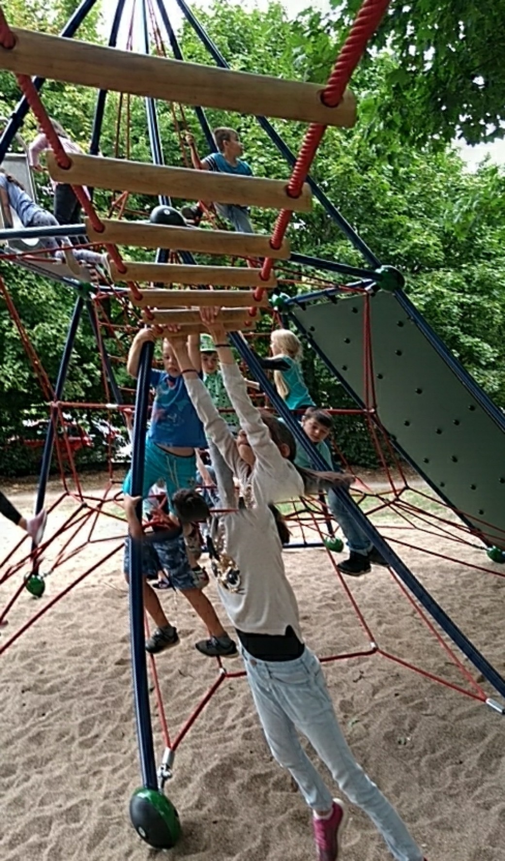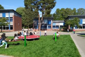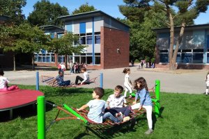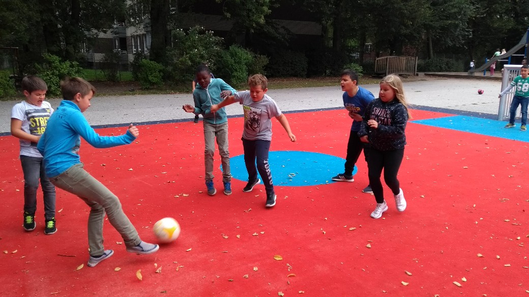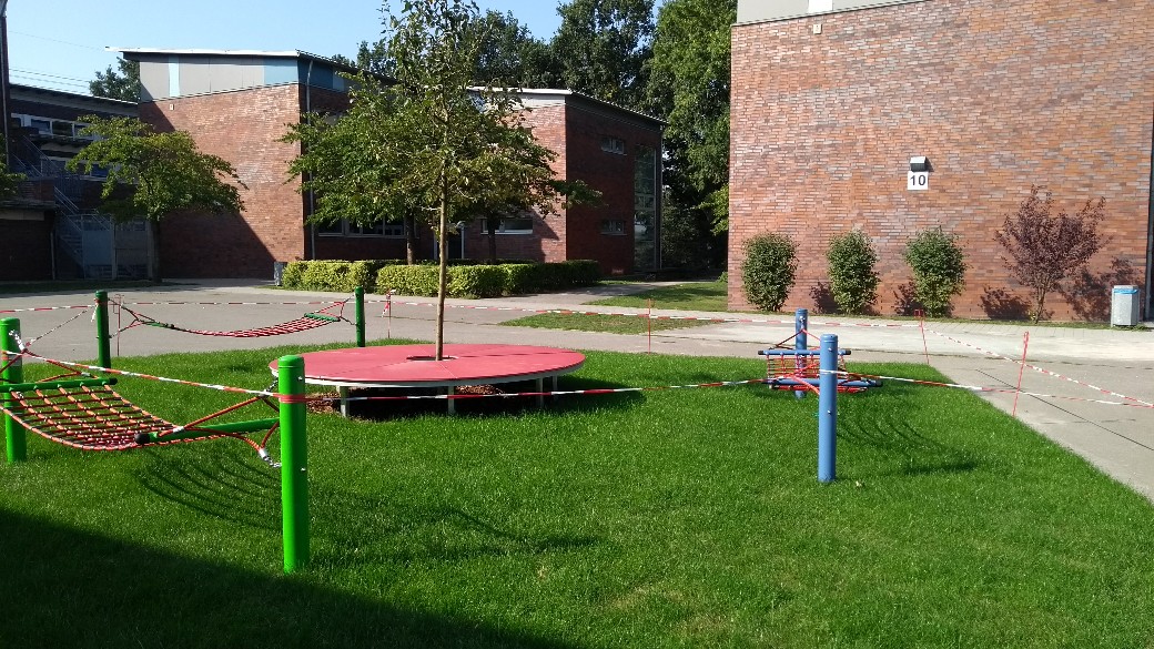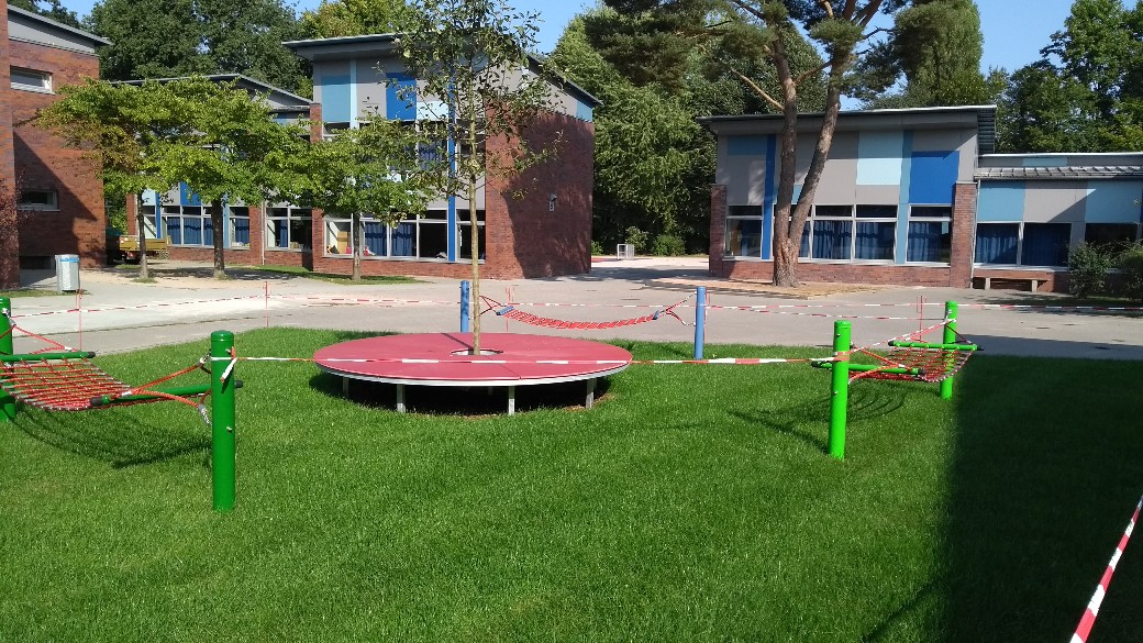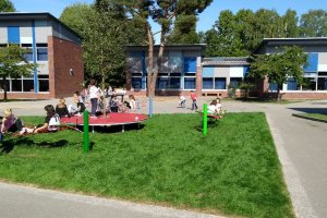 Eine grüne Oase ist im Zentrum des Schulhofes entstanden. Auf den coolen Hängematten und dem Rumdumsitzbaum kann man sich so richtig entspannen. Auch des neue Fußballfeld mit dem Kunstbelag ist der Renner. Damit noch mehr junge Fußballspieler in den Pausen und Angeboten blessurenfrei spielen können, wurde gleich neben dem alten Feld nun ein weiteres Feld mit tollen großen Toren gebaut.