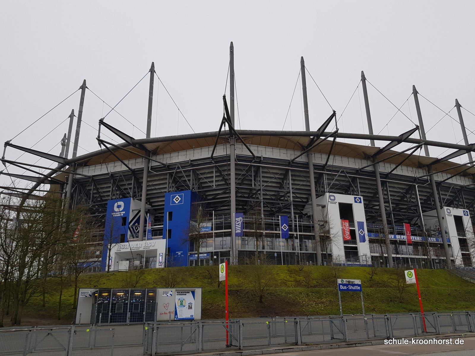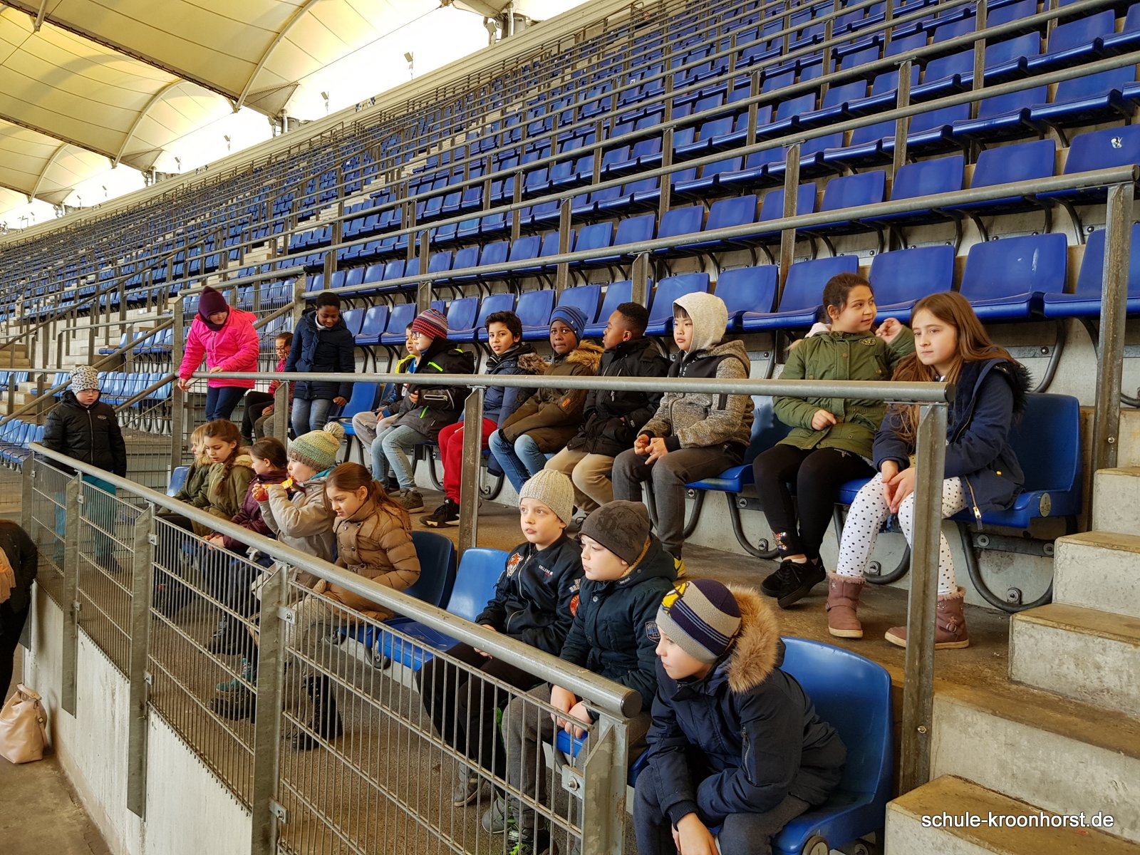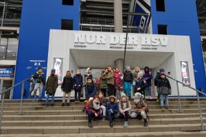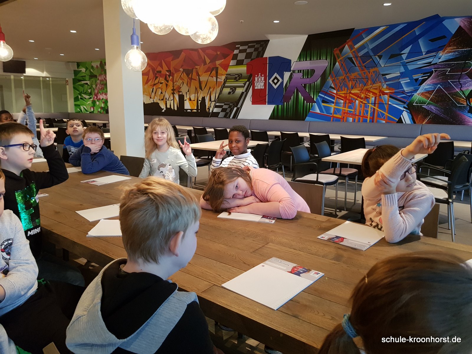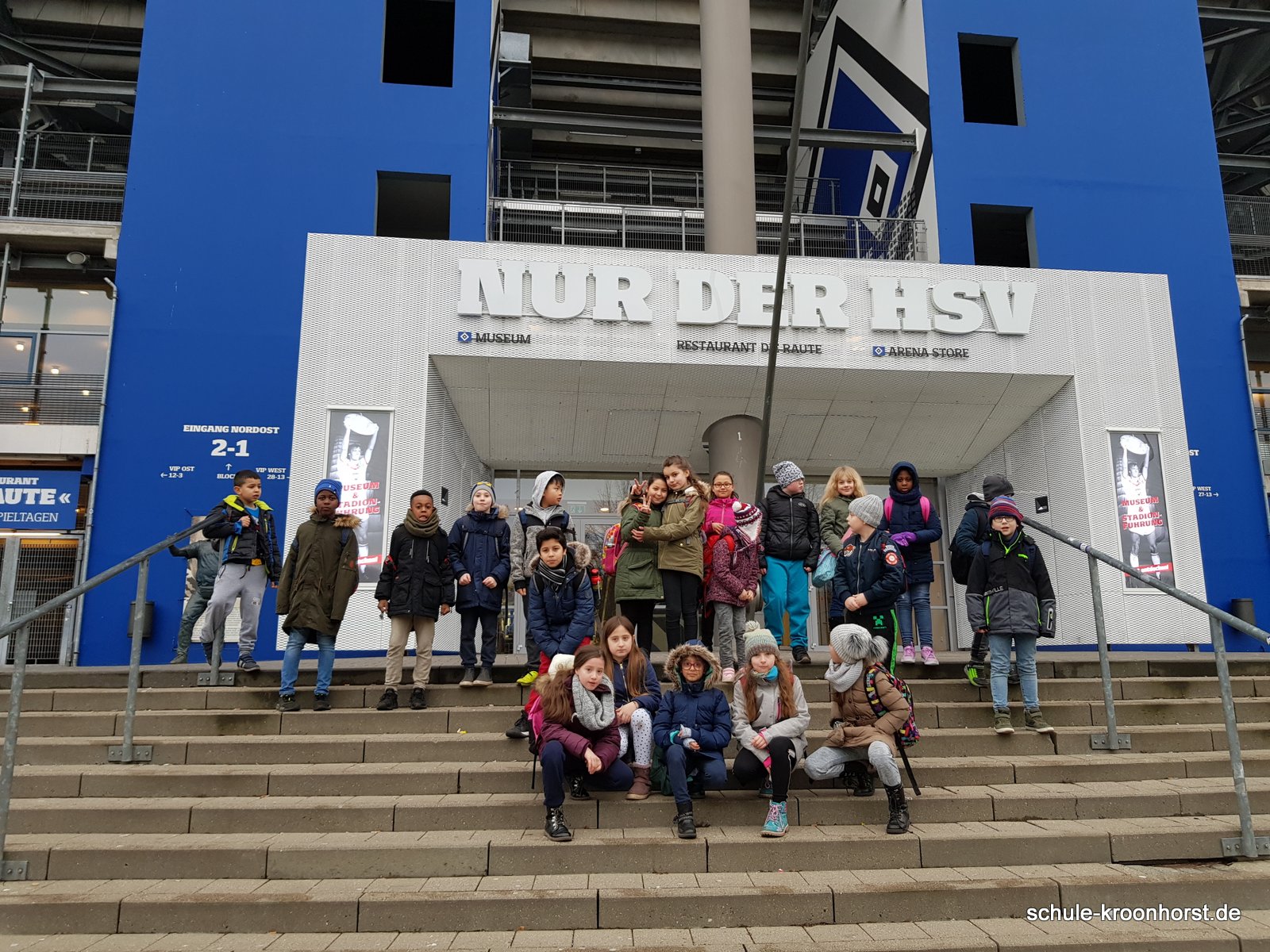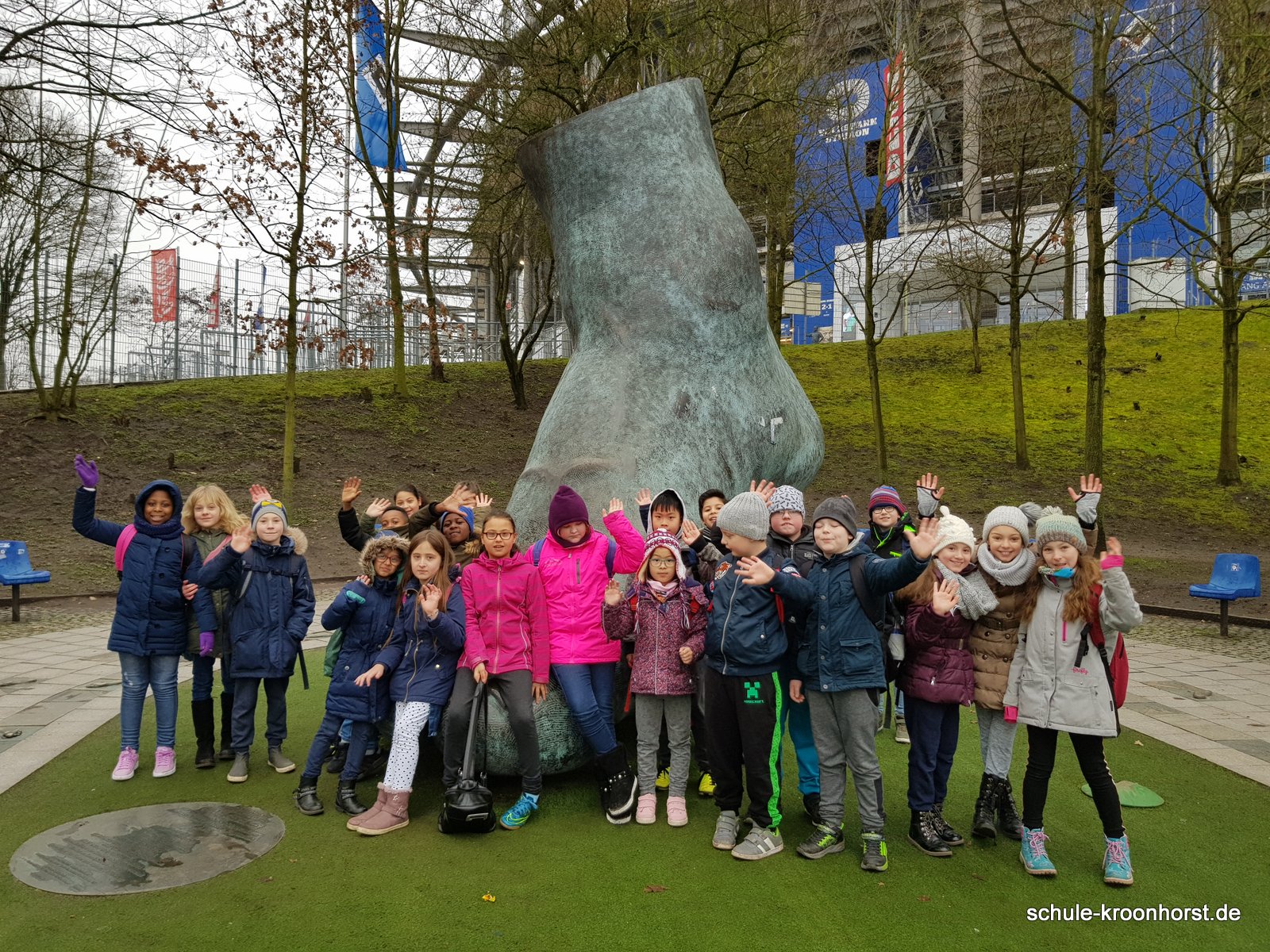 Am Freitag, den 22.2.2019 waren wir mit sieben Kindern aus der 3c und 15 aus der 3a, sowie Frau Albrecht, Frau Ernst und Frau Hegener beim Hamburger HSV. Wir sind mit dem Bus gefahren. Am Anfang haben wir den riesigen Fuß von Uwe Seeler gesehen. Danach mussten wir in der Kälte 10 bis 15 Minuten warten. Dann hat uns Katrin ins HSV Klassenzimmer gebracht.