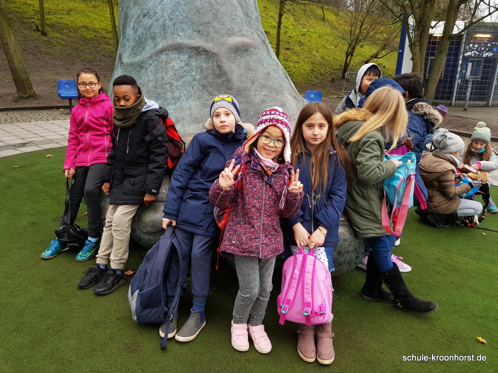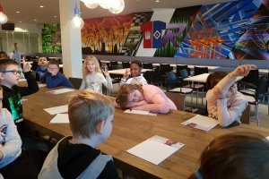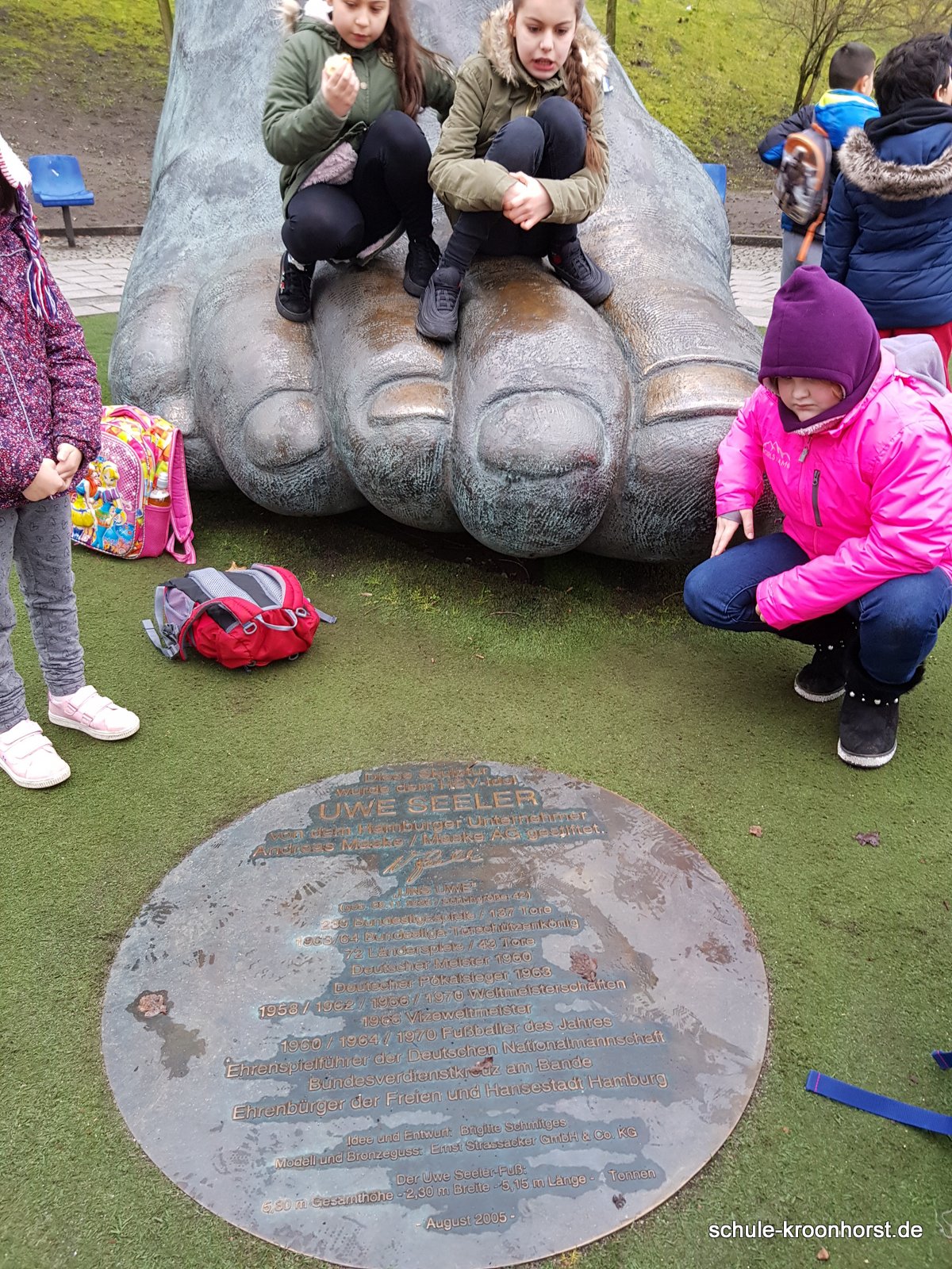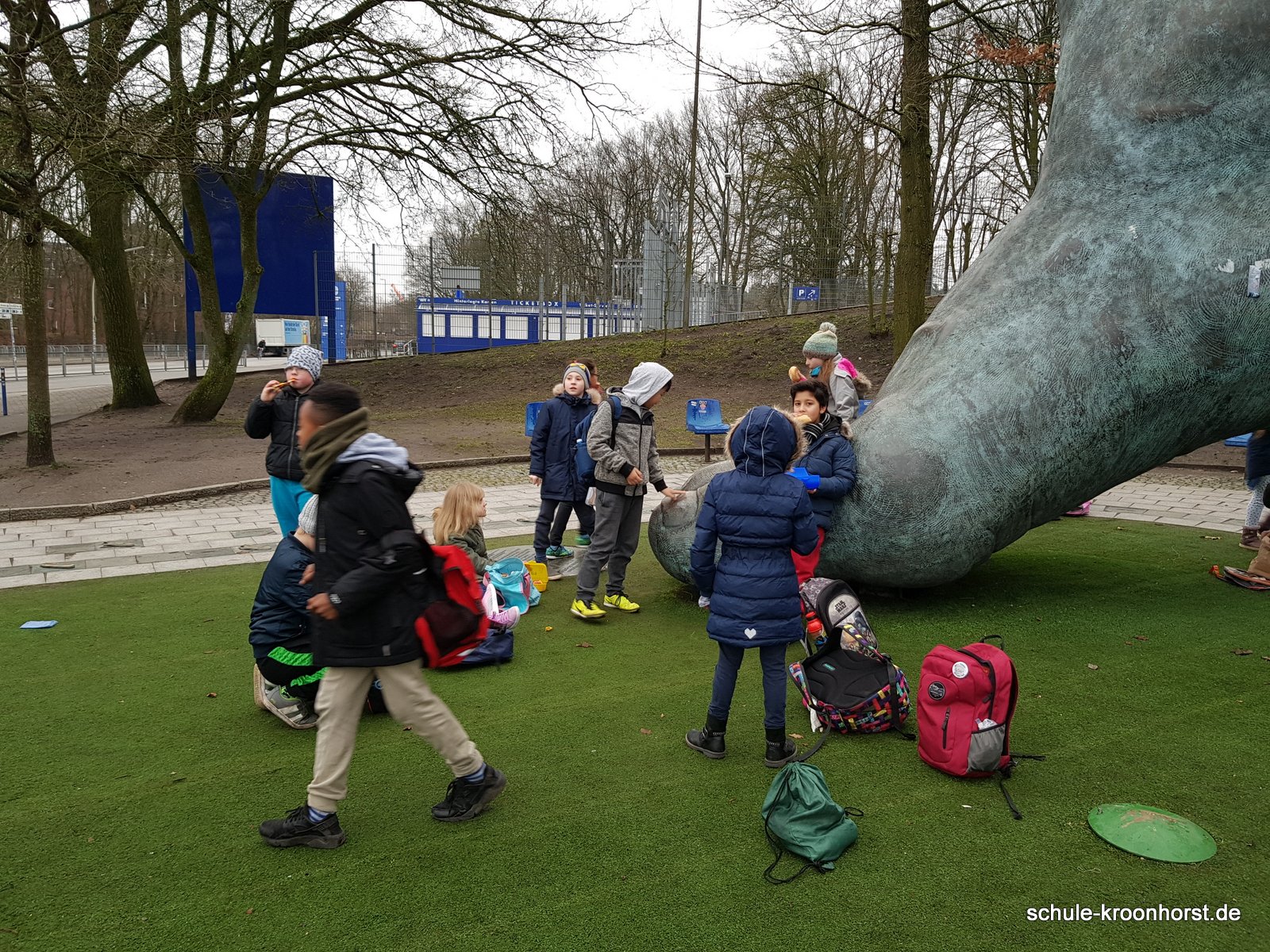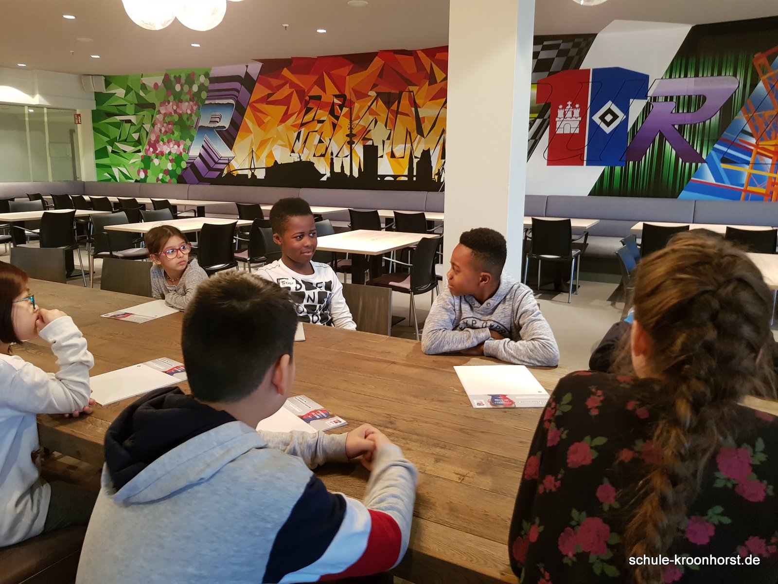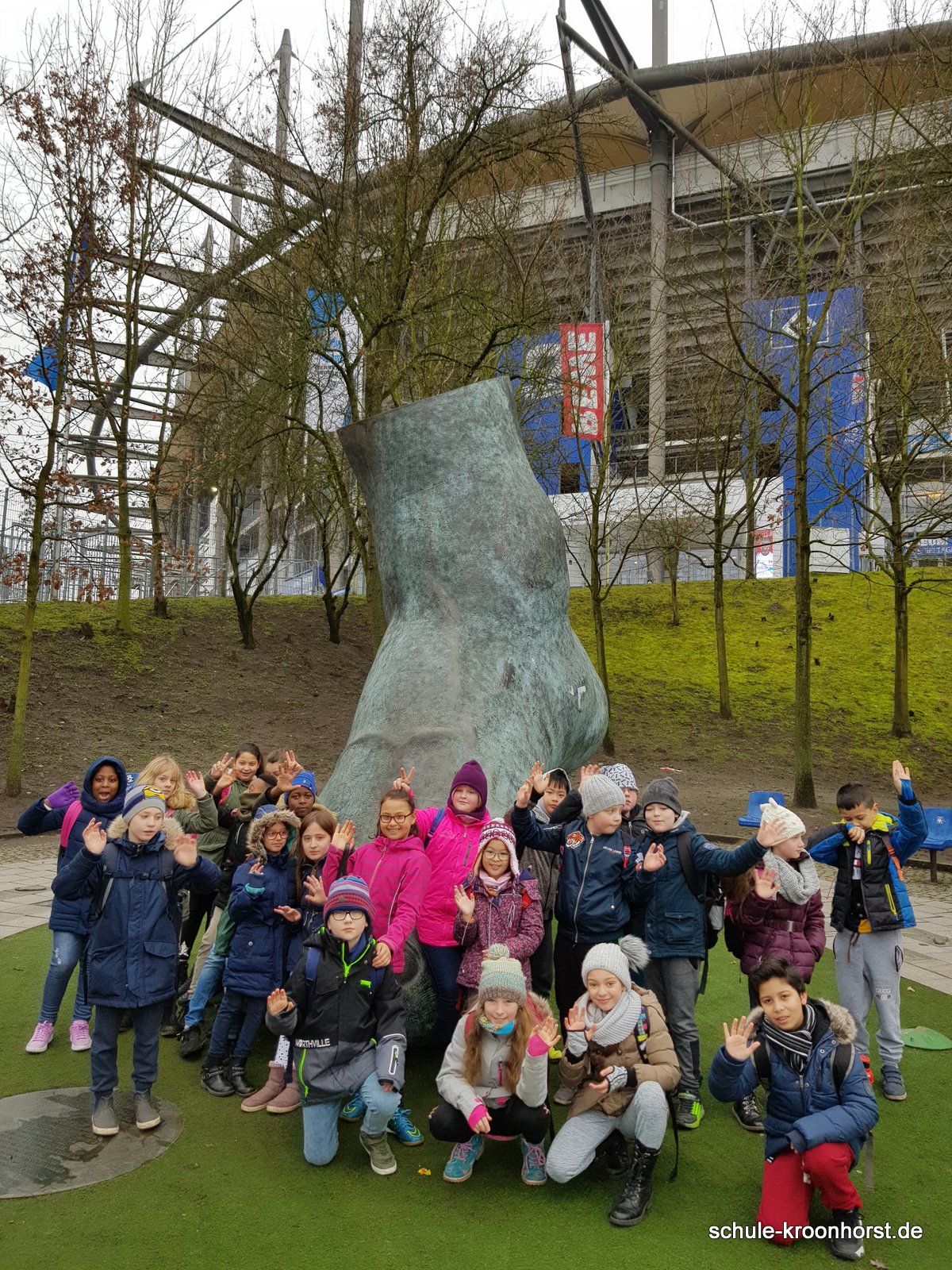 Am Freitag, den 22.2.2019 waren wir mit sieben Kindern aus der 3c und 15 aus der 3a, sowie Frau Albrecht, Frau Ernst und Frau Hegener beim Hamburger HSV. Wir sind mit dem Bus gefahren. Am Anfang haben wir den riesigen Fuß von Uwe Seeler gesehen. Danach mussten wir in der Kälte 10 bis 15 Minuten warten. Dann hat uns Katrin ins HSV Klassenzimmer gebracht.