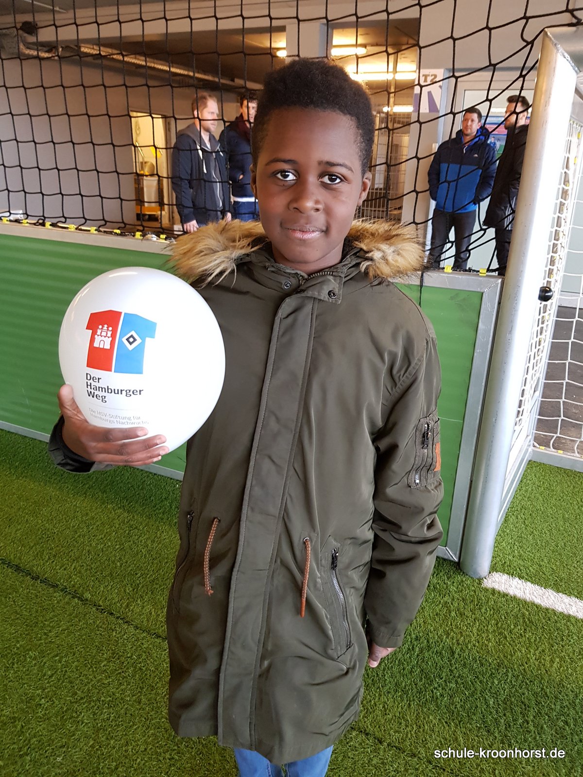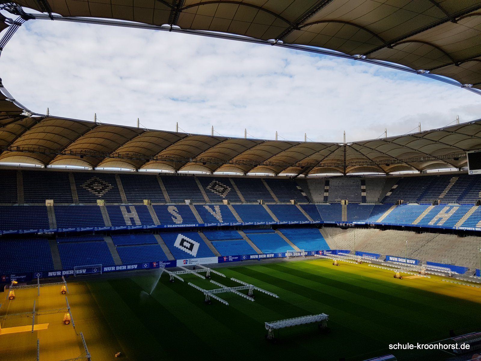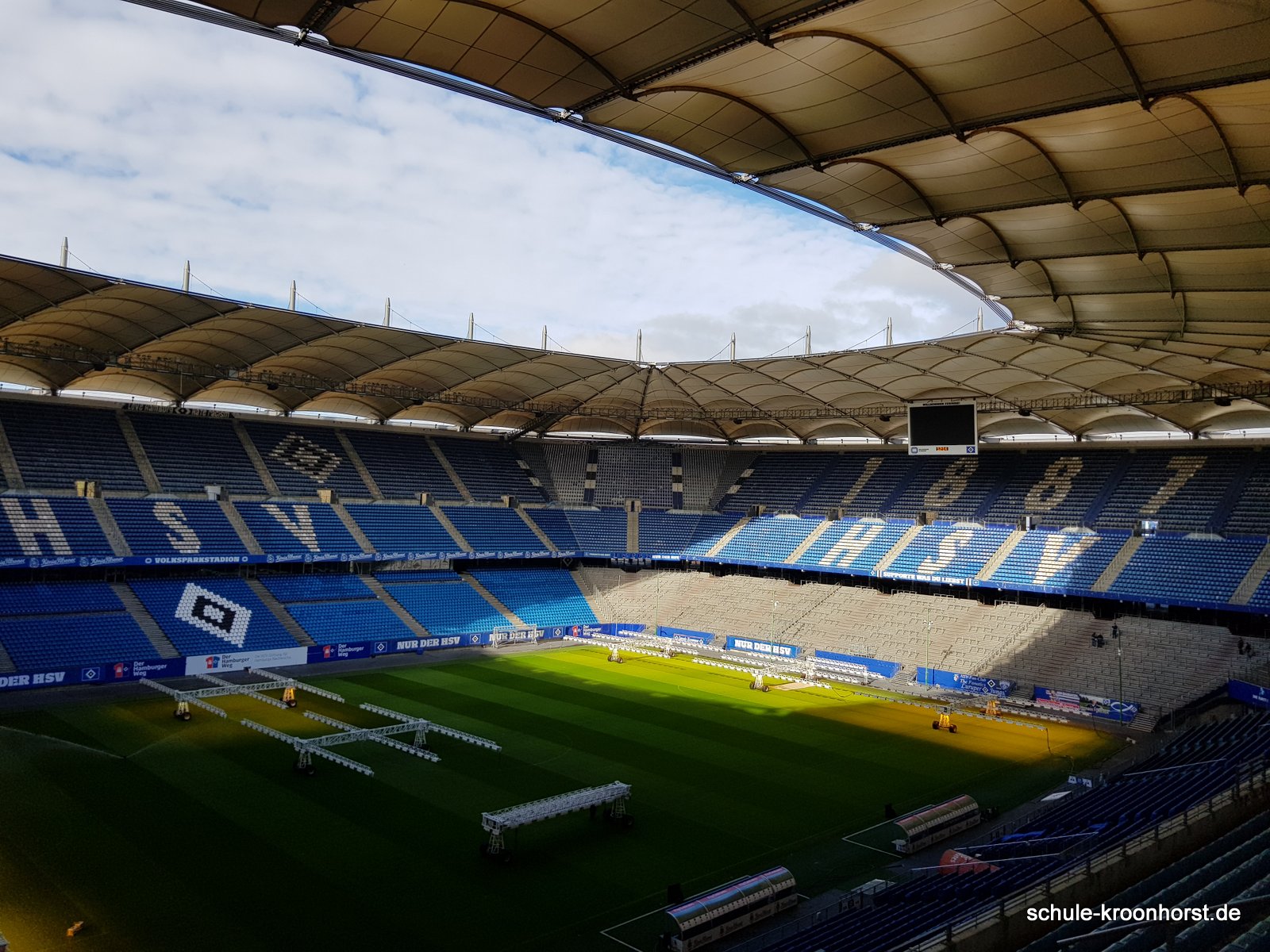 Da haben wir zum Thema „Ich bin stark“ gearbeitet und etwas über Hobbys gelernt und über innere Gefühle. Danach haben wir verschiedene Spiele auf einem kleinen Fußballfeld gespielt, z. B. Ching – Chang – Chong und Spiele mit Luftballons. Anschließend durften wir die Umkleide von den Gästen sehen, wo sich auch schon Messi und die Bayern umgezogen haben. Wir durften aber leider nicht in die Umkleide vom HSV. Wir haben auch den Torwart gesehen. Alle waren wir beim Einlauf ins Stadion. Wir durften uns wie die Richtigen Fußballprofis fühlen und mit der HSV Musik ins Stadion einlaufen. Danach sind wir auf die Tribüne nach ganz, ganz oben gegangen. Wir mussten ganz laut „HSV“ schreien. Da ist ein Echo gekommen. Leider konnten wir nicht mehr beim Training der Profis zusehen, da wir unseren Bus kriegen mussten.