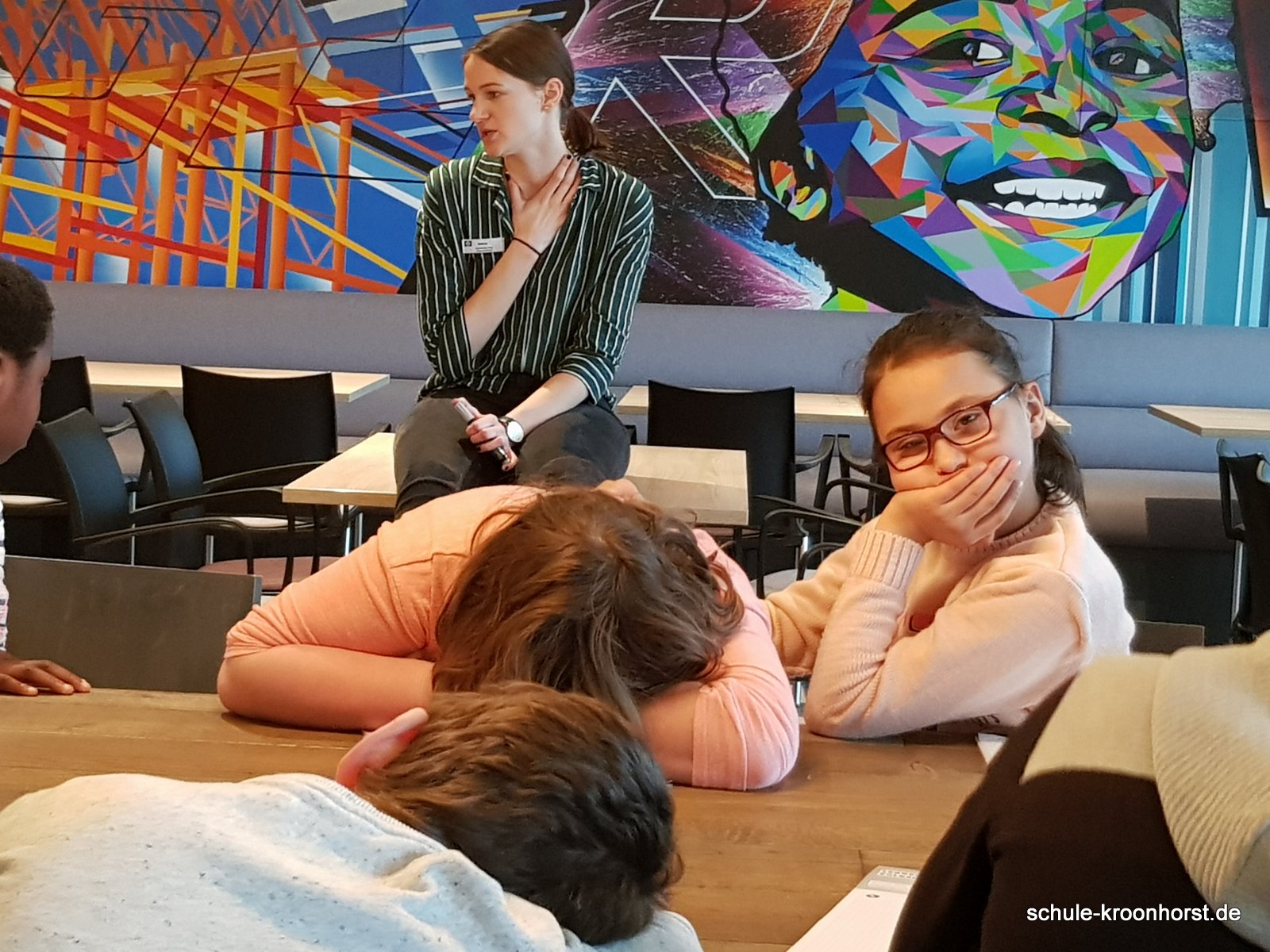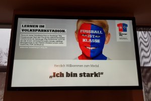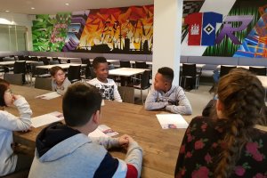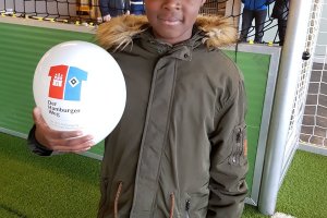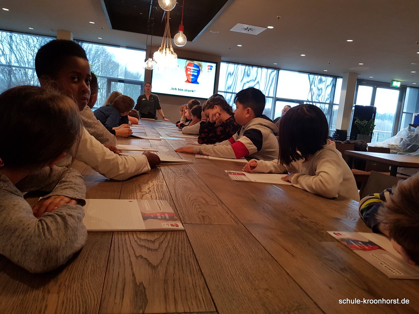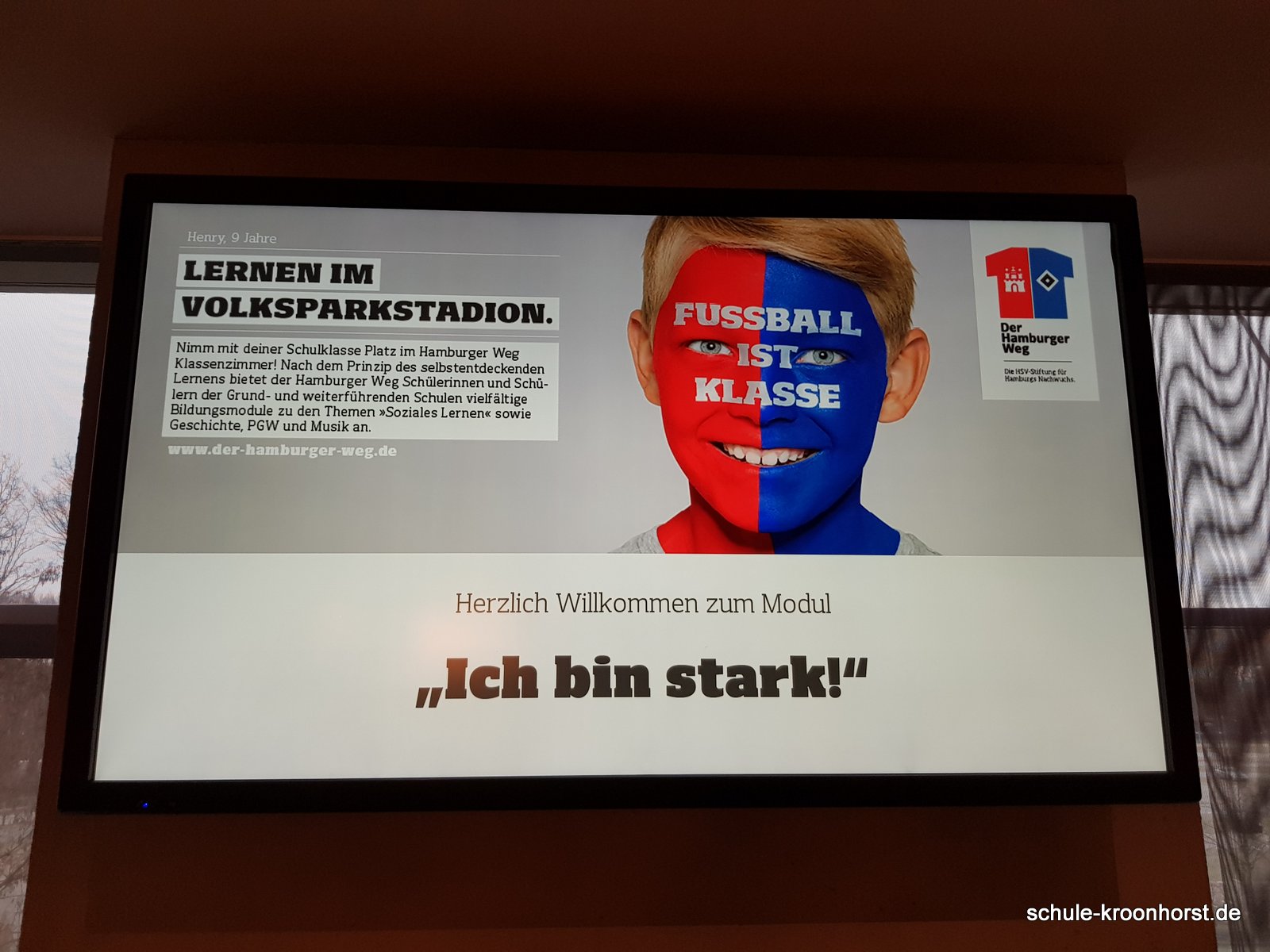 Da haben wir zum Thema „Ich bin stark“ gearbeitet und etwas über Hobbys gelernt und über innere Gefühle. Danach haben wir verschiedene Spiele auf einem kleinen Fußballfeld gespielt, z. B. Ching – Chang – Chong und Spiele mit Luftballons. Anschließend durften wir die Umkleide von den Gästen sehen, wo sich auch schon Messi und die Bayern umgezogen haben. Wir durften aber leider nicht in die Umkleide vom HSV. Wir haben auch den Torwart gesehen. Alle waren wir beim Einlauf ins Stadion. Wir durften uns wie die Richtigen Fußballprofis fühlen und mit der HSV Musik ins Stadion einlaufen. Danach sind wir auf die Tribüne nach ganz, ganz oben gegangen. Wir mussten ganz laut „HSV“ schreien. Da ist ein Echo gekommen. Leider konnten wir nicht mehr beim Training der Profis zusehen, da wir unseren Bus kriegen mussten.