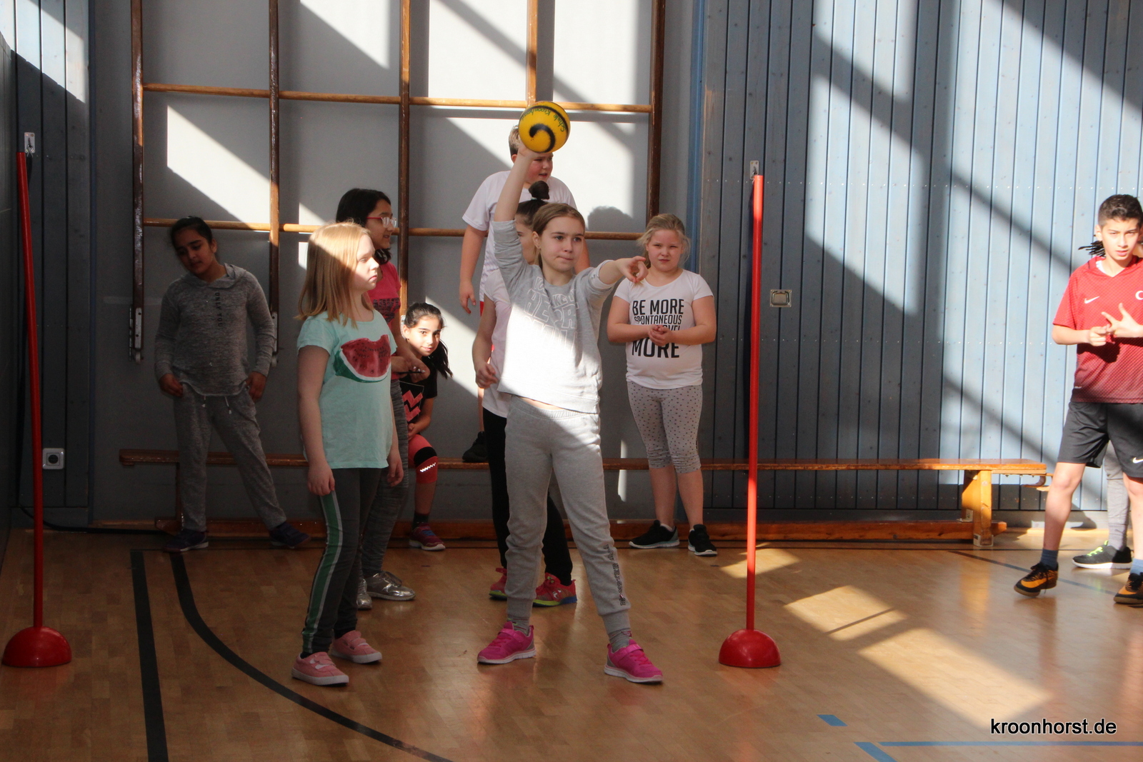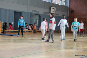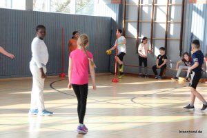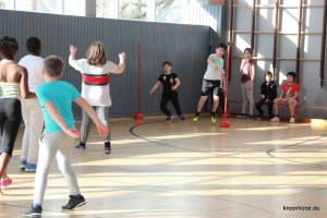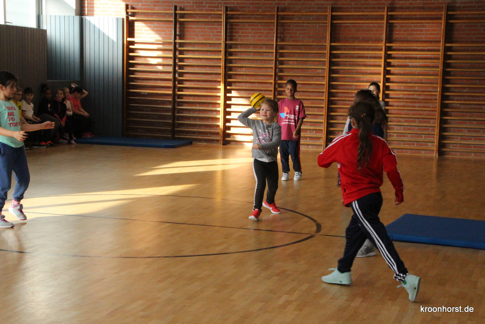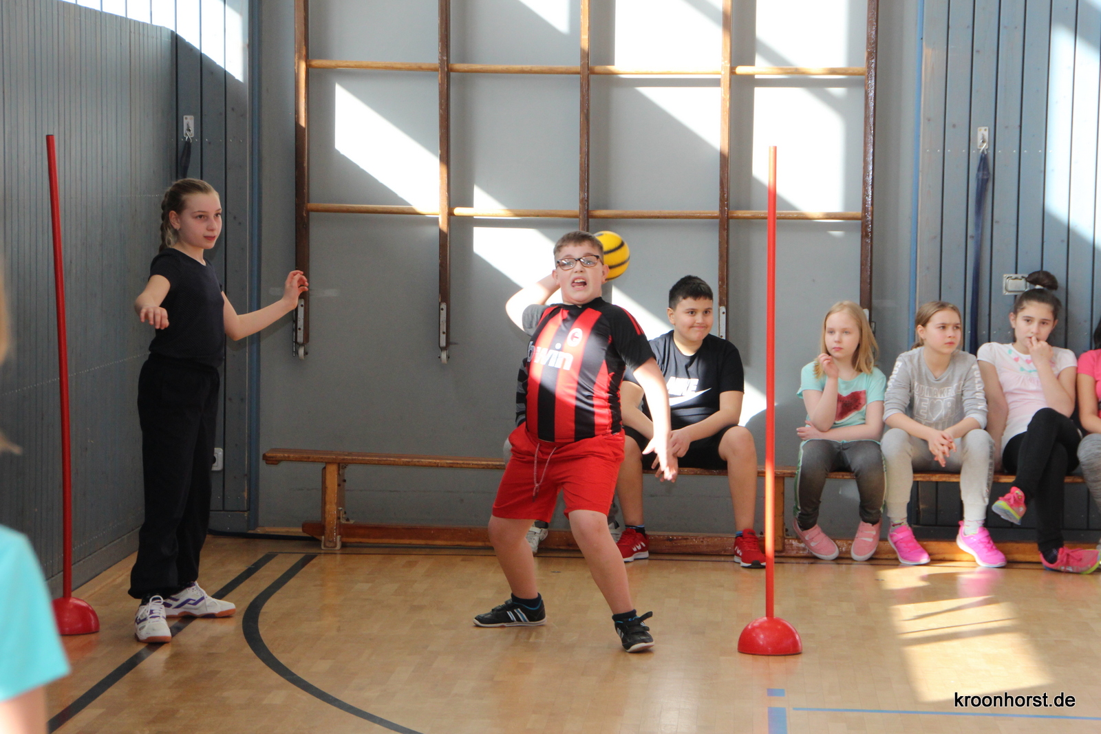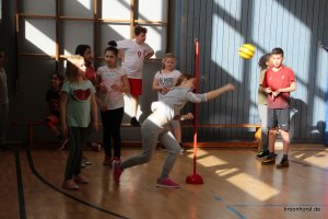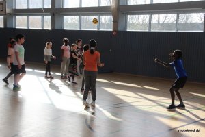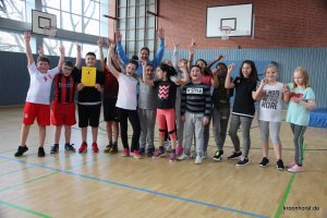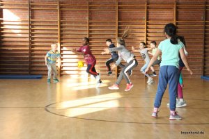 Die Sporttag- Neulinge Mäuse (1a), Pinguine (1b) und Drachen (1c) spielten zuerst "Bänkeball" gegeinander. Bei ihrer ersten Teilnahme wurden sowohl die Jungs als auch die Mädchen in viele Aktionen eingebunden. Die 1a schaffte hierbei die höchste Anzahl an Treffern.