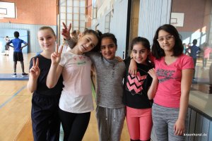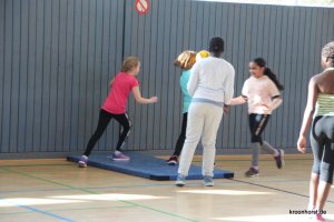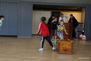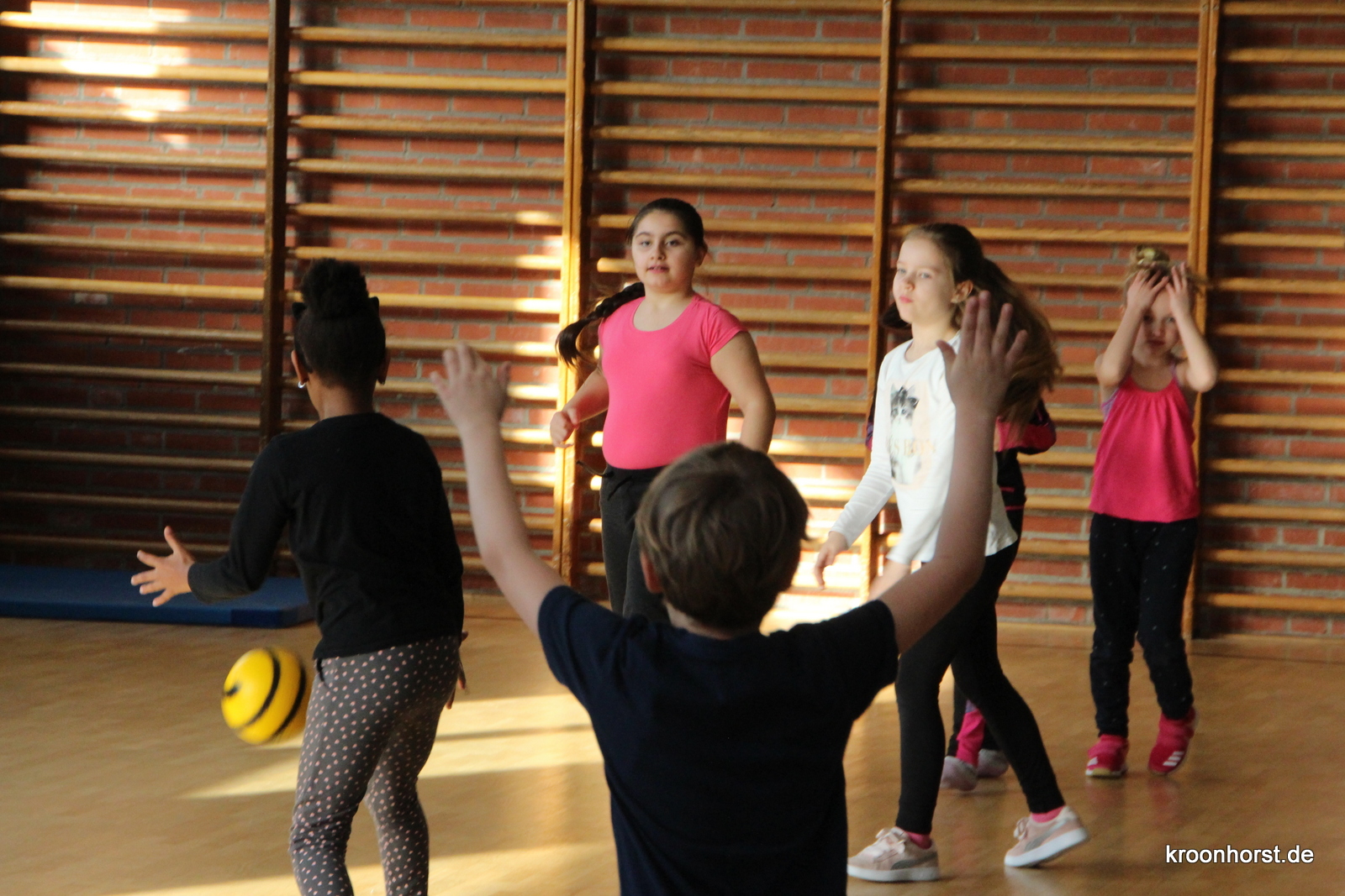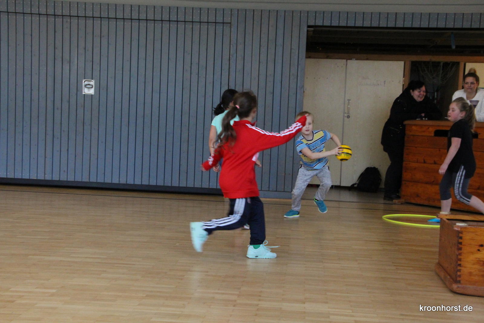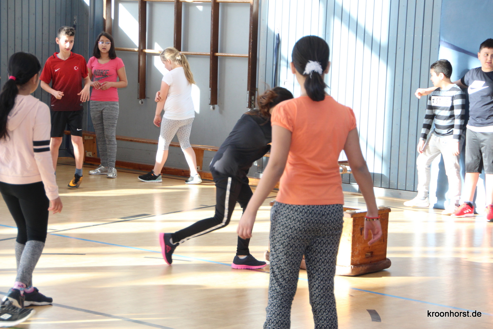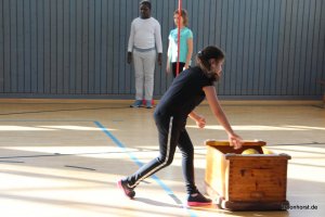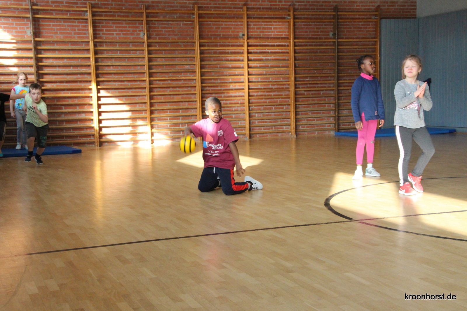 Die Sporttag- Neulinge Mäuse (1a), Pinguine (1b) und Drachen (1c) spielten zuerst "Bänkeball" gegeinander. Bei ihrer ersten Teilnahme wurden sowohl die Jungs als auch die Mädchen in viele Aktionen eingebunden. Die 1a schaffte hierbei die höchste Anzahl an Treffern.