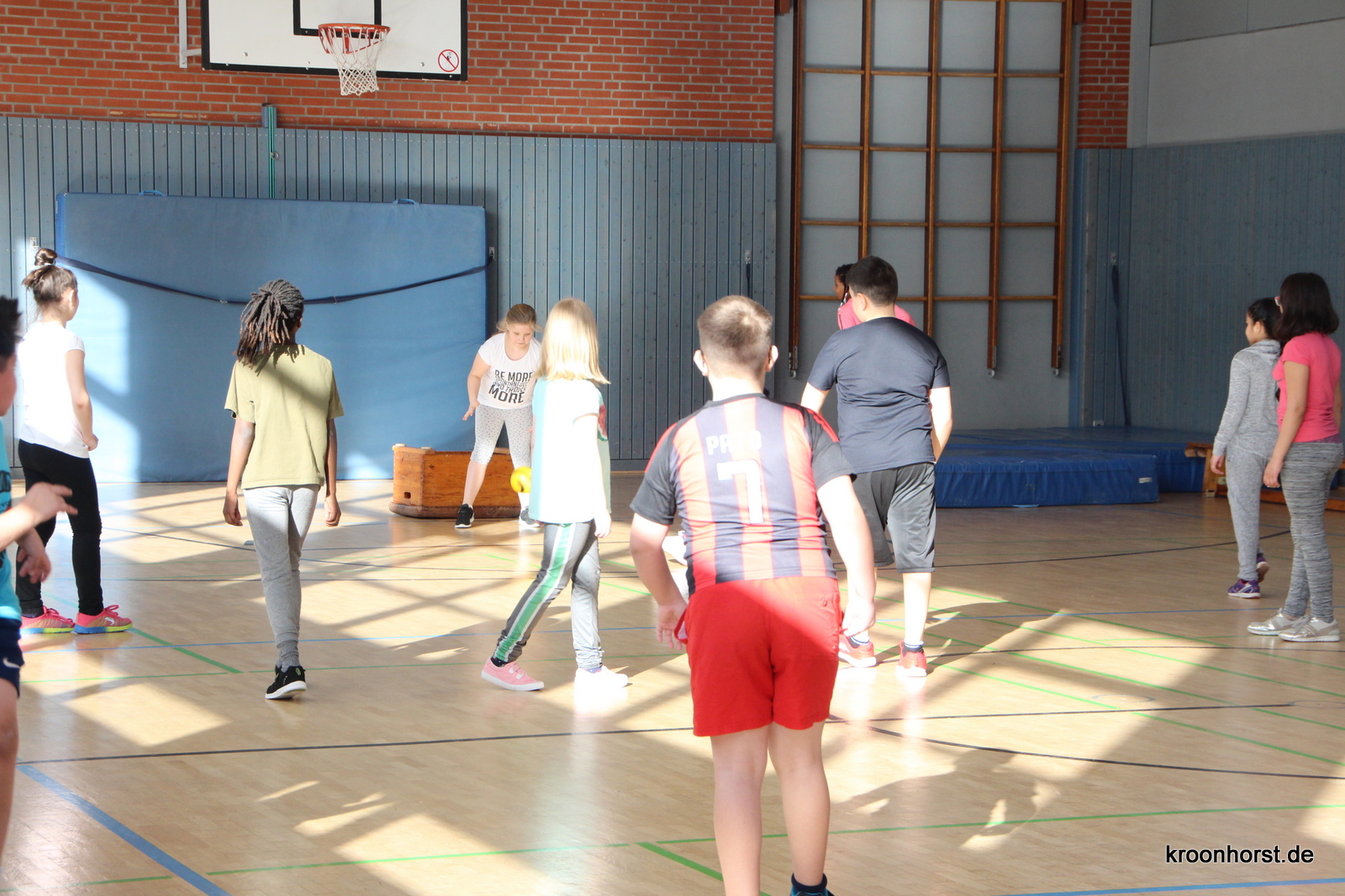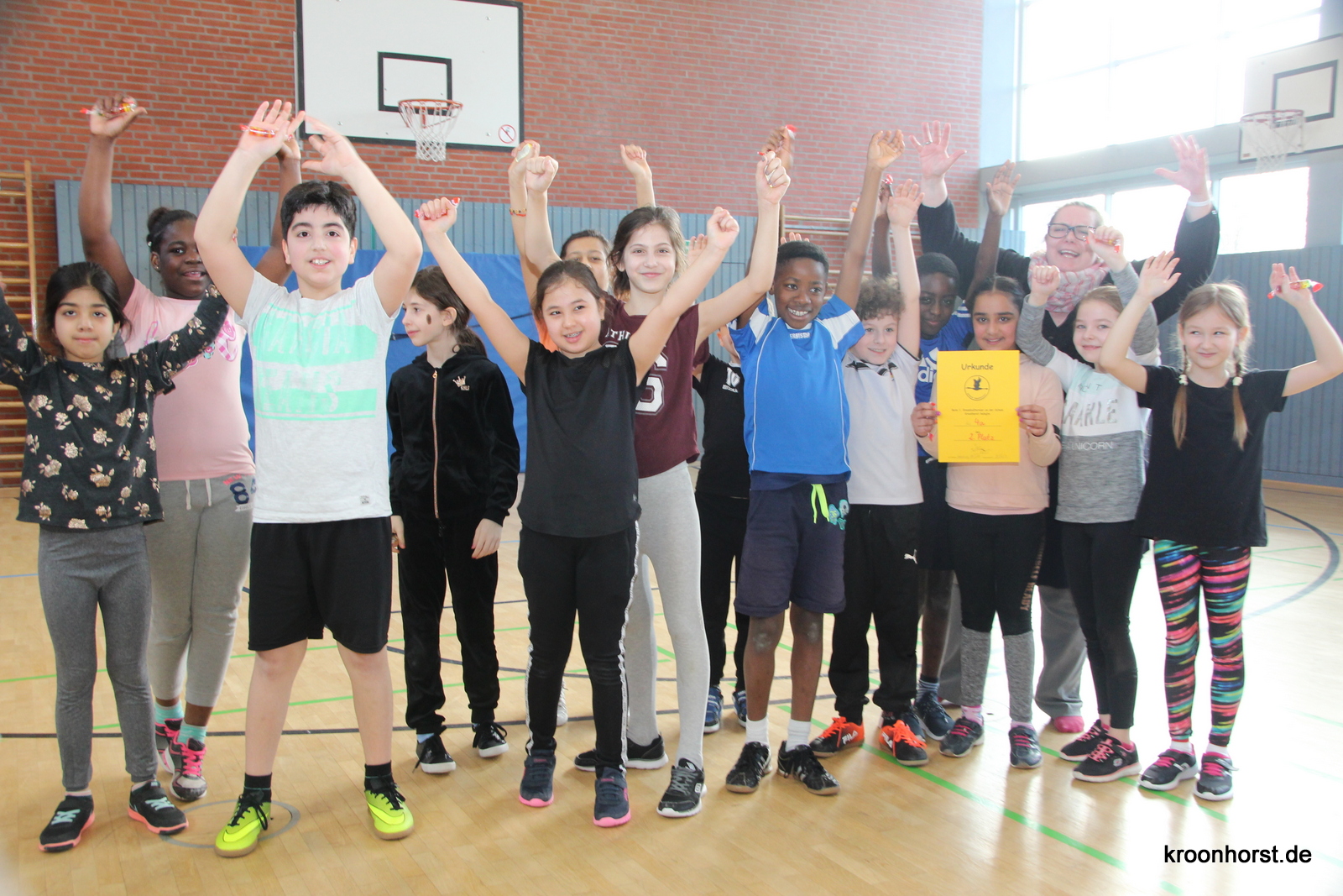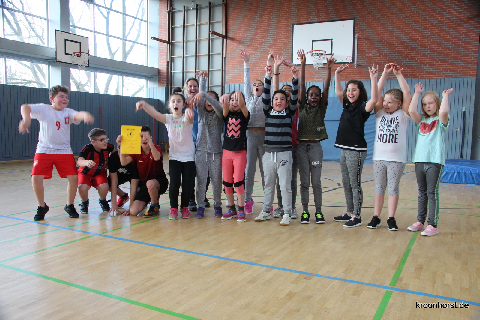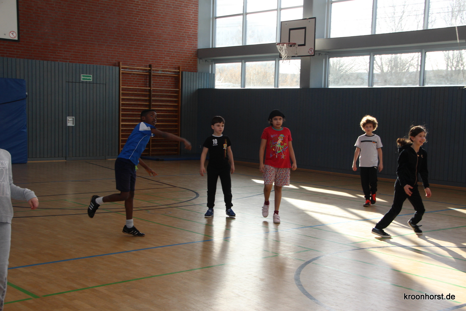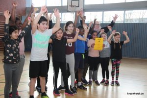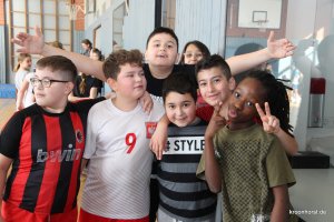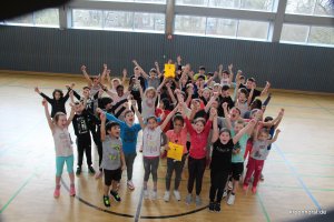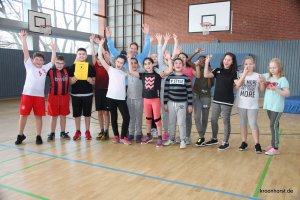 Parallel fand in der großen Sporthalle die nächste Auflage des schulinternen Fußballturniers statt. Traditionell treffen dabei jahrgangsübergreifend sowohl bei den Jungs als auch bei den Mädchen die dritten auch auf die vierten Klassen. Die große Fairness und der hohe Einsatz während des Turniers waren besonders erfreulich. Auch spielerisch zeigten mehrere der jungen Fußballer und Fußballerinnen ihr Talent in diesem Sport. Im Endresultat freuten sich die Jungs aus der 4c über den Turniersieg. Bei den Mädchen triumphierte die 4a.