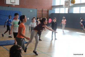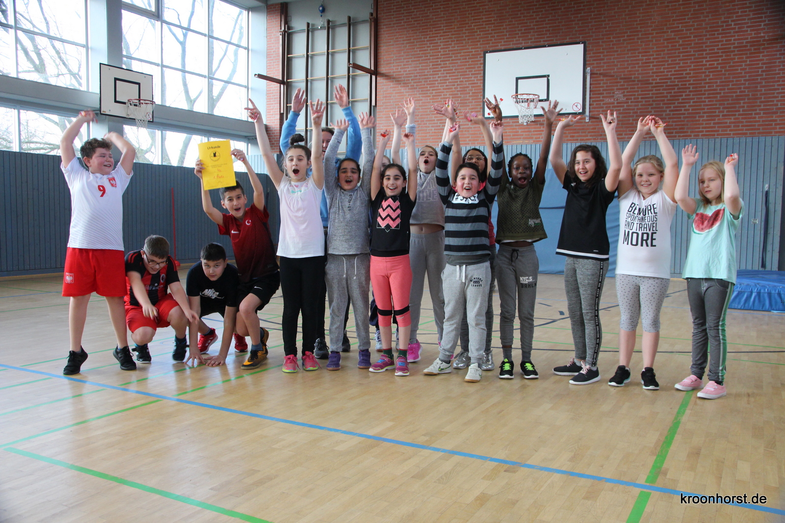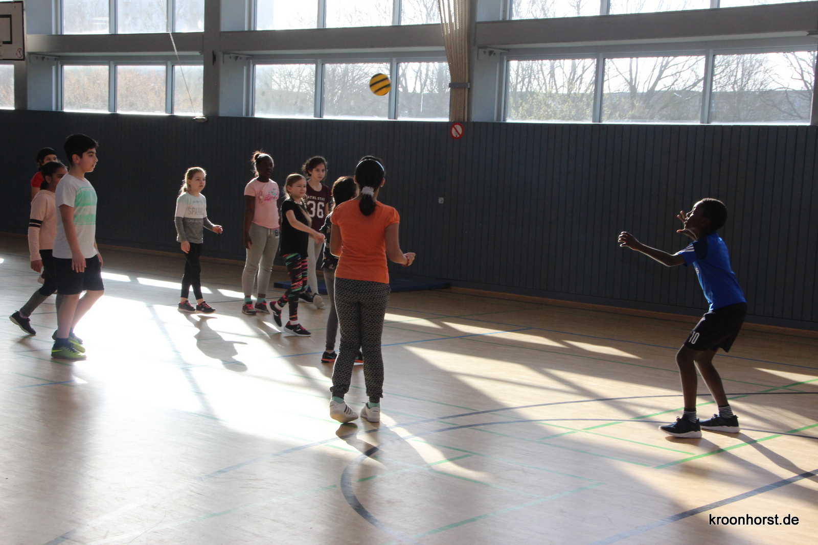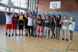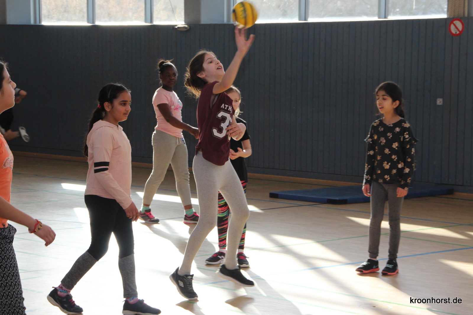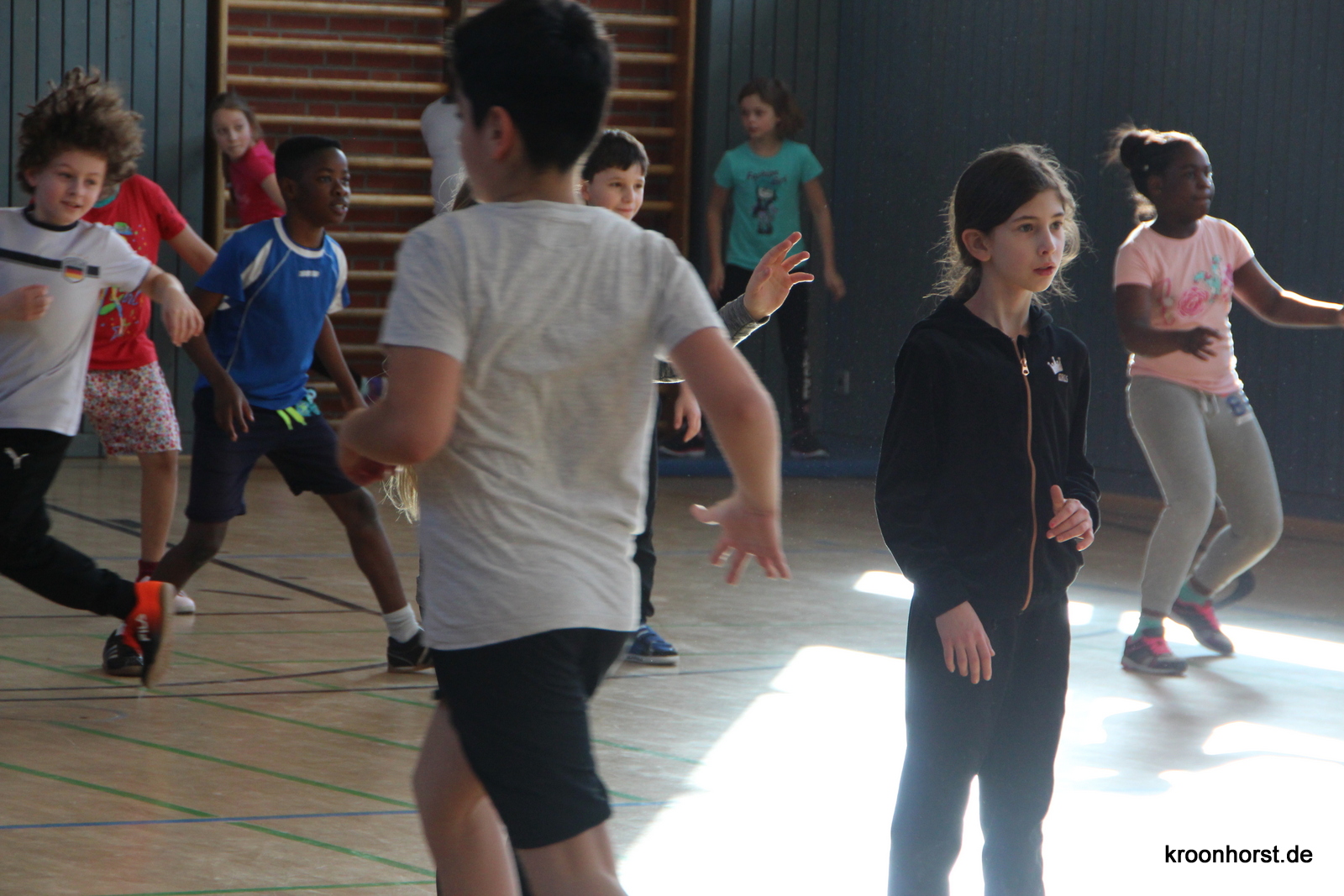 Parallel fand in der großen Sporthalle die nächste Auflage des schulinternen Fußballturniers statt. Traditionell treffen dabei jahrgangsübergreifend sowohl bei den Jungs als auch bei den Mädchen die dritten auch auf die vierten Klassen. Die große Fairness und der hohe Einsatz während des Turniers waren besonders erfreulich. Auch spielerisch zeigten mehrere der jungen Fußballer und Fußballerinnen ihr Talent in diesem Sport. Im Endresultat freuten sich die Jungs aus der 4c über den Turniersieg. Bei den Mädchen triumphierte die 4a.