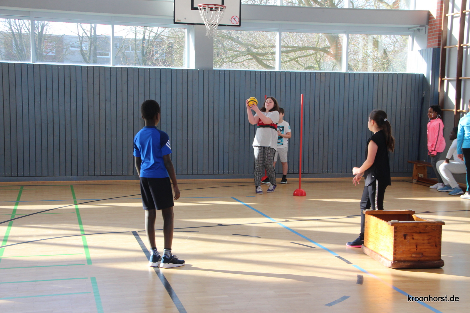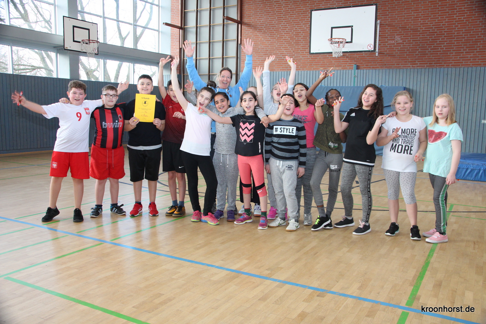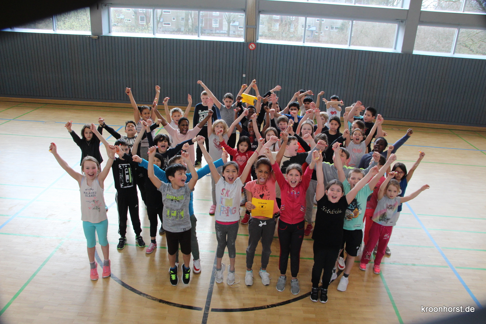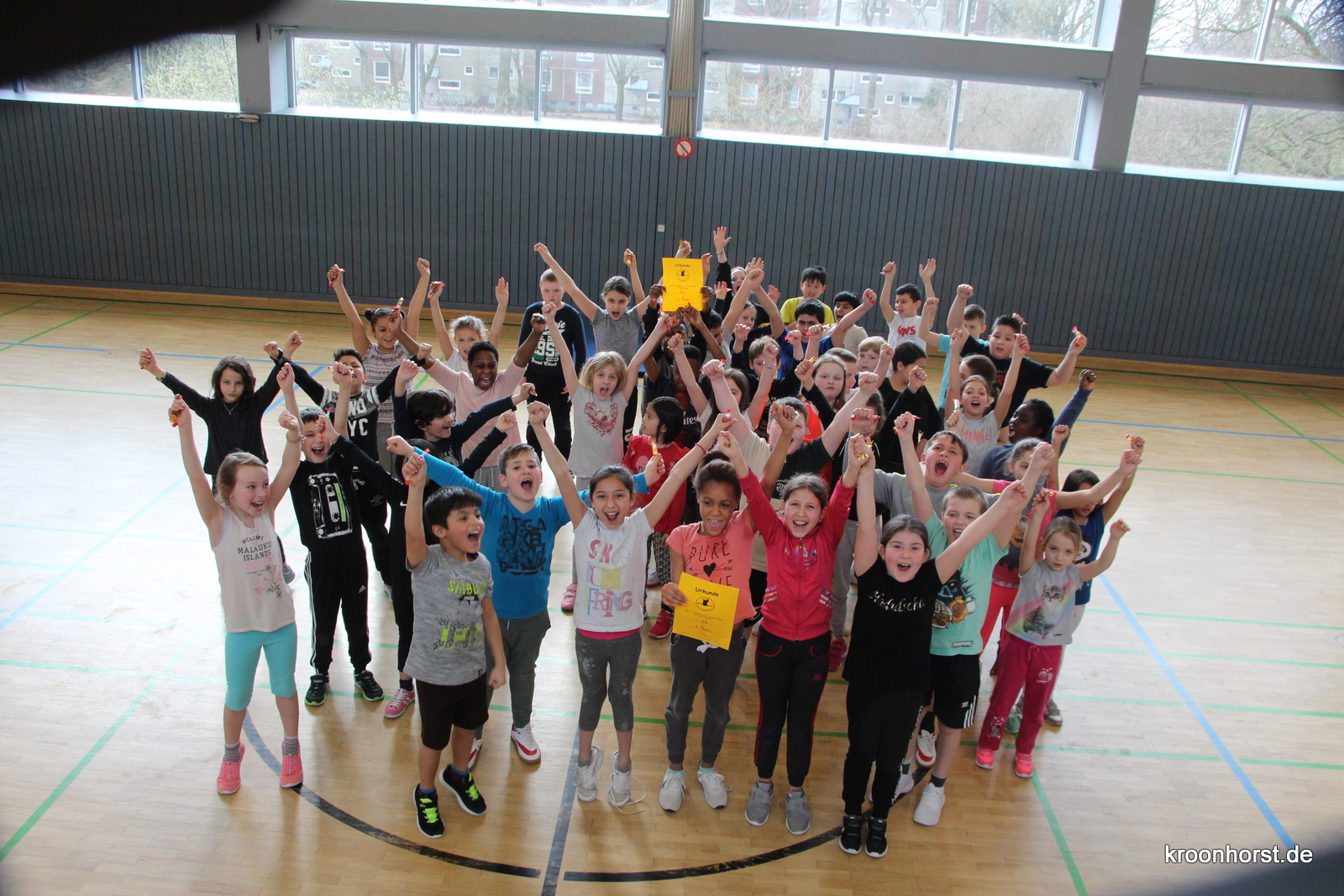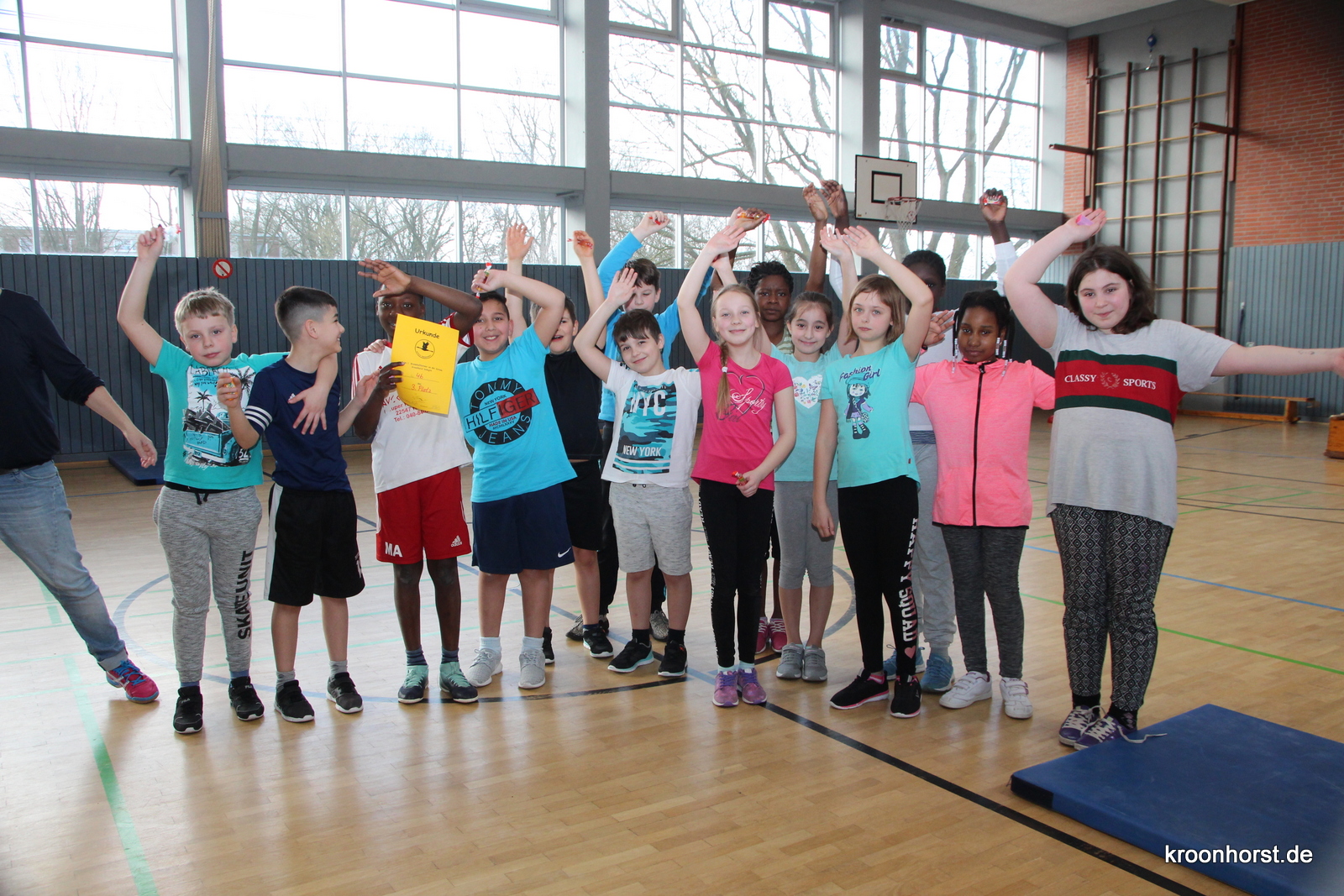 Parallel fand in der großen Sporthalle die nächste Auflage des schulinternen Fußballturniers statt. Traditionell treffen dabei jahrgangsübergreifend sowohl bei den Jungs als auch bei den Mädchen die dritten auch auf die vierten Klassen. Die große Fairness und der hohe Einsatz während des Turniers waren besonders erfreulich. Auch spielerisch zeigten mehrere der jungen Fußballer und Fußballerinnen ihr Talent in diesem Sport. Im Endresultat freuten sich die Jungs aus der 4c über den Turniersieg. Bei den Mädchen triumphierte die 4a.