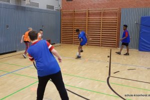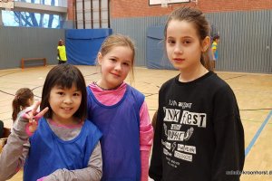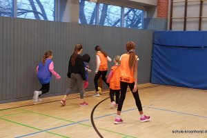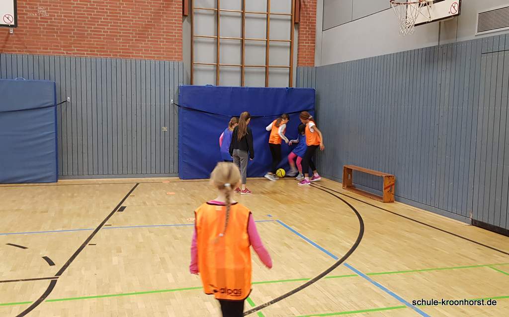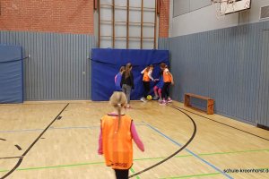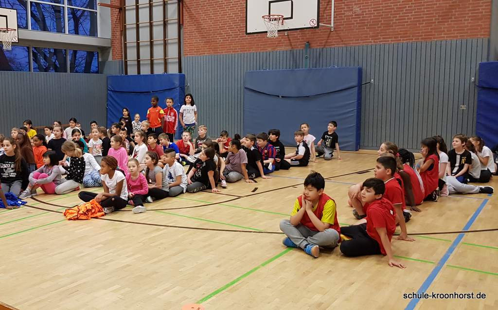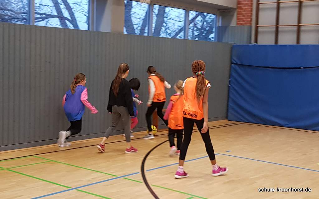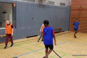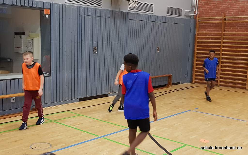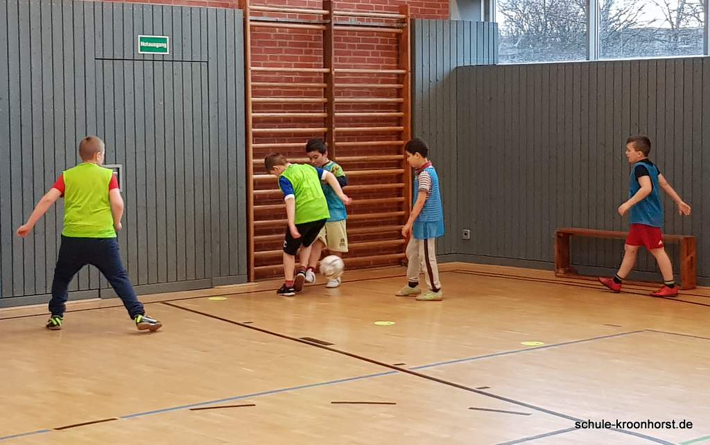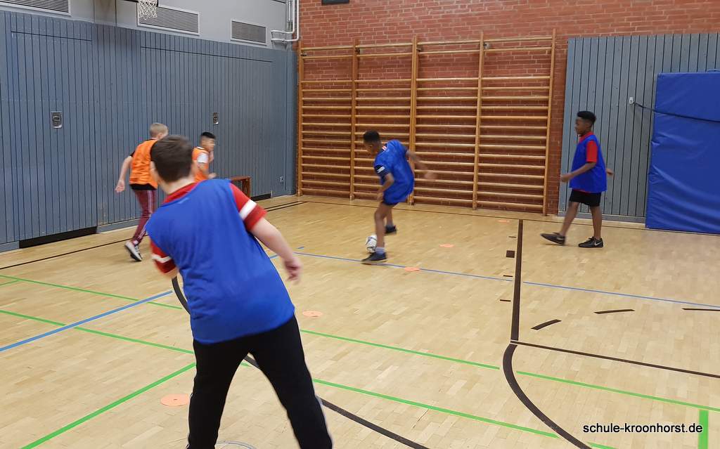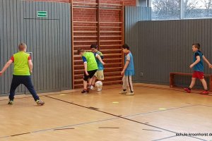 Am Mittwoch waren alle Mädchen und Jungs aus den Jahrgängen Drei und Vier in die große Sporthalle eingeladen. Passend zum neuen Jahrzehnt bot das Turnier ein neues, modernes Spiel- und Regelsystem. Auf zwei kleinen Feldern wurde ein 3vs3 ohne Torwart gespielt. Als Tore dienten auf beiden Seiten jeweils zwei Innenteile der großen Kästen. Vor den Toren markierte ein abgesteckter Bereich eine Schusszone, aus der Treffer erzielt werden mussten. Das durch den Aufbau provozierte Spielverhalten konnten viele Schüler/ -innen schnell erkennen und umsetzen: flaches Passspiel, mutige Dribblings und bessere Orientierung im Raum waren immer wieder zu beobachten.