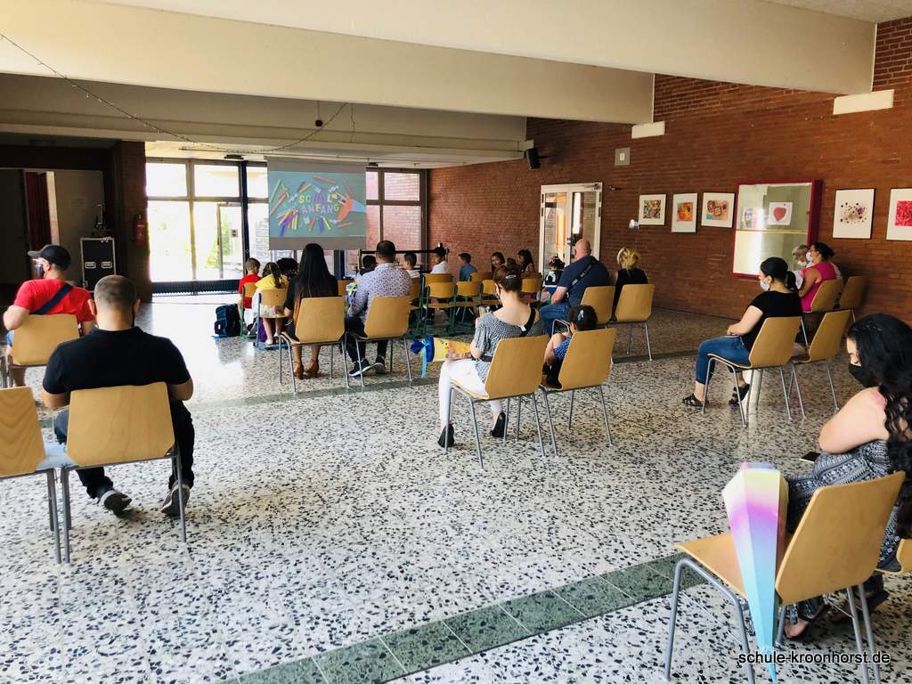 Der erste Schultag der jungen ABC-Schützen war in diesem Jahr nicht nur für die Kinder der drei neuen ersten Klassen und zwei Vorschulklassen besonders aufregend, auch für die Lehrer war dieser Tag wegen der Corona-Pandemie eine besondere Herausforderung. Wegen der notwendigen Vorsichtsmaßnahmen wurde jede der drei neuen Klassen separat eingeschult. Das traditionelle Einschulungstheaterstück der 4. Klassen musste in diesem Jahr zwar ausfallen, dennnoch konnten sich die neuen Erstklässler auf der Leinwand das Theaterstück aus dem letzten Schuljahr anschauen.