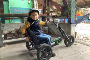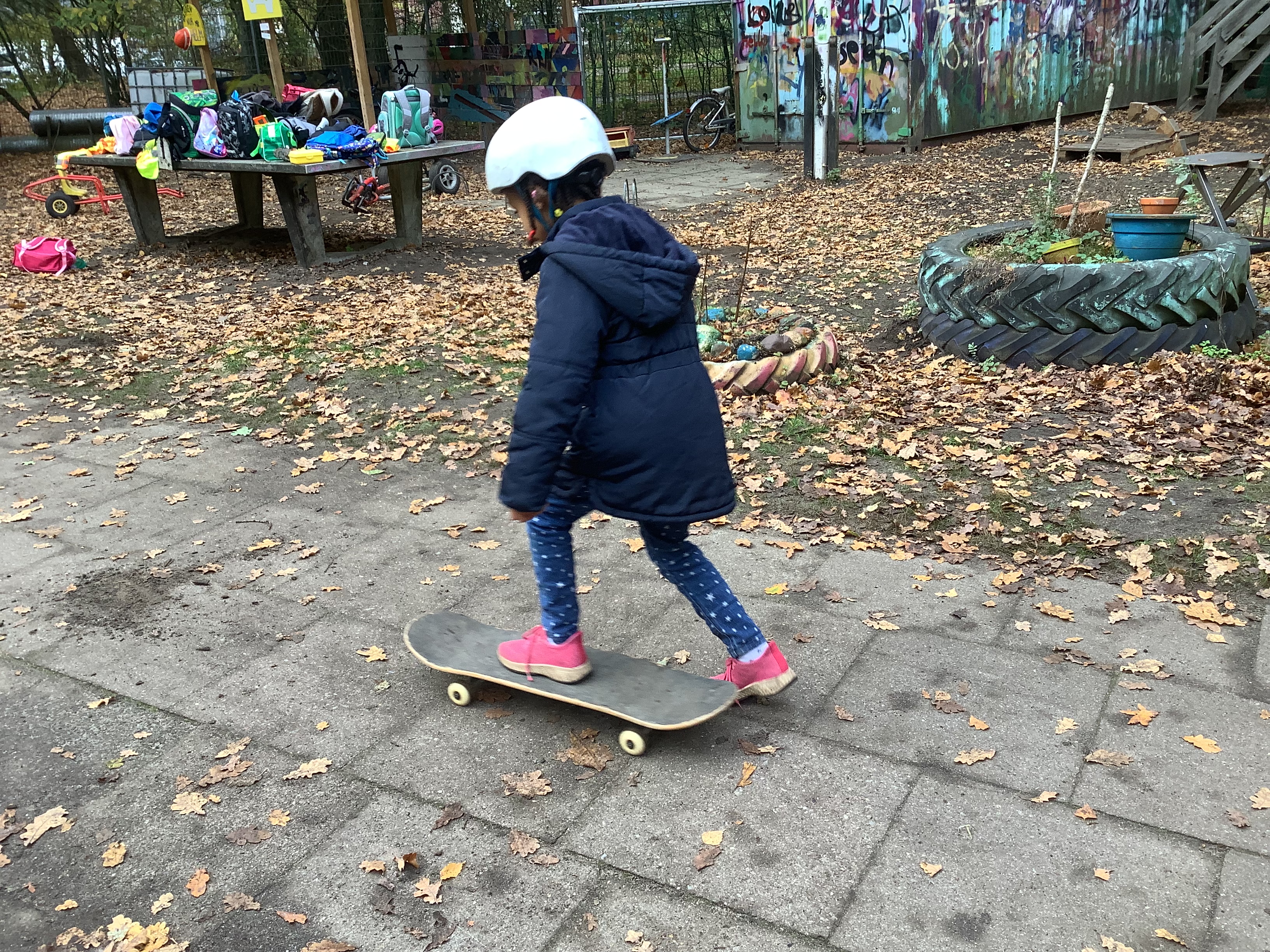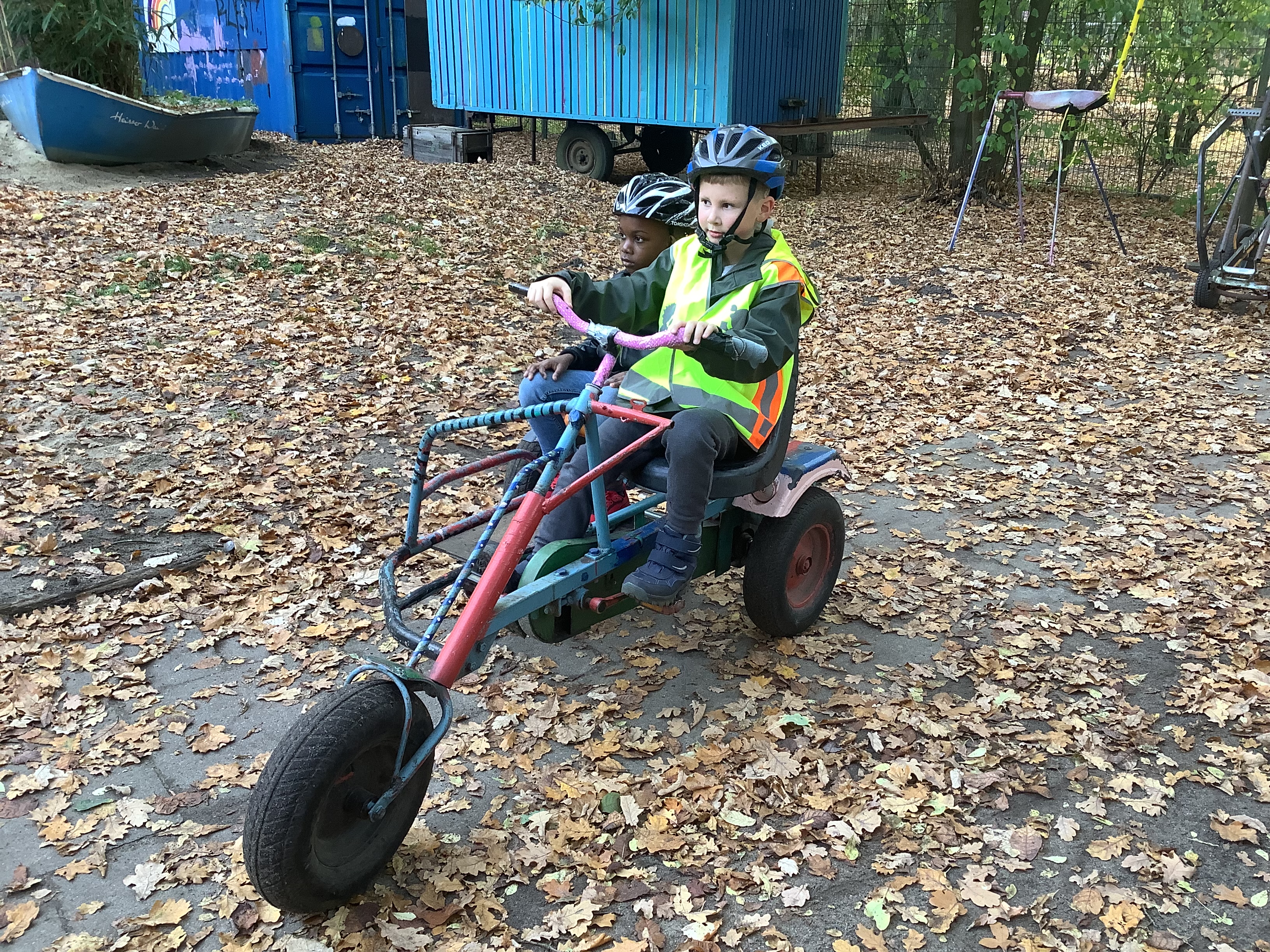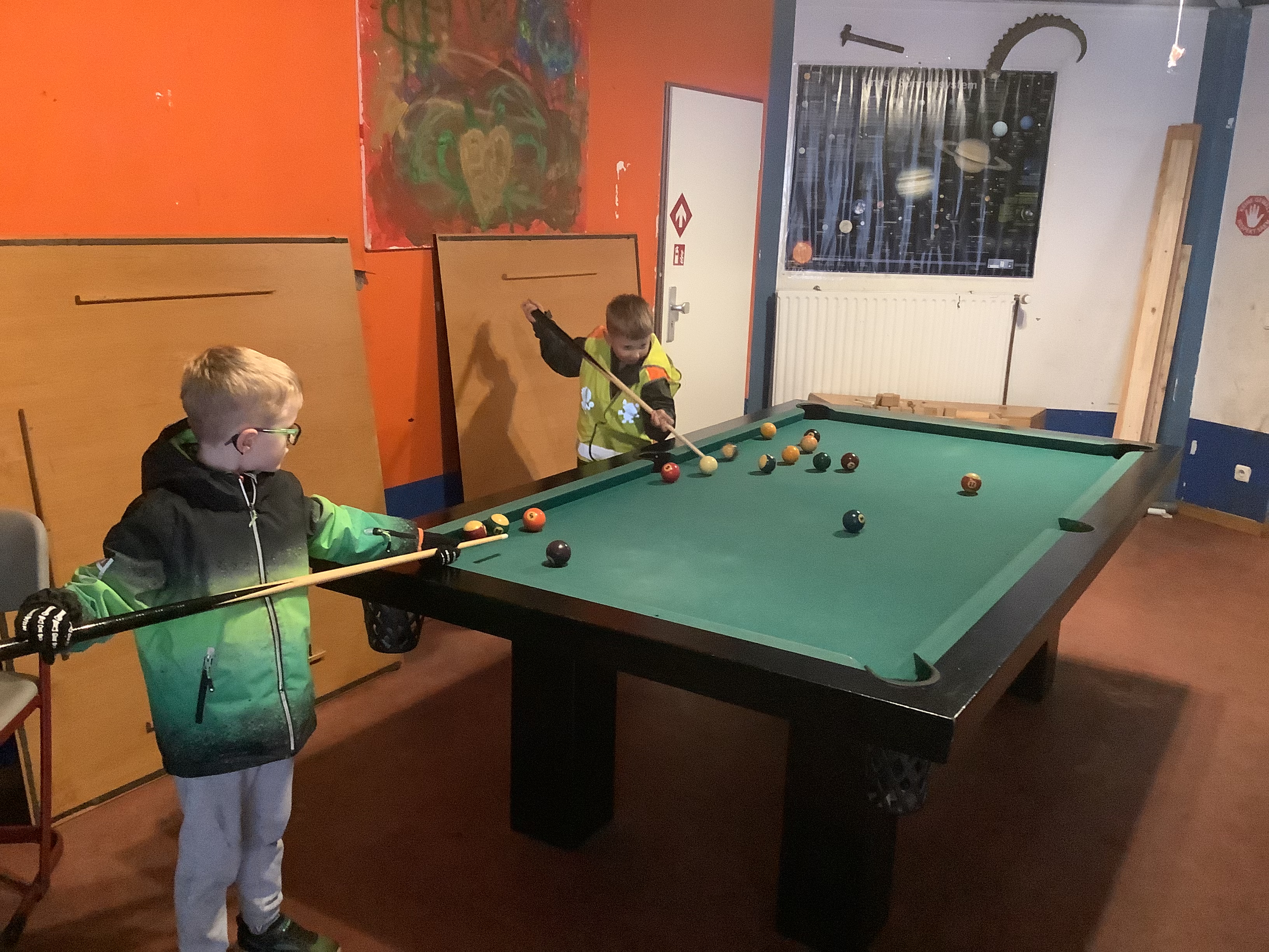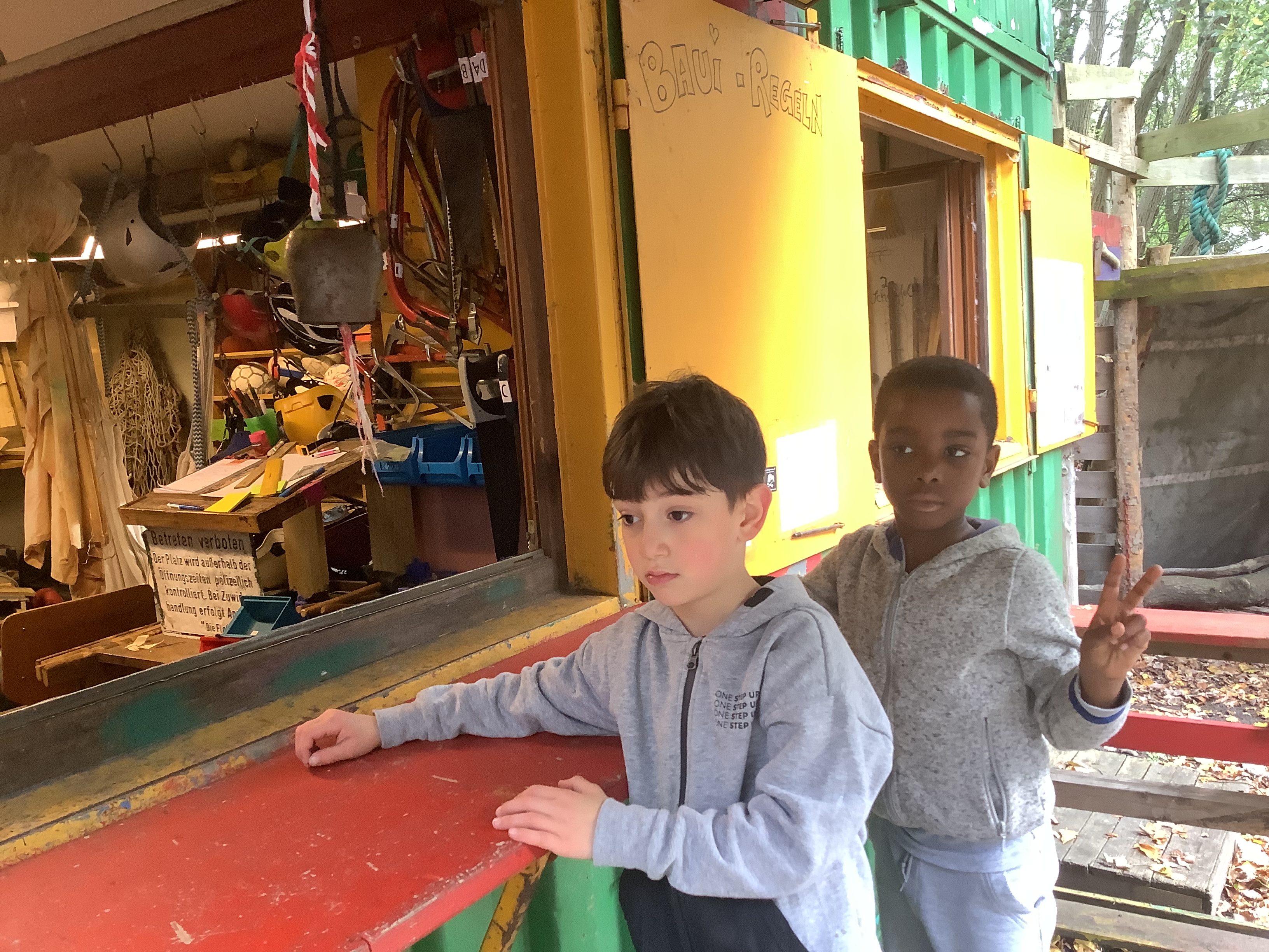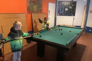 Die erste gemeinsame Busfahrt wurde bestens gemeistert, so dass uns am Vormittag bei teilweisem Sonnenschein das Mitarbeiterteam des EAS empfing. Nachdem zunächst kurz besprochen wurde, welche Regeln gelten und was die Schüler auf dem großen Gelände tun können, begaben wir uns sofort auf Entdeckertour. Jeder Winkel und jede Ecke wurde inspiziert, die vielen Holzbauten und hohen Klettergerüste direkt von uns erprobt wie ausführlich bespielt. Zudem liehen sich einige Schüler coole Fahrzeuge und Skateboards aus. Andere wiederum zogen es vor, im Innenbereich zu basteln oder sich beim Kicker und Billard zu versuchen, ehe anschließend wieder draußen getobt wurde. Auch Fußball wurde in einem umzäunten und mit Brettern gebauten Feld gespielt.