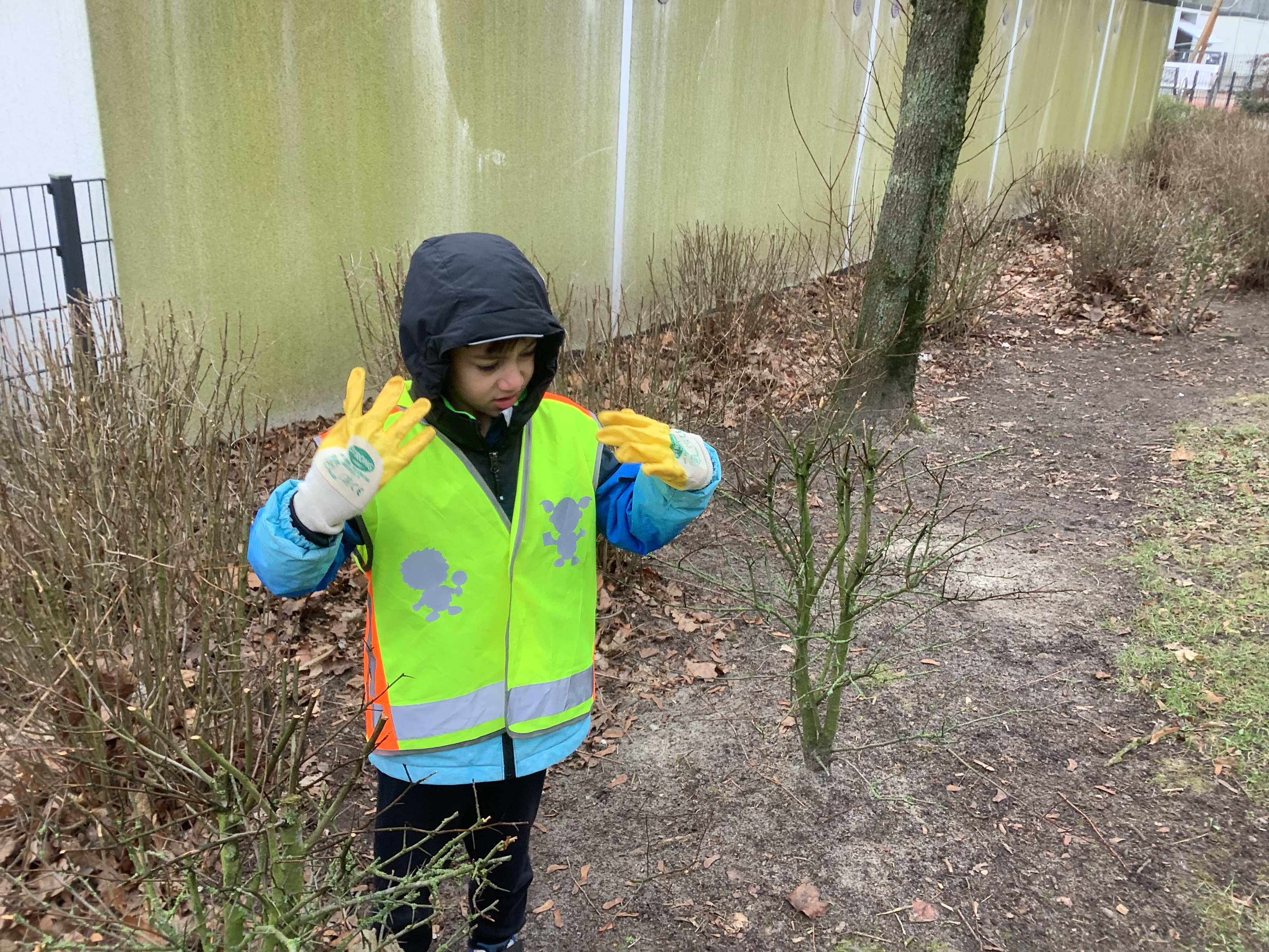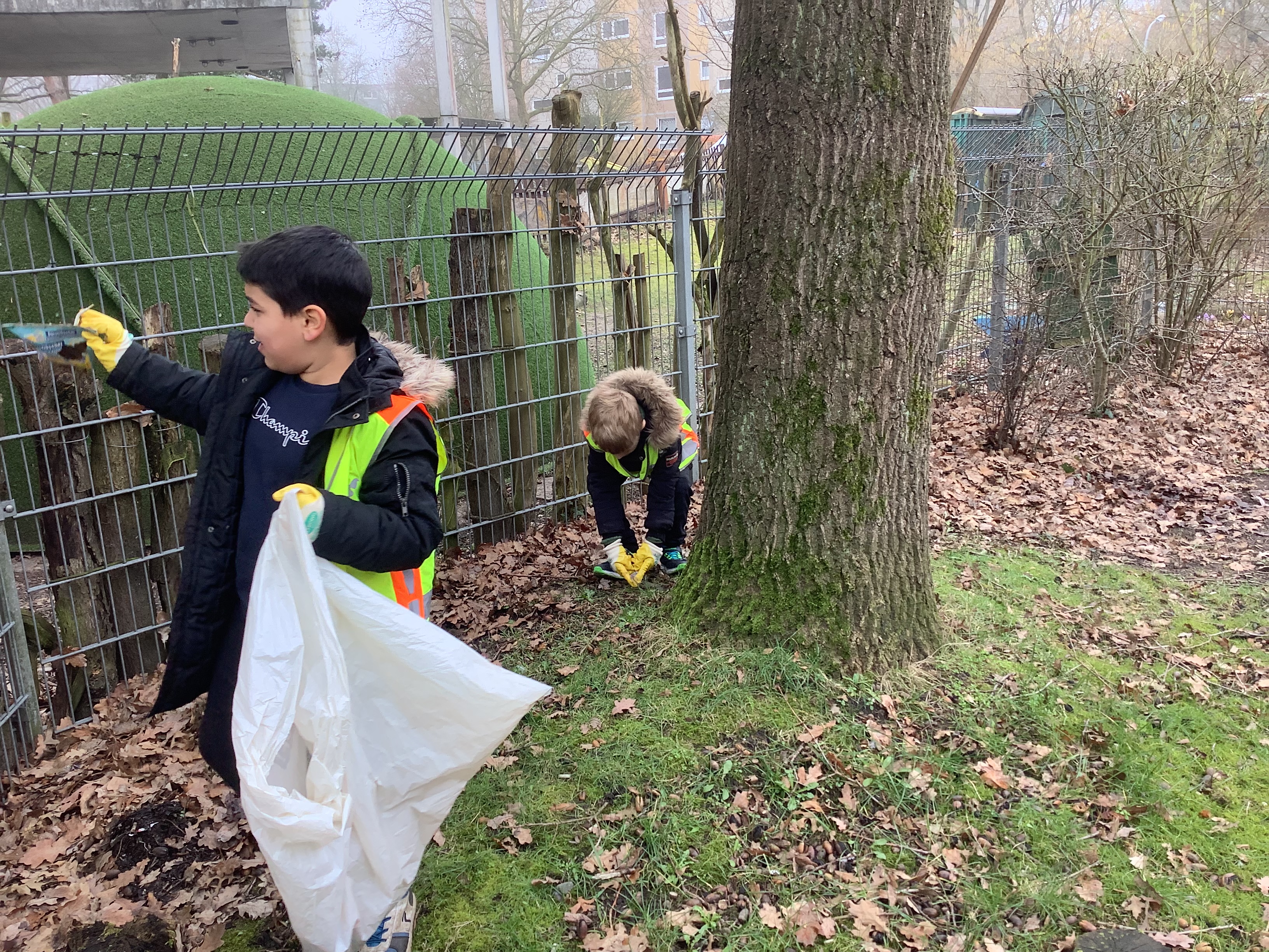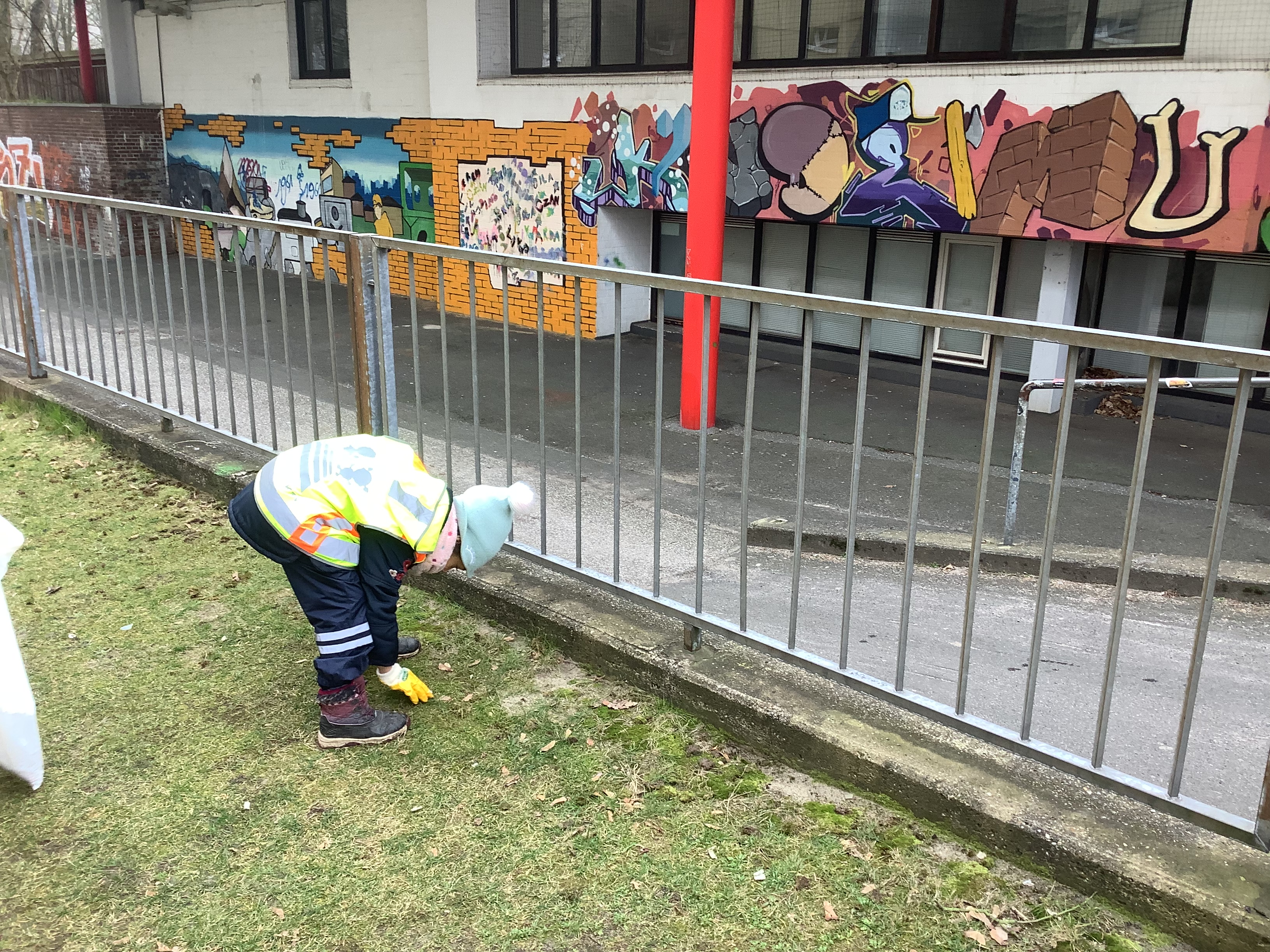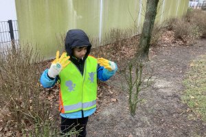 Schon morgens nach dem Frühstück starteten wir die ersten Aufräumarbeiten auf dem so genannten Außengelände, dem Spielplatz, der unmittelbar an unsere Schule angrenzt. Dort gab es erwartungsgemäß viel zu tun, so dass wir uns im Anschluss daran zunächst einmal im Klassenraum aufwärmten und für die zweite Tour stärkten. Als nächstes wählten wir einen Weg um das Borncenter vorbei am Kindermuseum bis zur Bushaltestelle am Achtern Born. Unterwegs trafen wir auf allerlei Fundstücke am Wegesrand, und fanden sogar einen alten Staubsauger. Die mitgeschleppten Müllsäcke wurden nun mehr immer weiter gefüllt. Zum Abschluss machten die fleißigen Helfer der 1a einen verdienten Halt auf dem Inlinerspielplatz, um von dort aus rechtzeitig zum Mittagessen wieder in die Schule zurückzukehren.