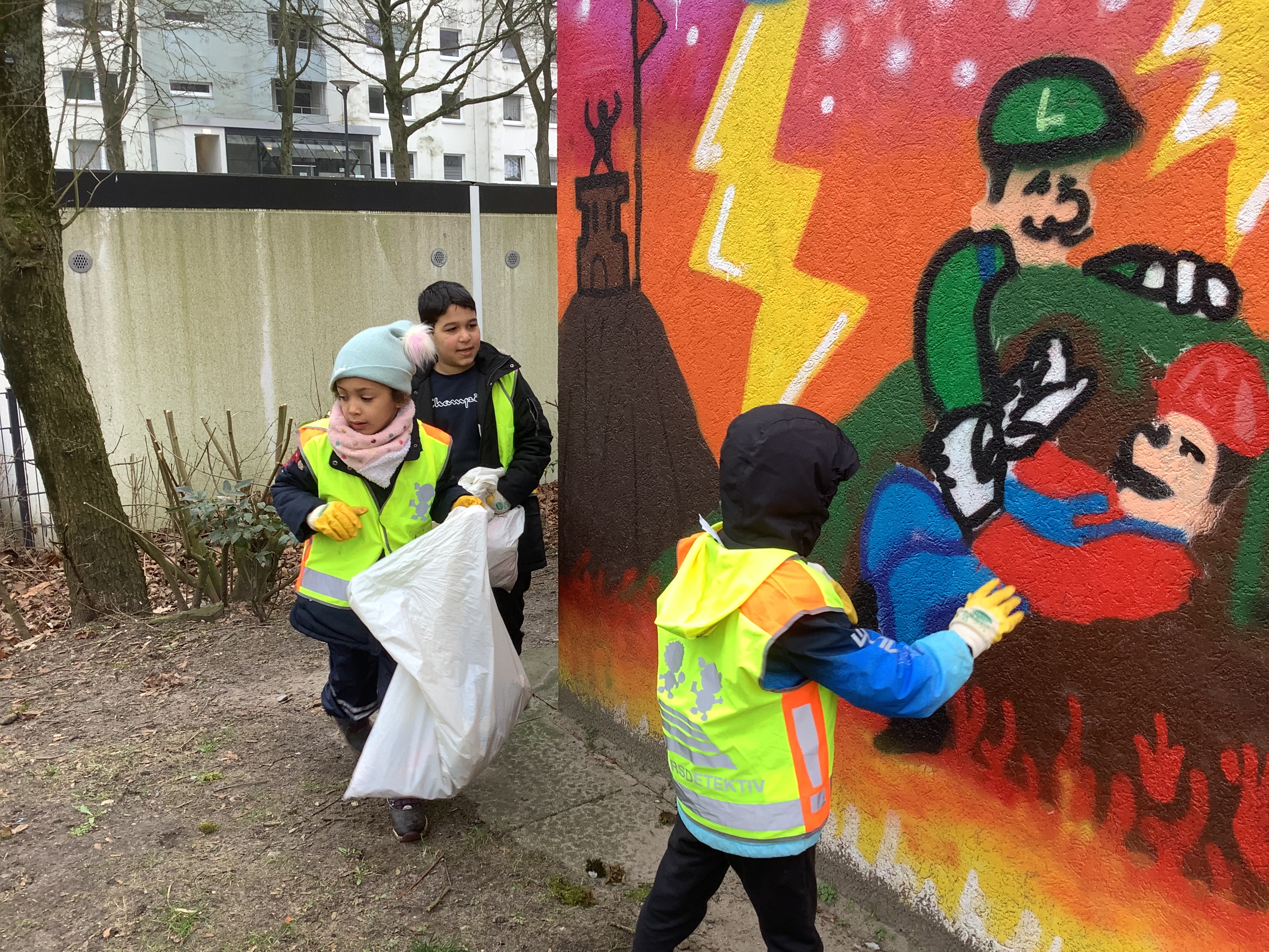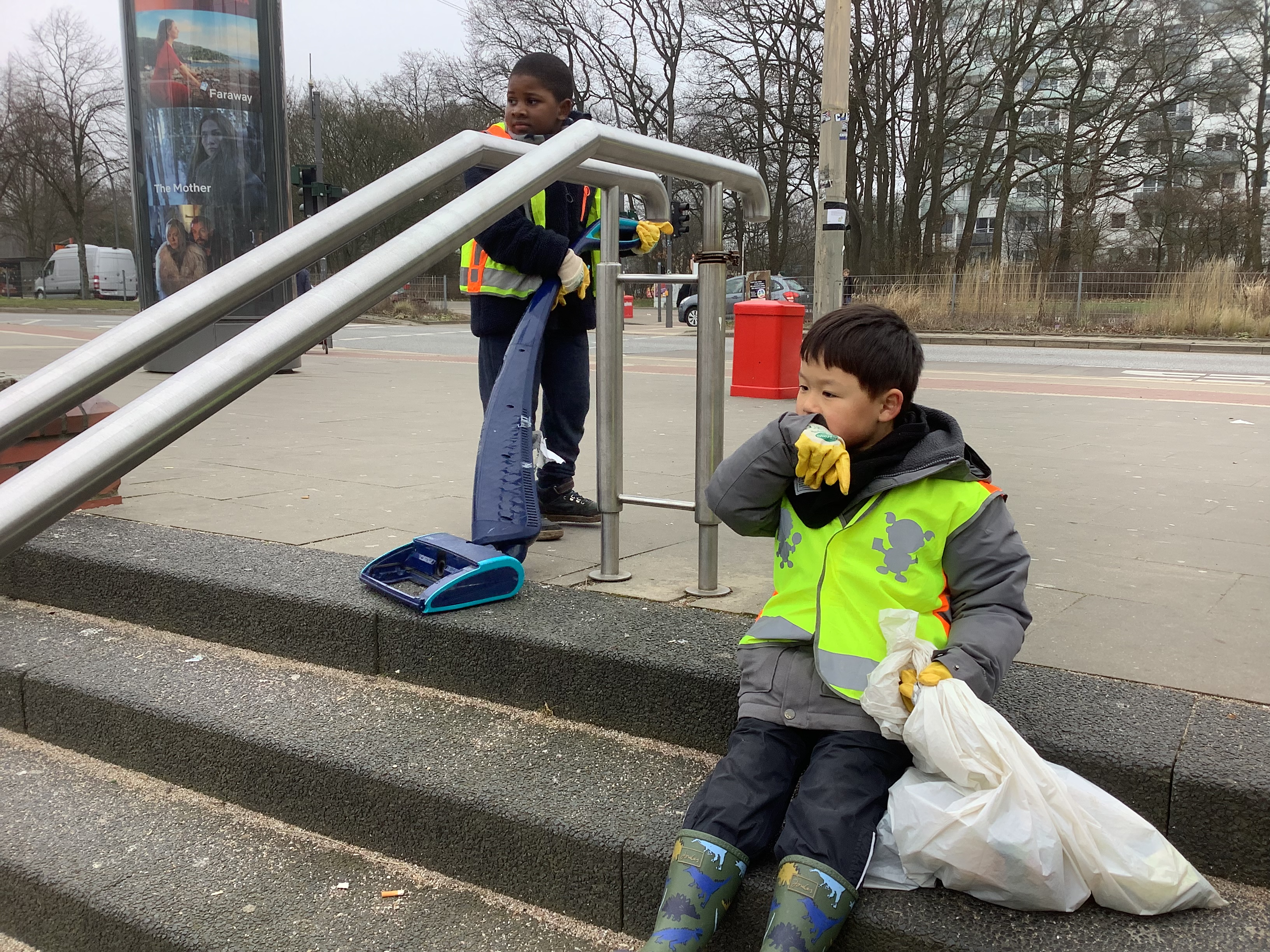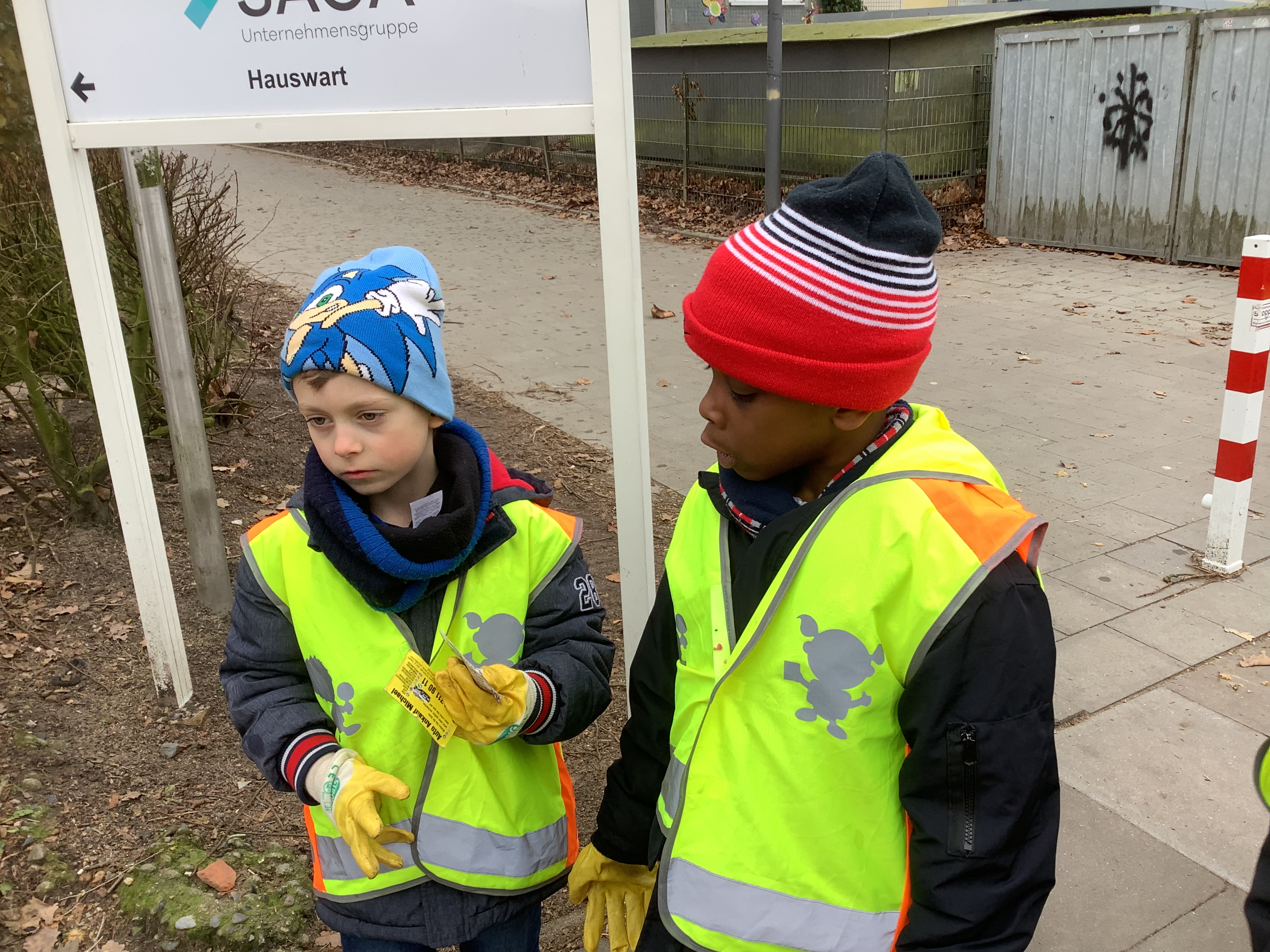 Kurz vor Beginn der Frühlingsferien machten die Schüler aus der 1a „klar Schiff“ in ihrem Stadtteil. Die Chamäleonklasse nahm gemeinsam mit Frau Danner und Herrn Röseler an der alljährlich stattfindenden Aktion der Stadtreinigung „Hamburg räumt auf“ teil. Vorab wurden für die eifrigen Sammler reichlich Müllbeutel und gelbe Handschuhe verteilt.
