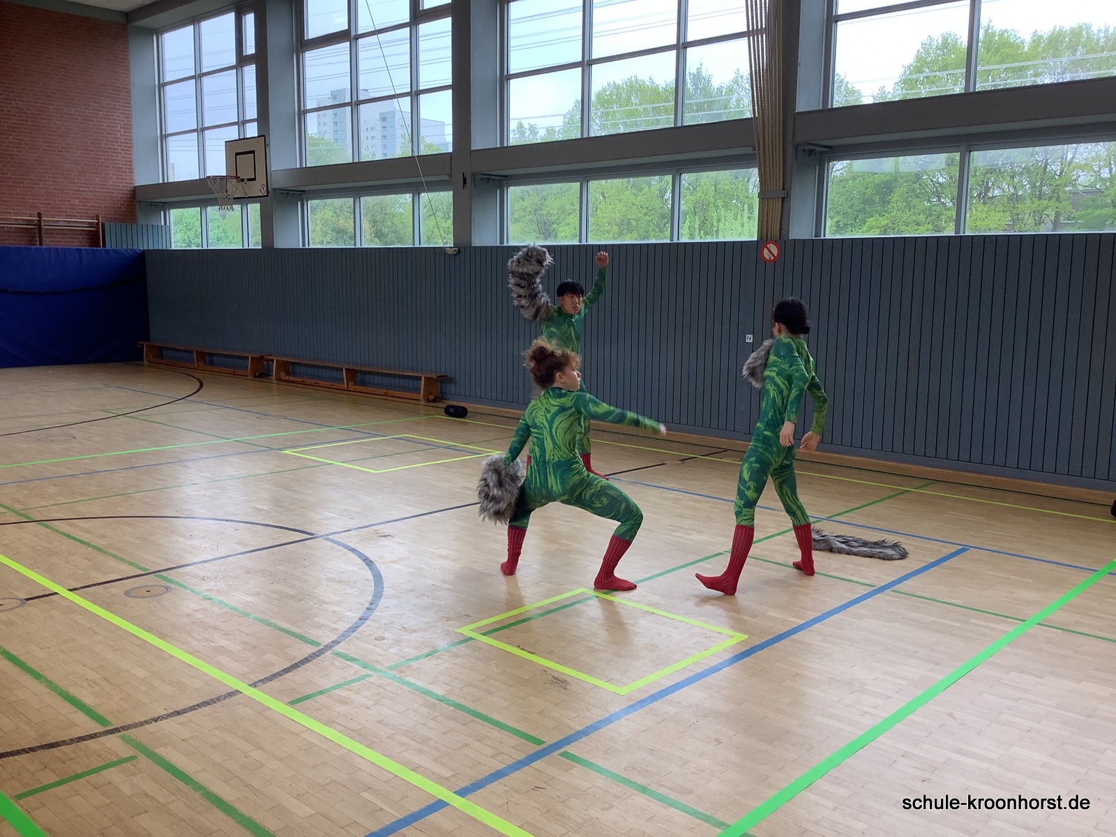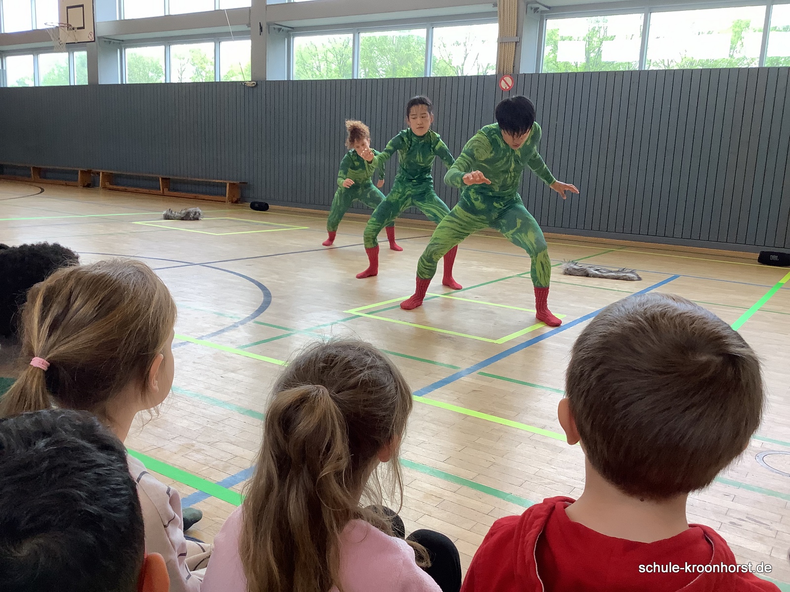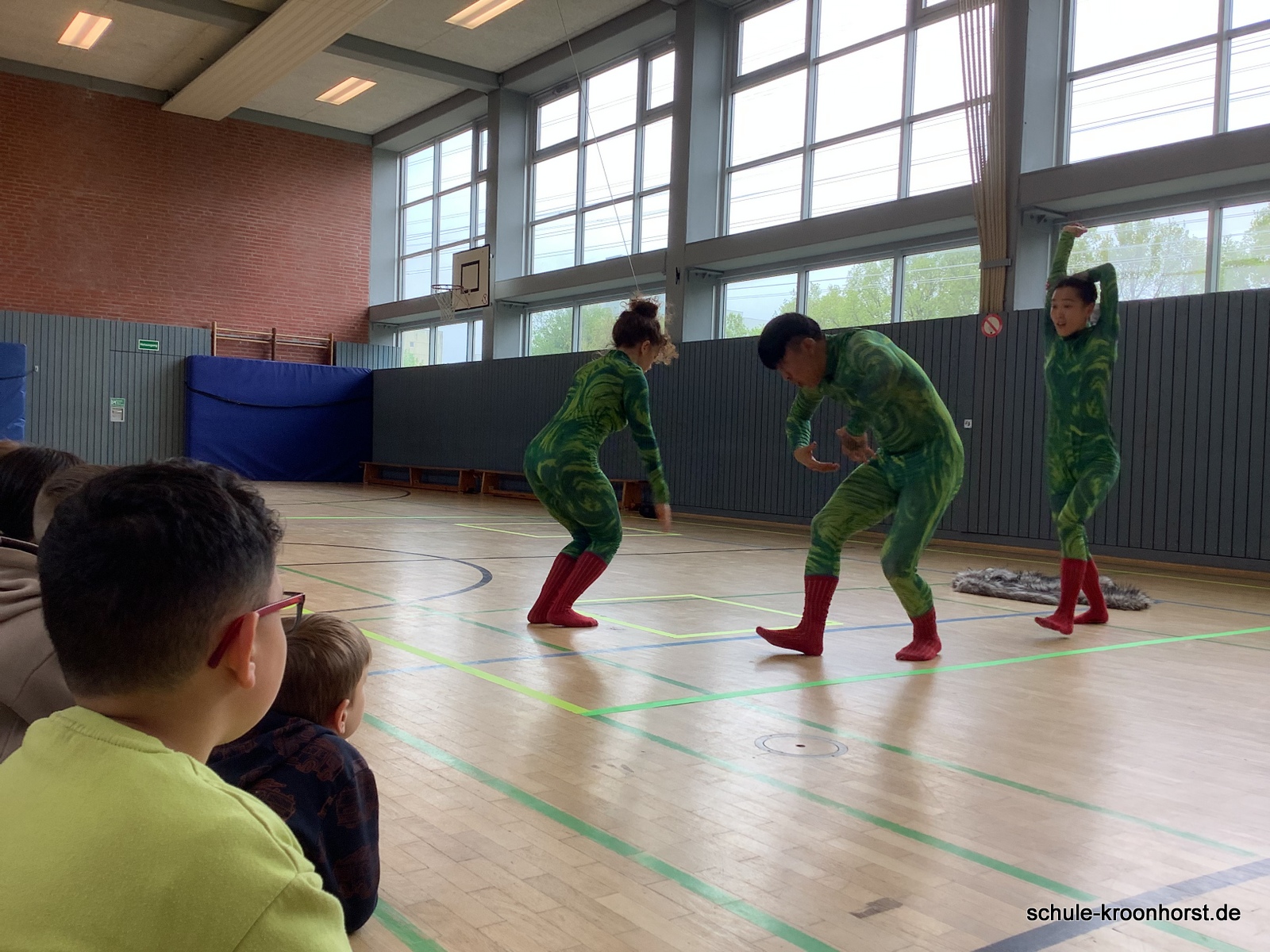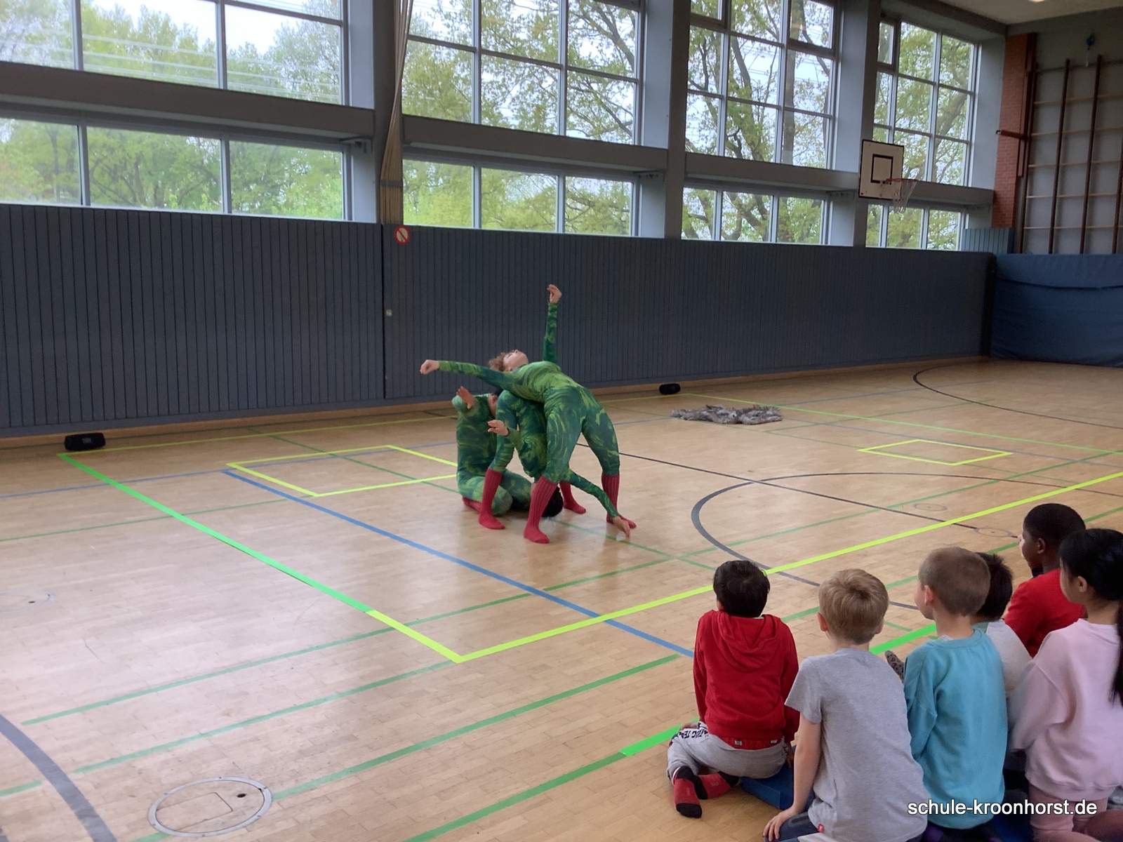 Heute, kurz vor Beginn der Maiferien, hieß es "Herzlich Willkommen am Kroonhorst" - begrüßen durften wir eine internationale Gruppe von Künstlern der Kulturfabrik Kampnagel aus dem Stadtteil Winterhude. Im Rahmen eines dreitägigen Festivals veranstaltete das Team vom "K3 - Zentrum für Choreographie" mehrere so genannte Pop- Up Features. Die mobilen Produktionen mit einer Mischung aus Tanz, Akrobatik und Theater suchten dabei den Weg hin zum Publikum und folgten dafür sehr erfreulich der Einladung unserer drei ersten Klassen an den Kroonhorst.