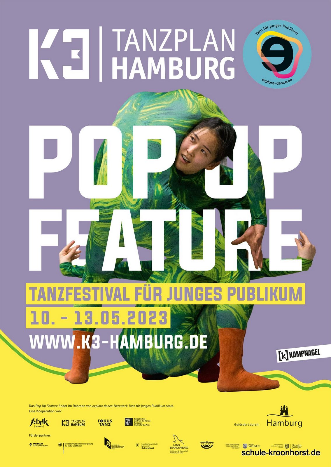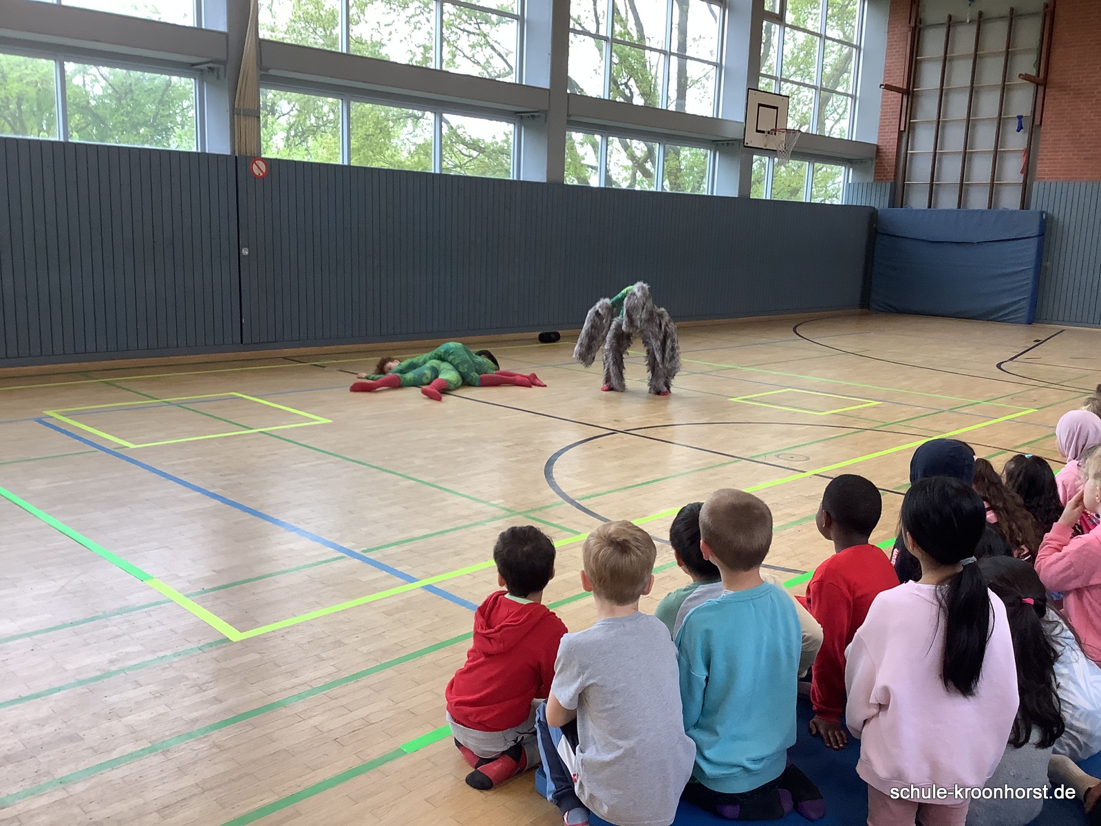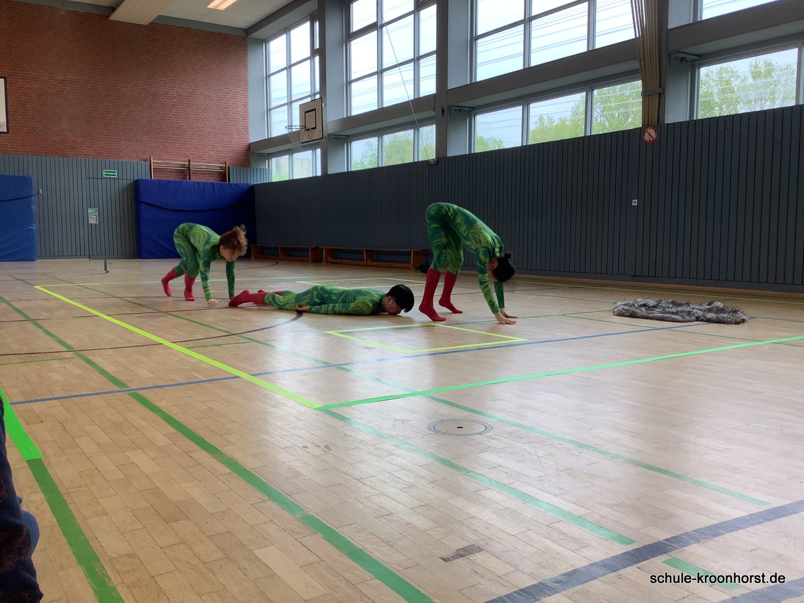 Heute, kurz vor Beginn der Maiferien, hieß es "Herzlich Willkommen am Kroonhorst" - begrüßen durften wir eine internationale Gruppe von Künstlern der Kulturfabrik Kampnagel aus dem Stadtteil Winterhude. Im Rahmen eines dreitägigen Festivals veranstaltete das Team vom "K3 - Zentrum für Choreographie" mehrere so genannte Pop- Up Features. Die mobilen Produktionen mit einer Mischung aus Tanz, Akrobatik und Theater suchten dabei den Weg hin zum Publikum und folgten dafür sehr erfreulich der Einladung unserer drei ersten Klassen an den Kroonhorst.