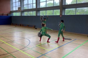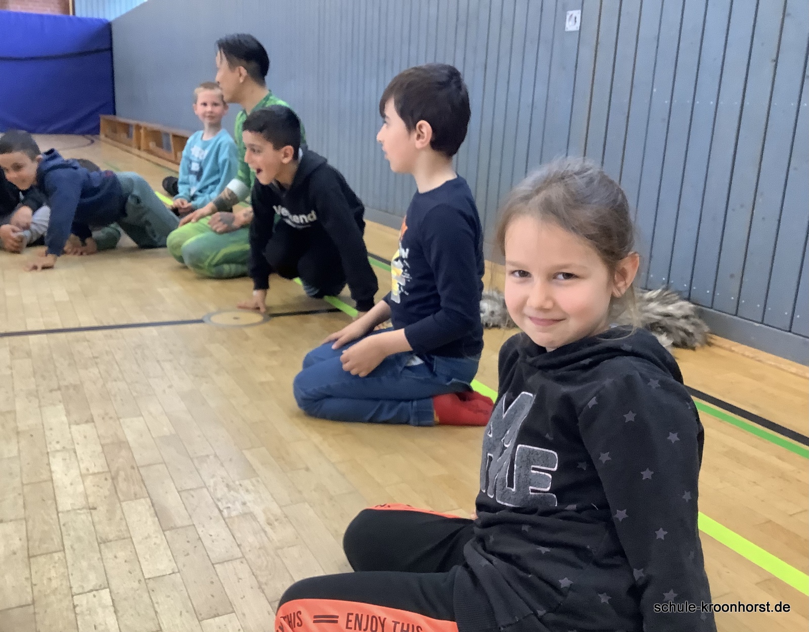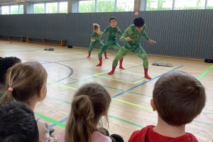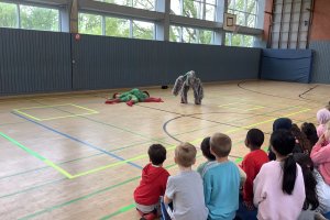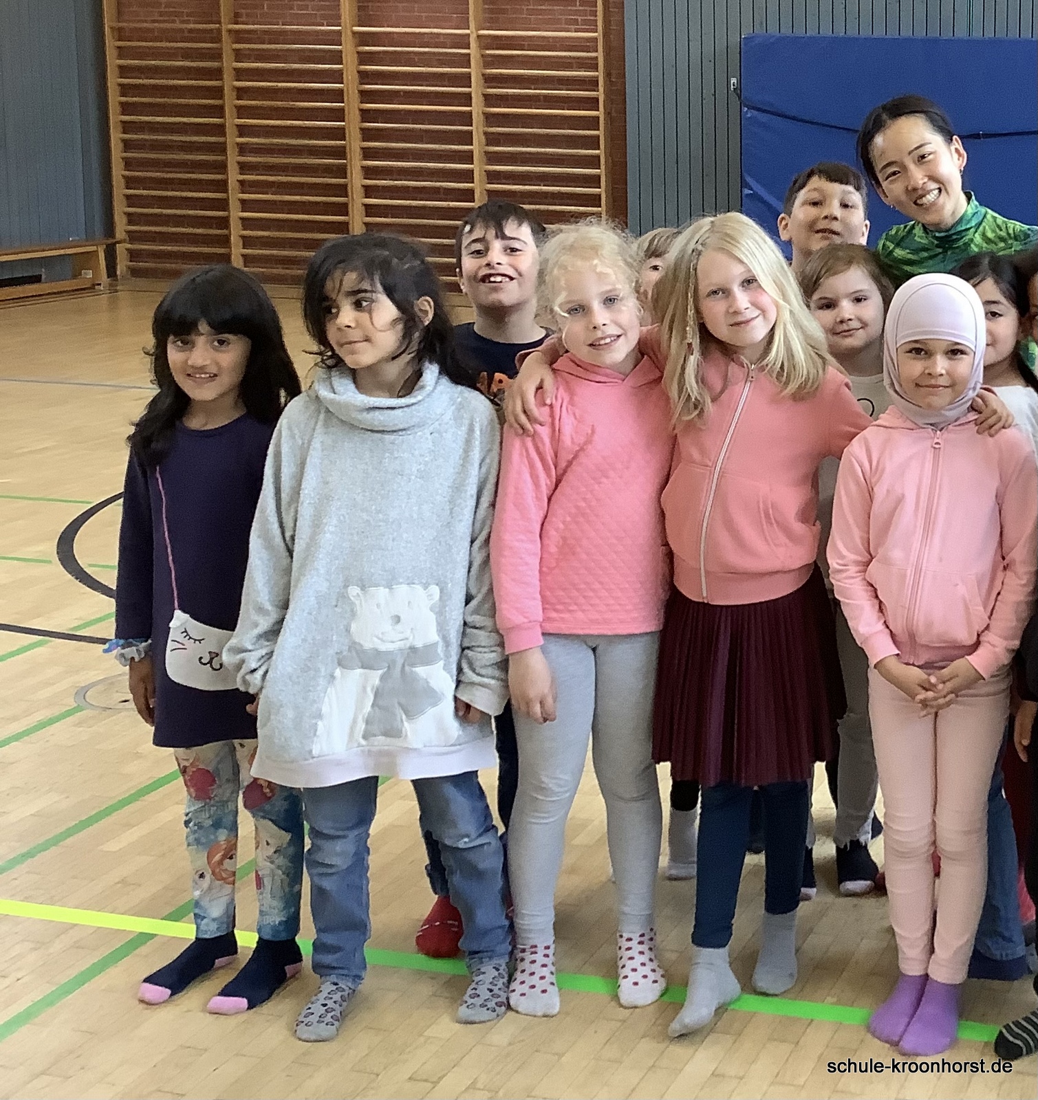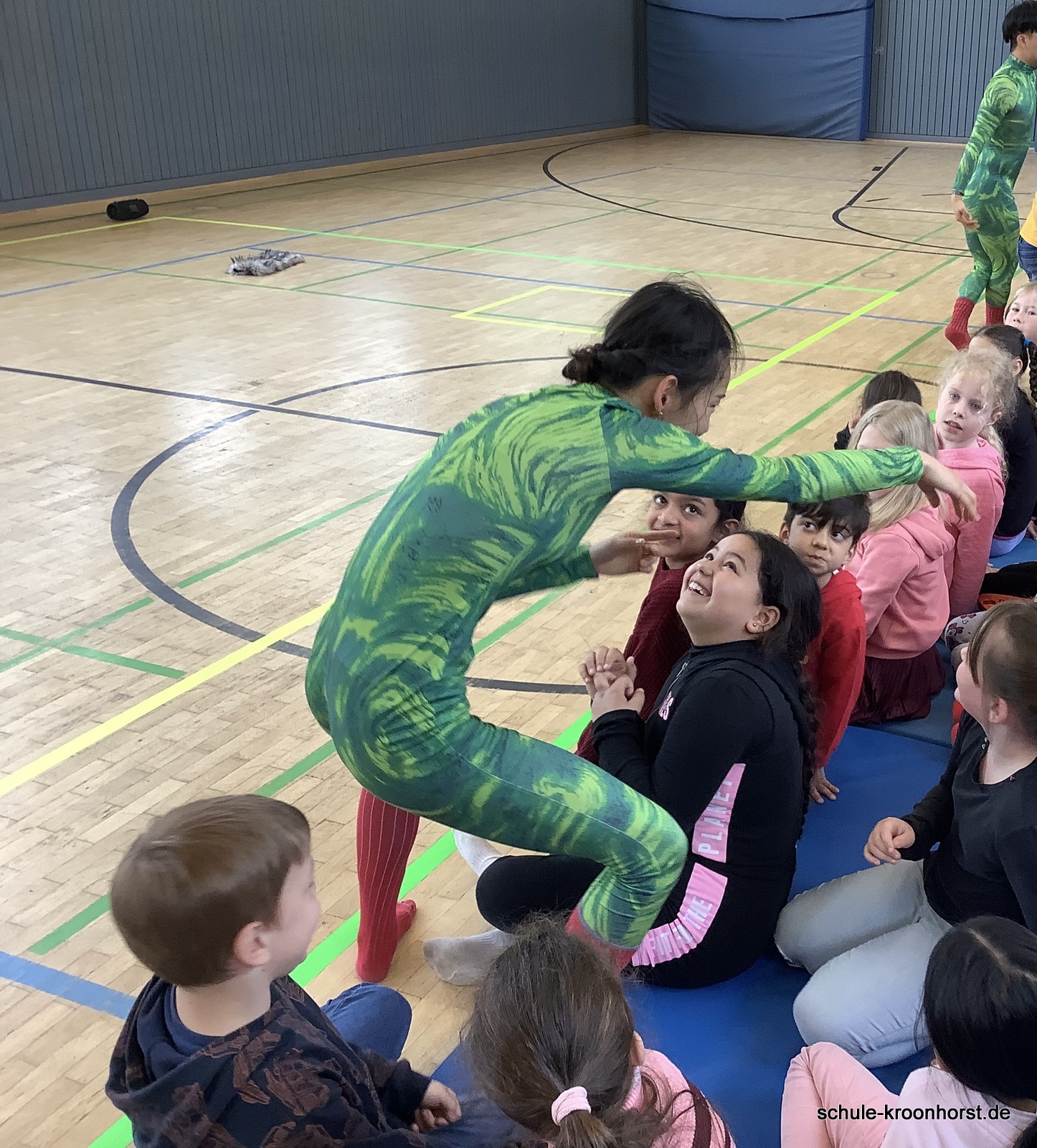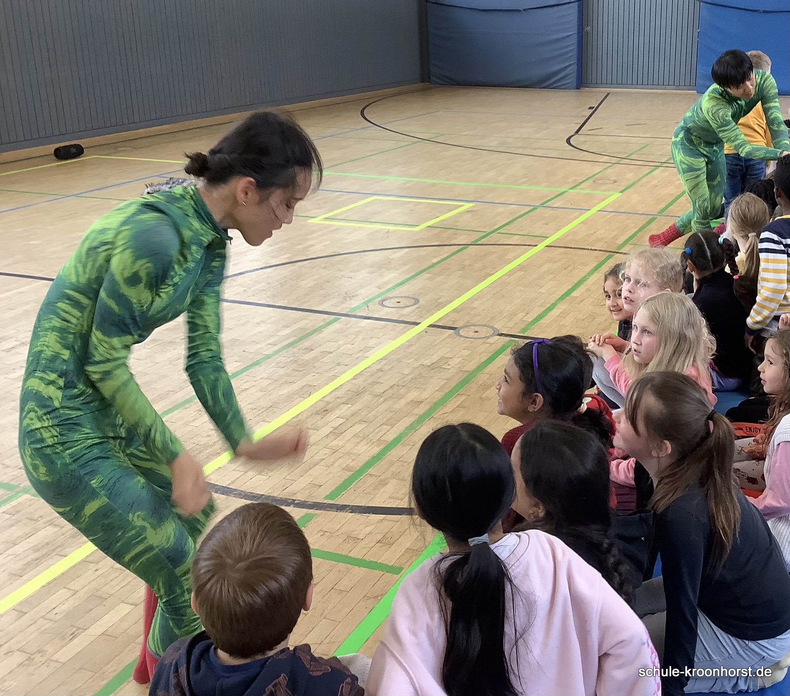 Heute, kurz vor Beginn der Maiferien, hieß es "Herzlich Willkommen am Kroonhorst" - begrüßen durften wir eine internationale Gruppe von Künstlern der Kulturfabrik Kampnagel aus dem Stadtteil Winterhude. Im Rahmen eines dreitägigen Festivals veranstaltete das Team vom "K3 - Zentrum für Choreographie" mehrere so genannte Pop- Up Features. Die mobilen Produktionen mit einer Mischung aus Tanz, Akrobatik und Theater suchten dabei den Weg hin zum Publikum und folgten dafür sehr erfreulich der Einladung unserer drei ersten Klassen an den Kroonhorst.