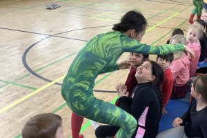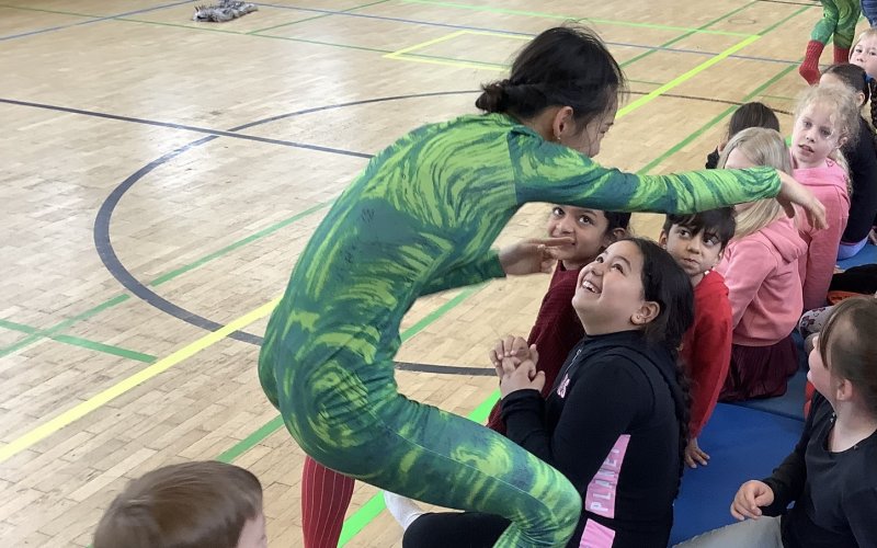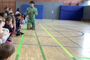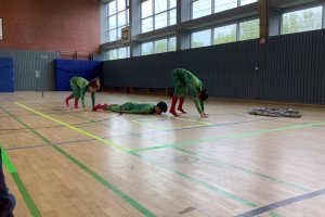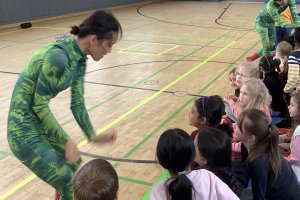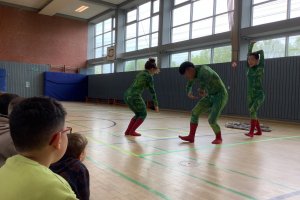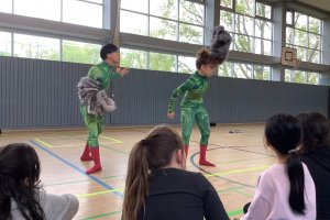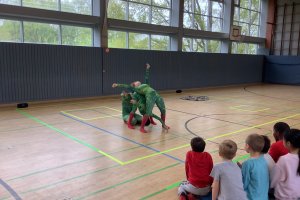 Das Ensemble, bestehend aus drei in hautengen grünen Ganzkörperanzügen und langen roten Strümpfen gekleideten Darstellern, erwartete die Schüler bereits in Position. Die Kinder und begleitenden Erwachsenen nahmen gespannt ihre Plätze ein, das Stück mit dem Titel "Prisma" konnte beginnen.