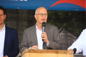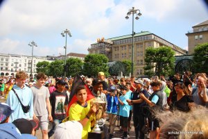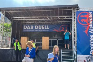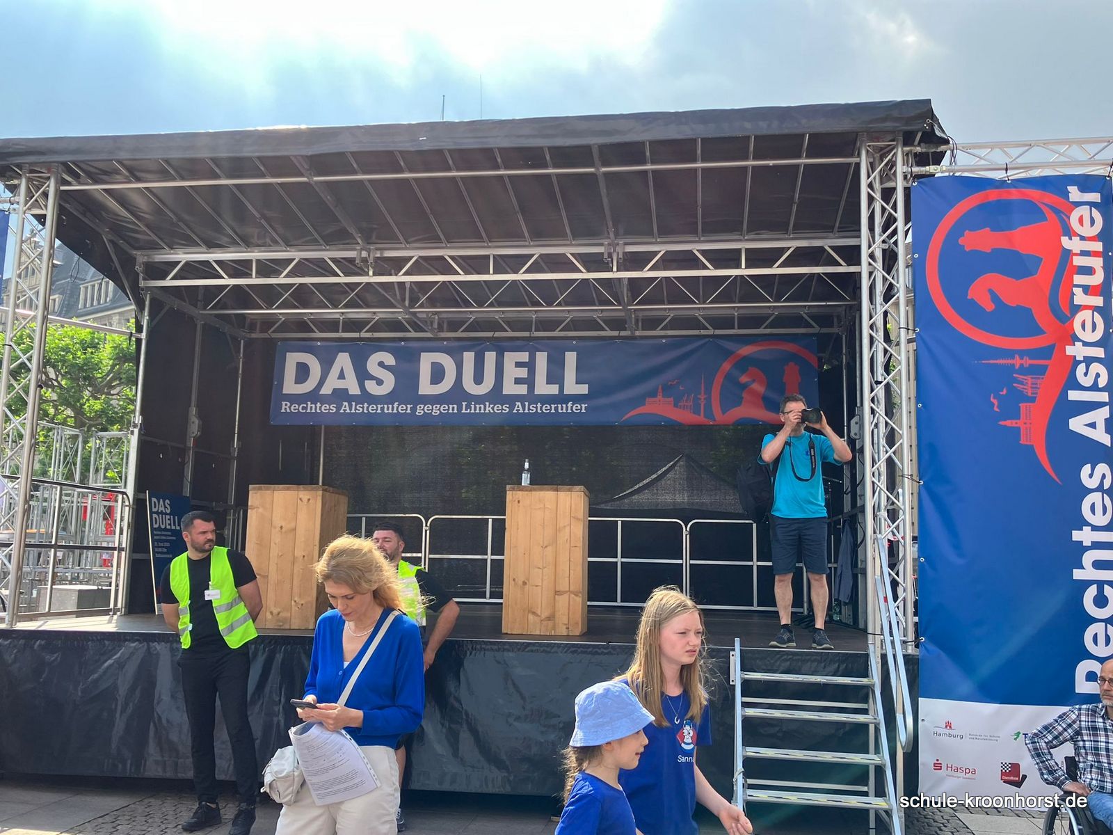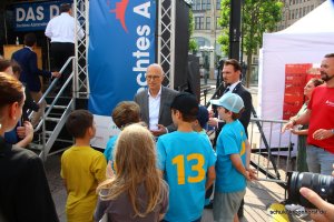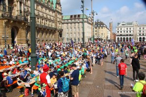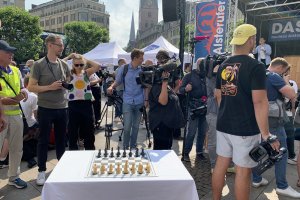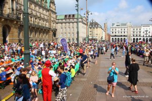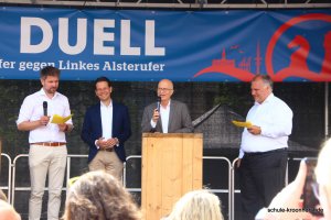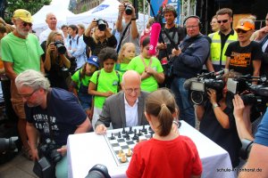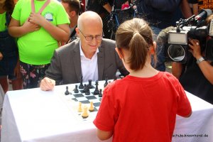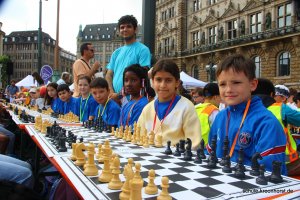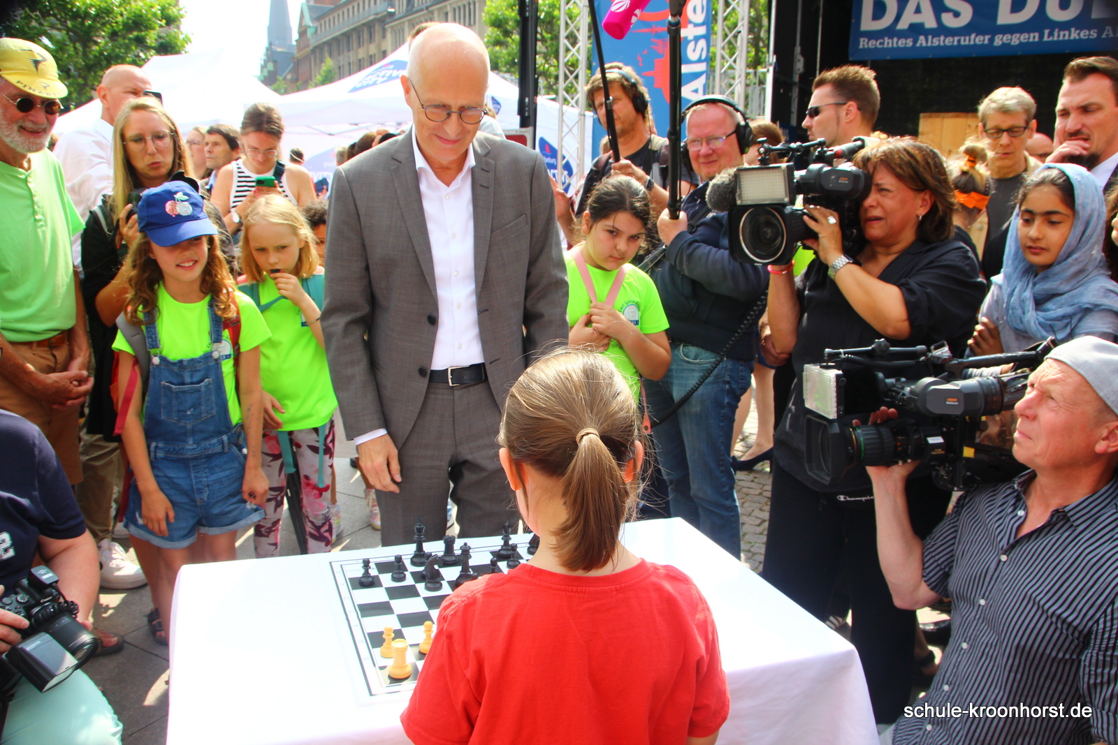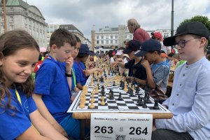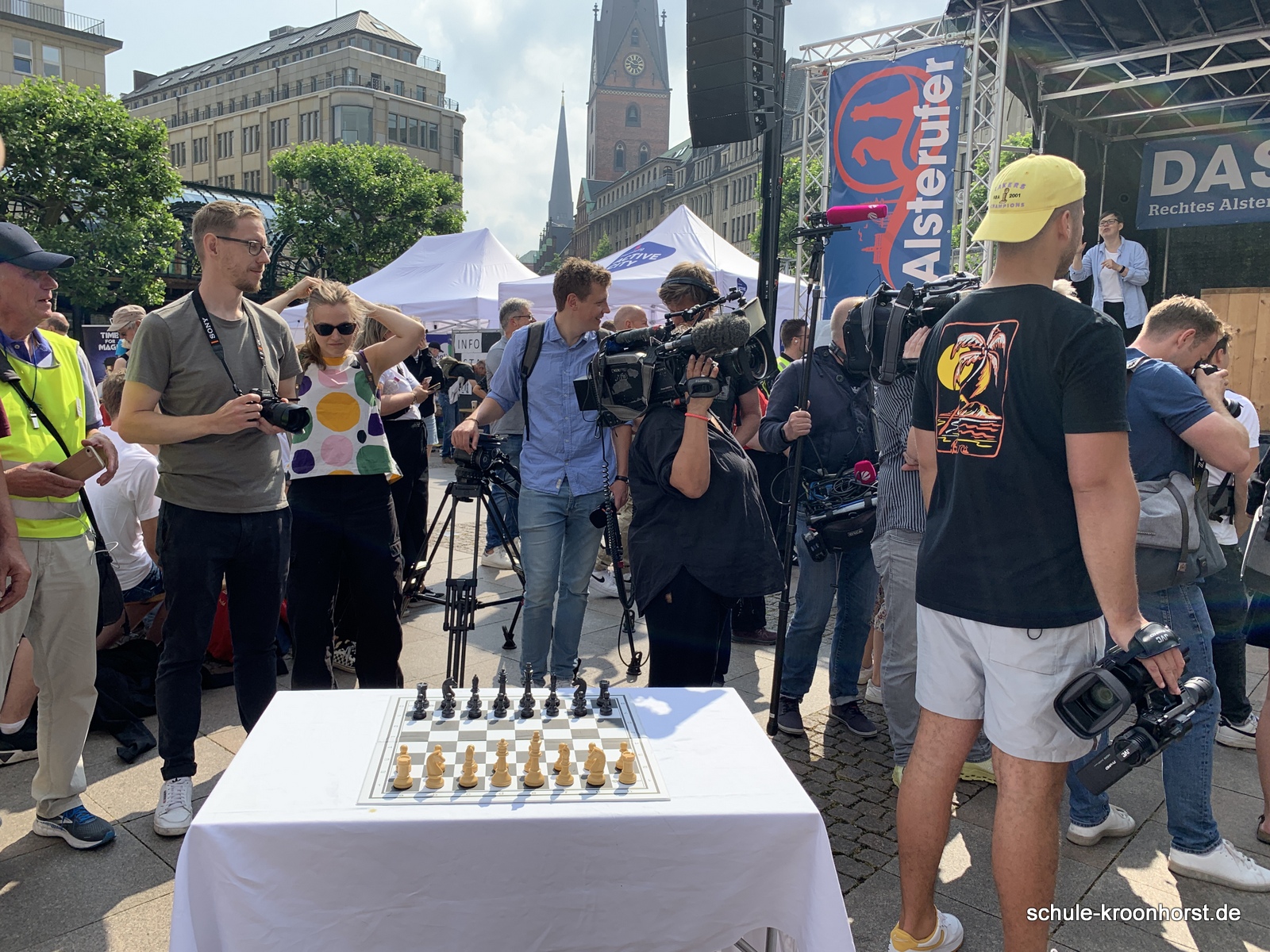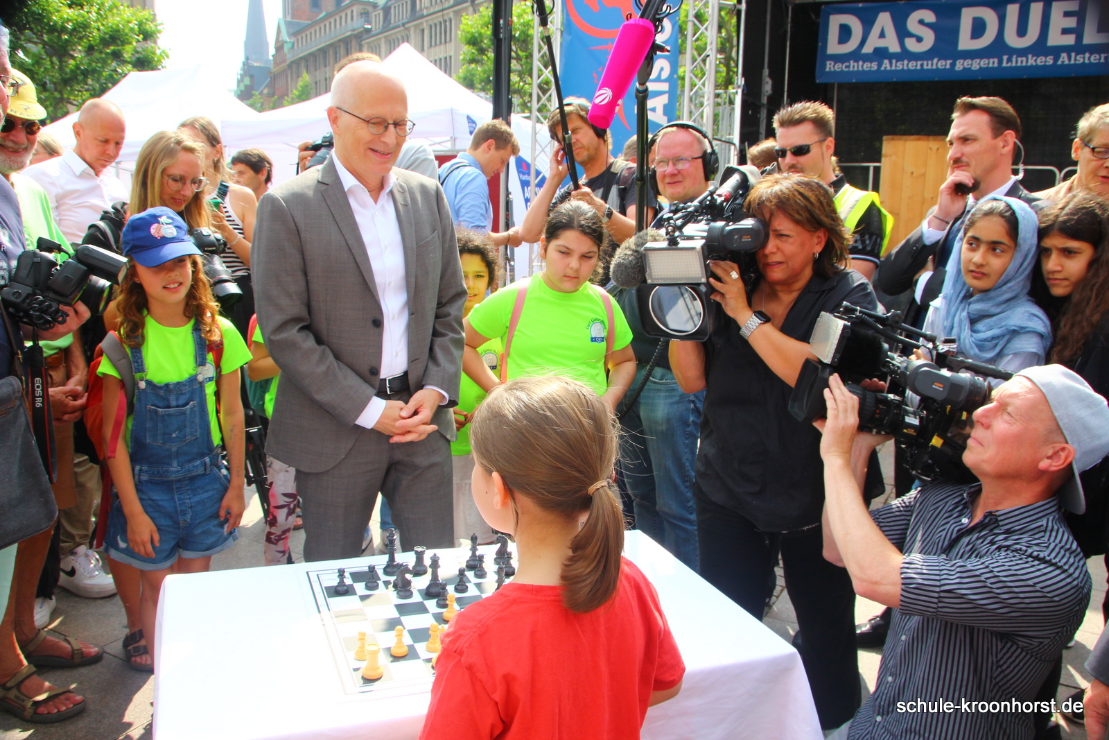 Am Mittwoch war eine Menge los auf dem Rathausplatz in Hamburg. Direkt vor dem Arbeitsplatz des 1. Hamburger Bürgermeisters fand bei bestem Wetter unter freiem Himmel das legendäre Schachturnier „Rechtes Alsterufer gegen Linkes Alsterufer“ statt. Der Bürgermeister ließ es sich auch nicht nehmen, persönlich vor sein Rathaus zu treten und das die ersten Züge gegen eine Schülerin des Vorjahressiegers zu setzen. Schließlich hatte er wohl die kürzeste Anreise aller Teilnehmer.