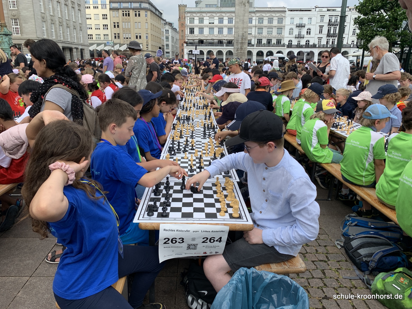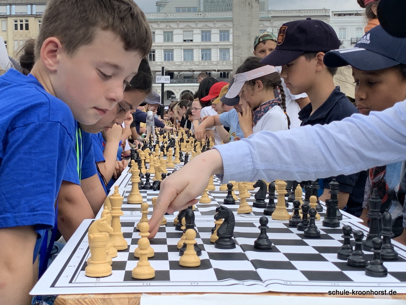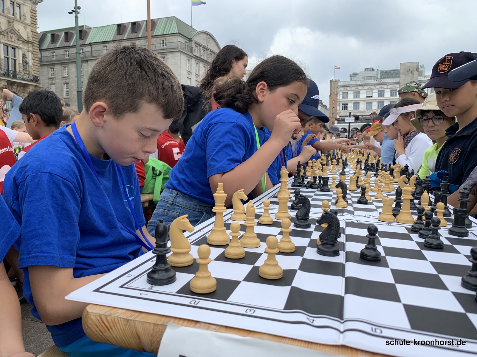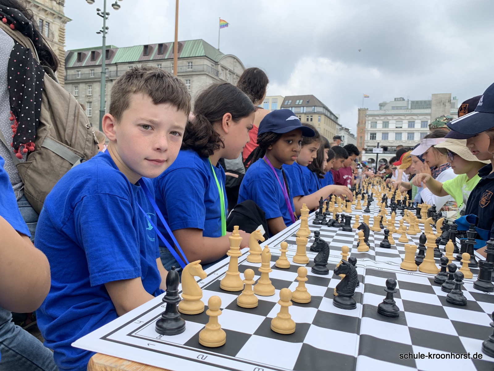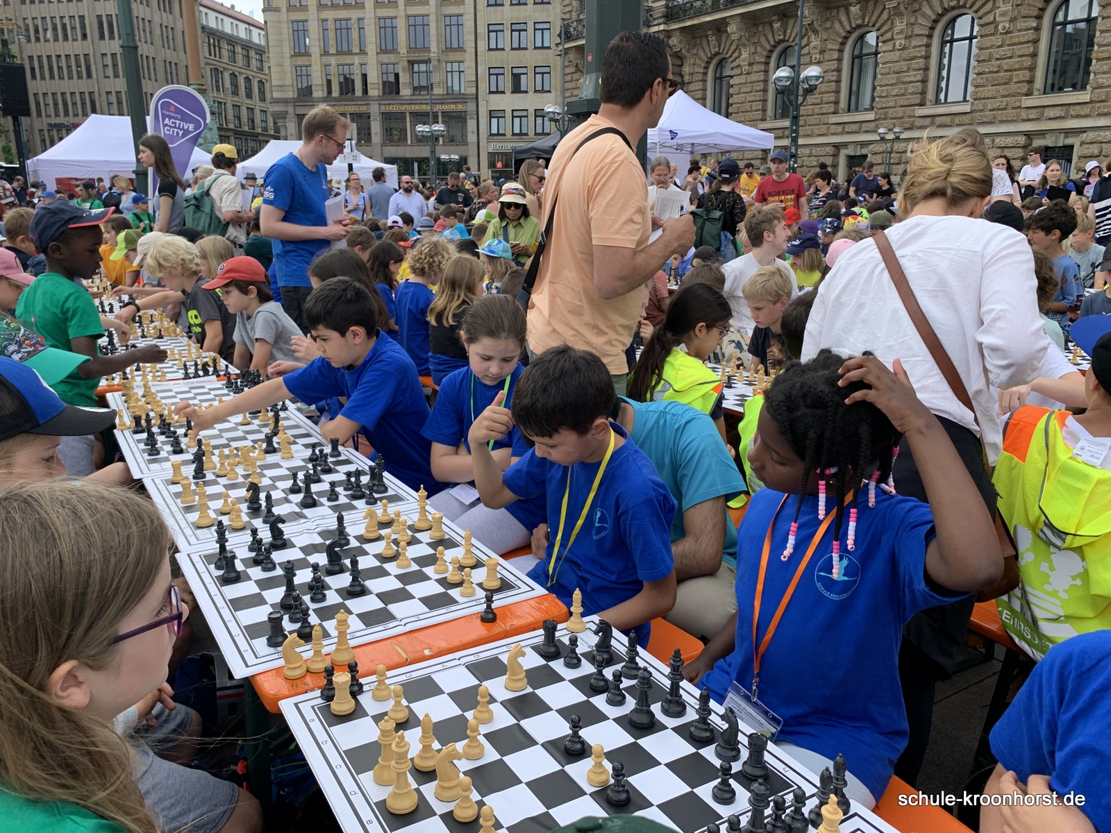 Rund 3.600 Schülerinnen und Schüler kämpften um Ruhm und Ehre. Schon seit 1968 findet jährlich das weltgrößte Schachturnier statt und diesmal mit dabei: Die Klasse 3c. An zwei Tischen mit je 8 Schachbrettern begannen die jungen Schachfreunde noch etwas unsicher, konnten aber die Nervosität im zweiten Match ablegen und am Ende ein achtbares Ergebnis erzielen. Das Schachspielen haben Sie bei ihrer Klassenlehrerin Frau Puls gelernt. Bei allem Ehrgeiz stand der Spaß natürlich im Vordergrund, aber mit einem Auge wurde auch immer auf die Statistik geschielt. Am Ende gewann zwar das linke Alsterufer - also die anderen. Aber das war nicht so wichtig, denn obendrauf gab's noch eine leckere Sushi-Box und ein Eis für jeden. Besser hätte der Tag nicht enden können.