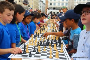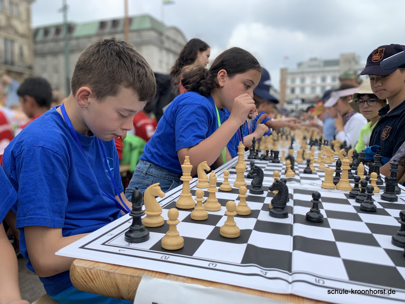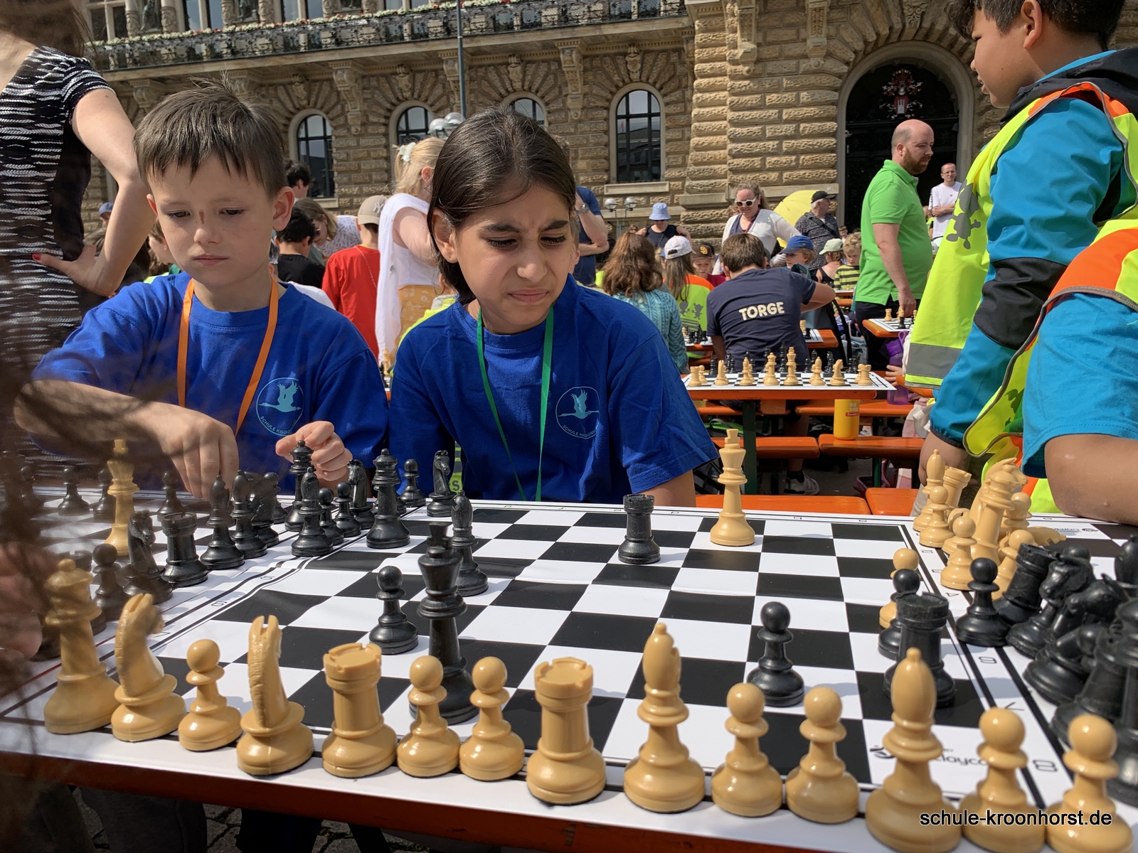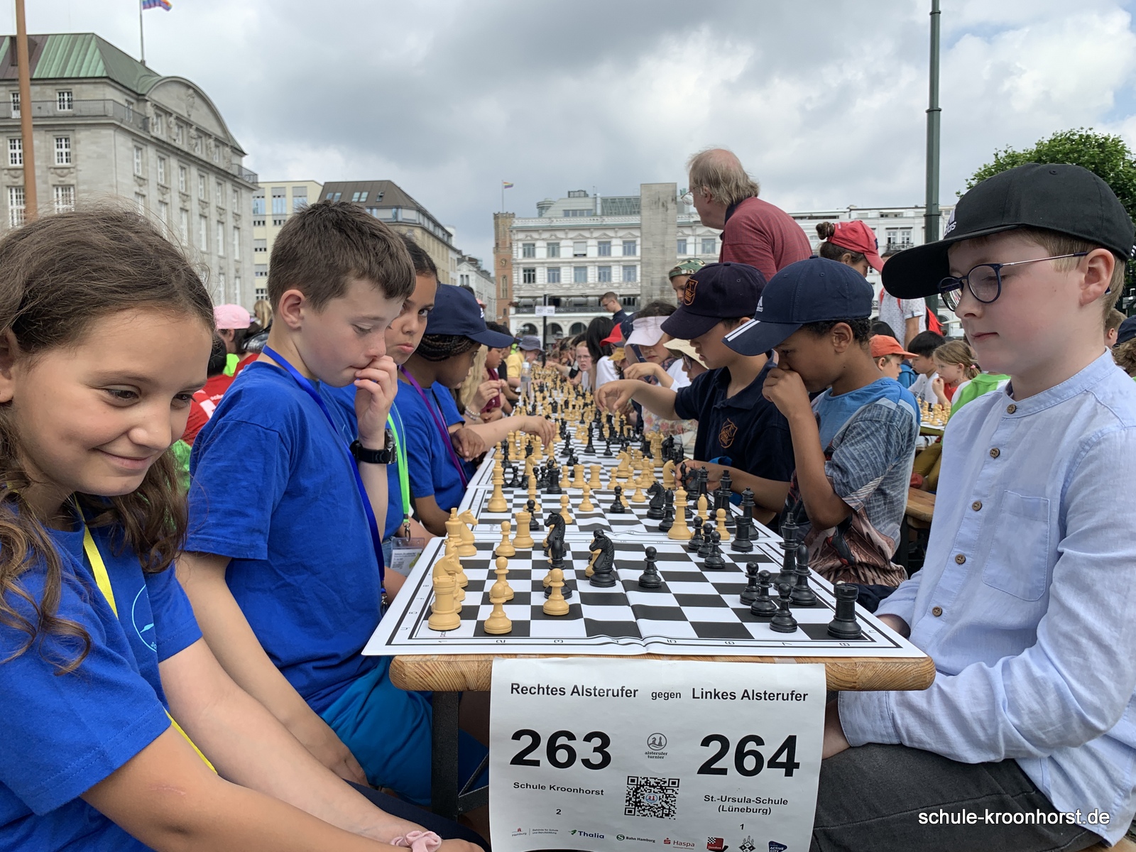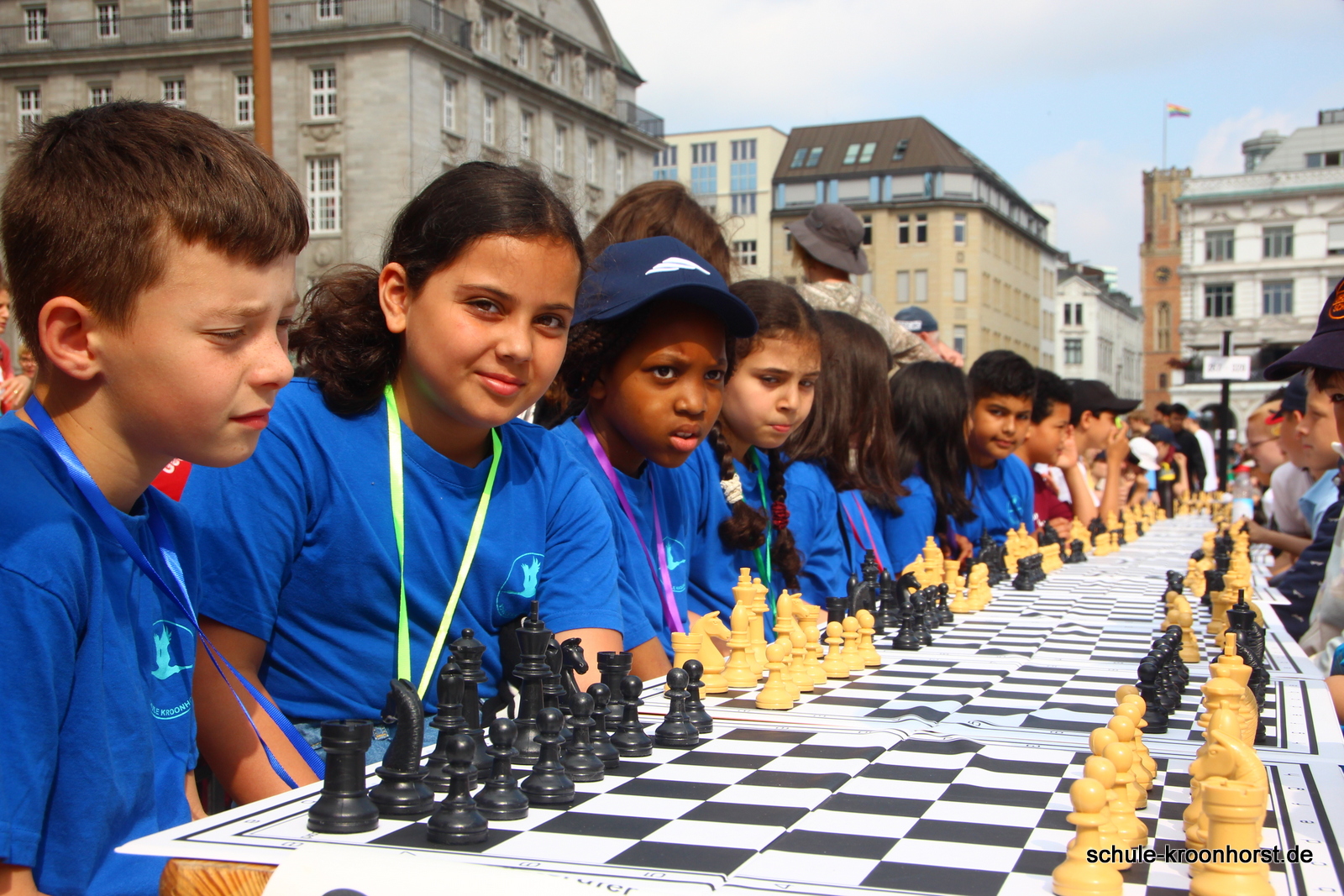 Rund 3.600 Schülerinnen und Schüler kämpften um Ruhm und Ehre. Schon seit 1968 findet jährlich das weltgrößte Schachturnier statt und diesmal mit dabei: Die Klasse 3c. An zwei Tischen mit je 8 Schachbrettern begannen die jungen Schachfreunde noch etwas unsicher, konnten aber die Nervosität im zweiten Match ablegen und am Ende ein achtbares Ergebnis erzielen. Das Schachspielen haben Sie bei ihrer Klassenlehrerin Frau Puls gelernt. Bei allem Ehrgeiz stand der Spaß natürlich im Vordergrund, aber mit einem Auge wurde auch immer auf die Statistik geschielt. Am Ende gewann zwar das linke Alsterufer - also die anderen. Aber das war nicht so wichtig, denn obendrauf gab's noch eine leckere Sushi-Box und ein Eis für jeden. Besser hätte der Tag nicht enden können.