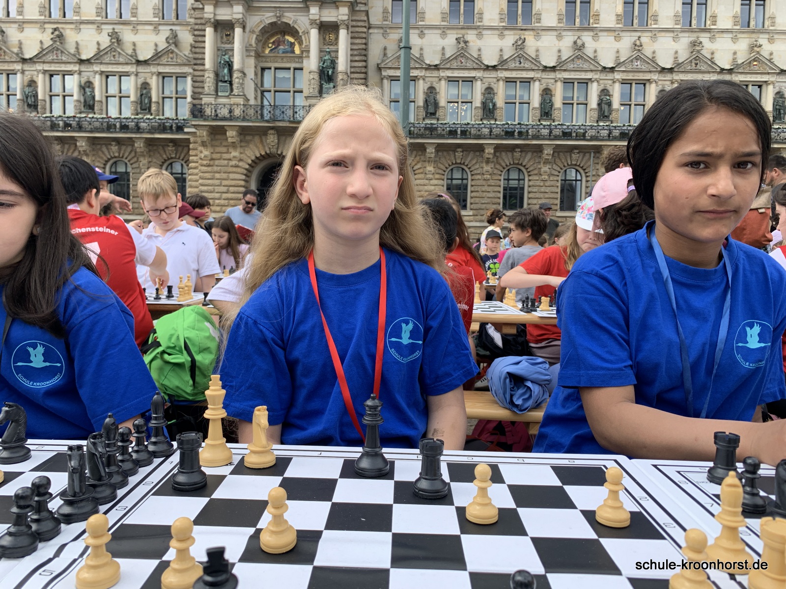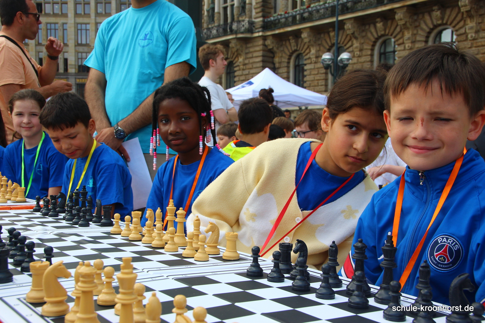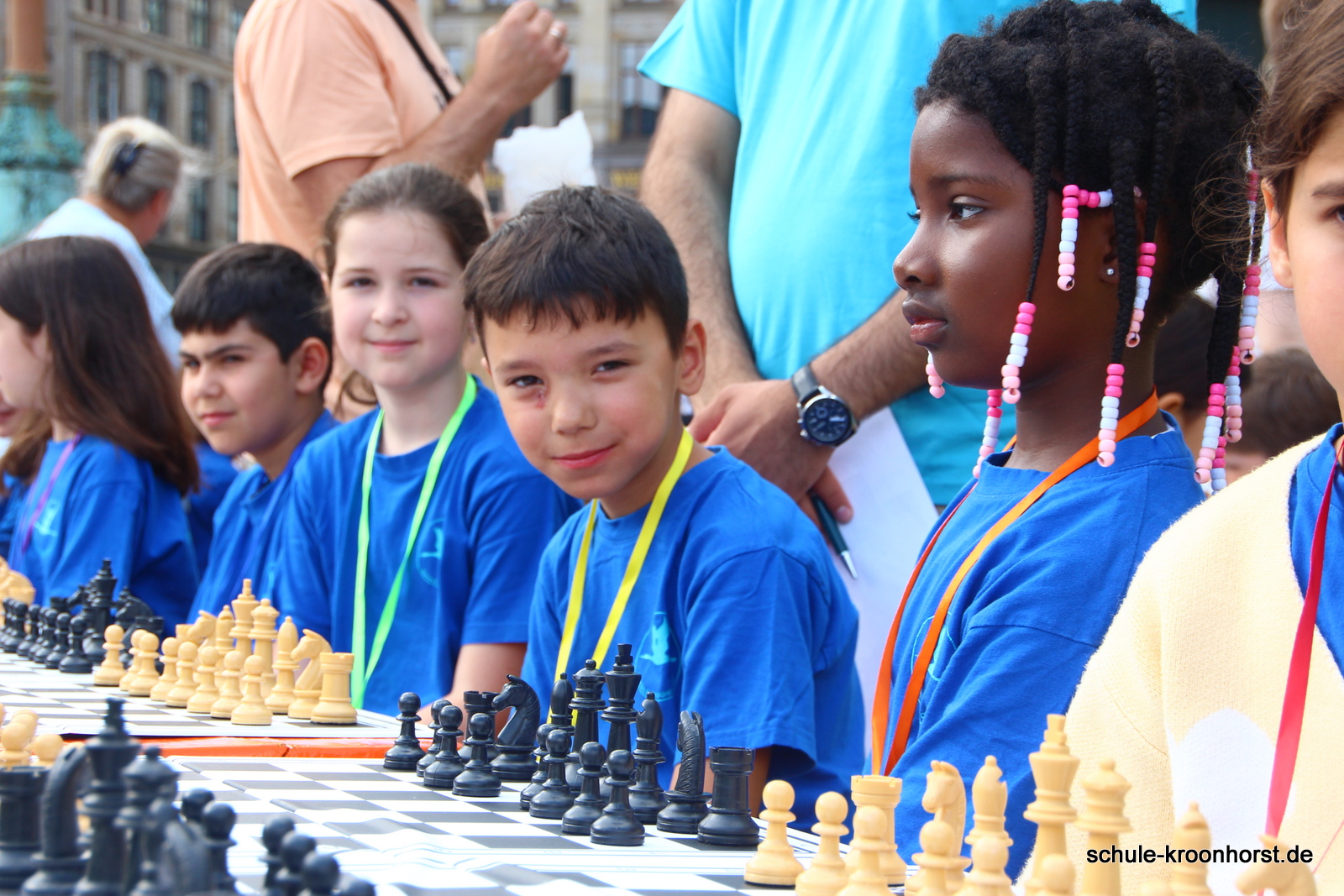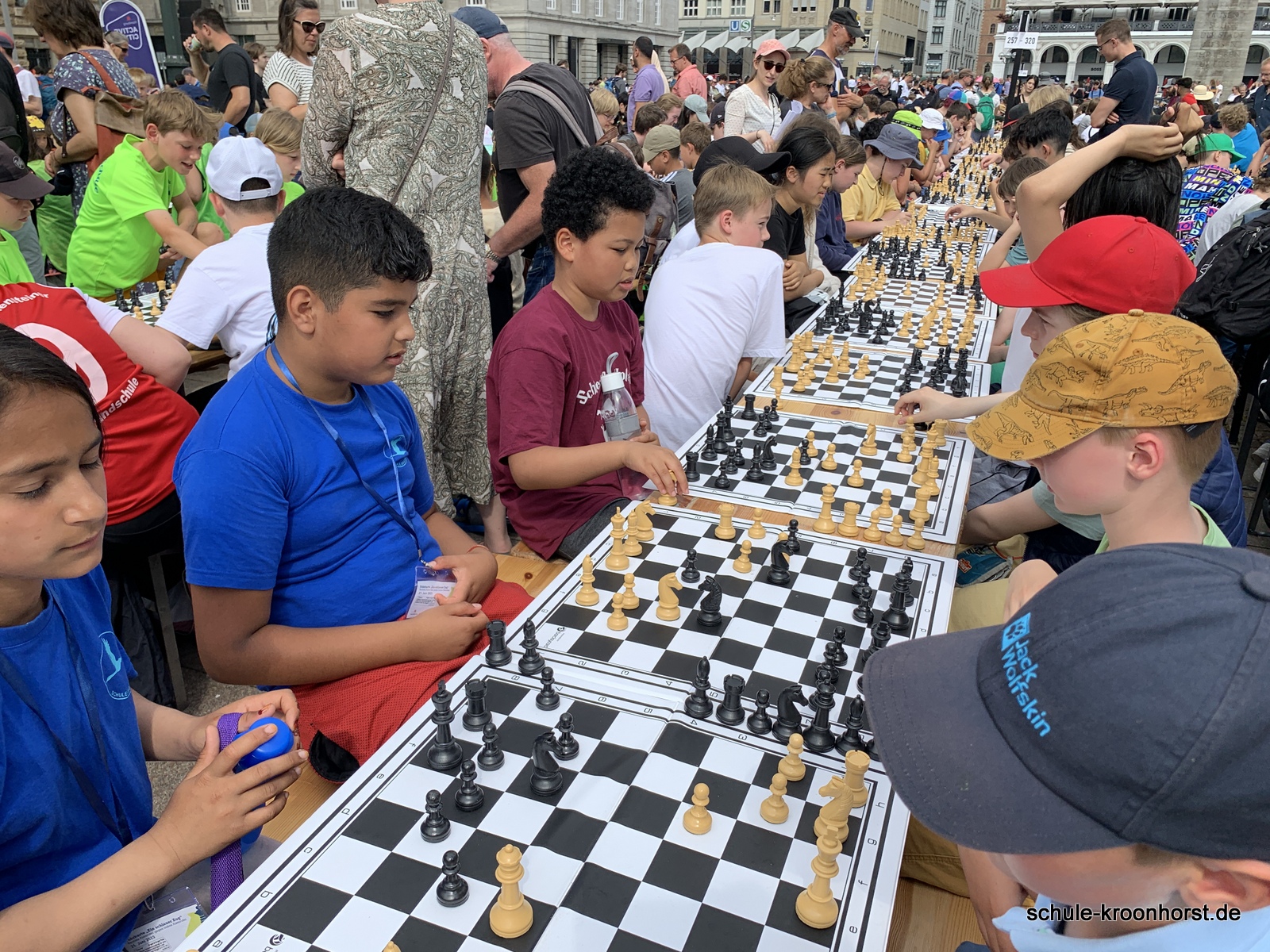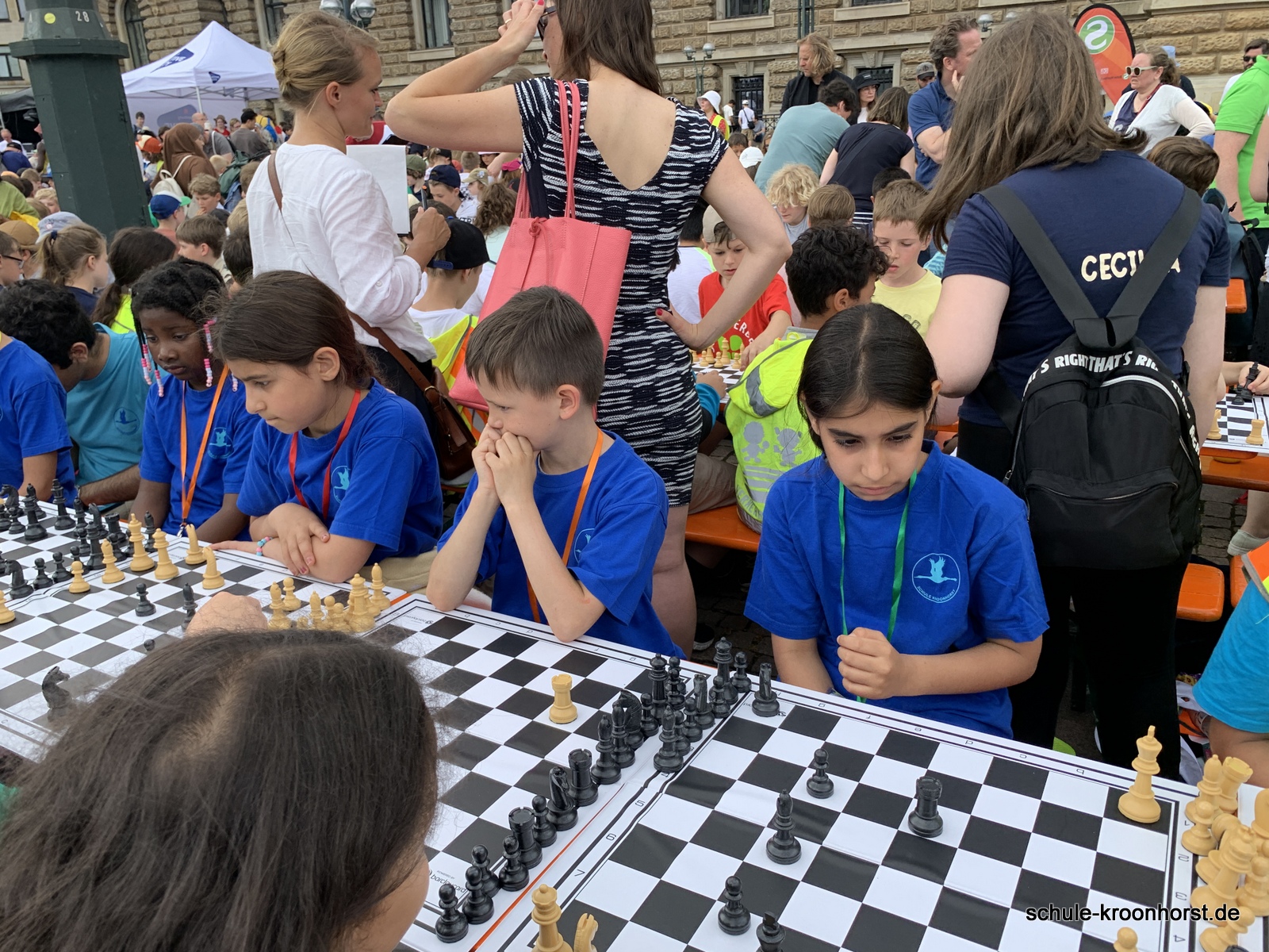 Rund 3.600 Schülerinnen und Schüler kämpften um Ruhm und Ehre. Schon seit 1968 findet jährlich das weltgrößte Schachturnier statt und diesmal mit dabei: Die Klasse 3c. An zwei Tischen mit je 8 Schachbrettern begannen die jungen Schachfreunde noch etwas unsicher, konnten aber die Nervosität im zweiten Match ablegen und am Ende ein achtbares Ergebnis erzielen. Das Schachspielen haben Sie bei ihrer Klassenlehrerin Frau Puls gelernt. Bei allem Ehrgeiz stand der Spaß natürlich im Vordergrund, aber mit einem Auge wurde auch immer auf die Statistik geschielt. Am Ende gewann zwar das linke Alsterufer - also die anderen. Aber das war nicht so wichtig, denn obendrauf gab's noch eine leckere Sushi-Box und ein Eis für jeden. Besser hätte der Tag nicht enden können.