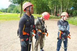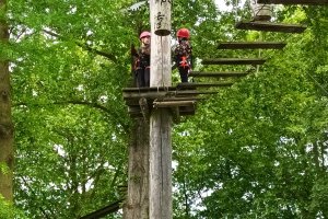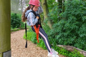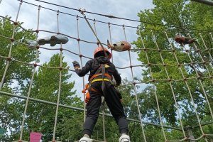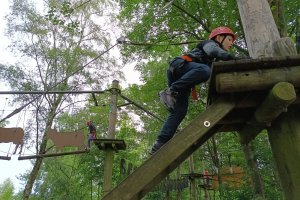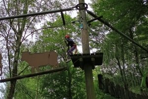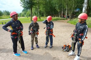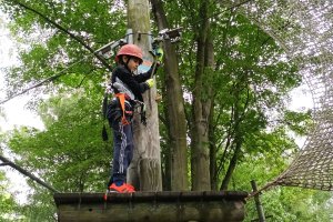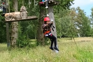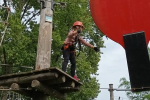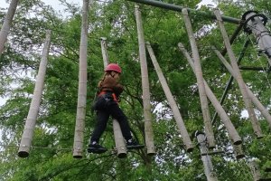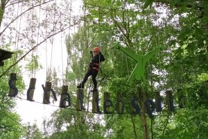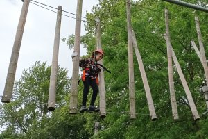 Im idyllischen Inselpark erwartete uns das Team von "Hanse Rock". Ausgerüstet mit Handschuhen, Helmen und Gurten erhielten wir zunächst eine Einweisung in die wichtigsten Sicherheitsregeln, ehe wir uns an die insgesamt fünf verschiedenen Parcours wagten. In schwindelerregender Höhe kletterten die Schüler von Baum zu Baum, überwanden dabei diverse Hindernisse und balancierten auf dem schmalen, wackeligen Drahtseil, bevor eine Seilbahn sie wieder zurück auf den festen Boden beförderte. Eine große Portion Mut bedurfte es dabei.