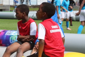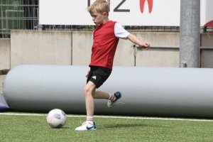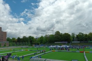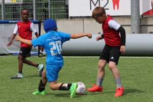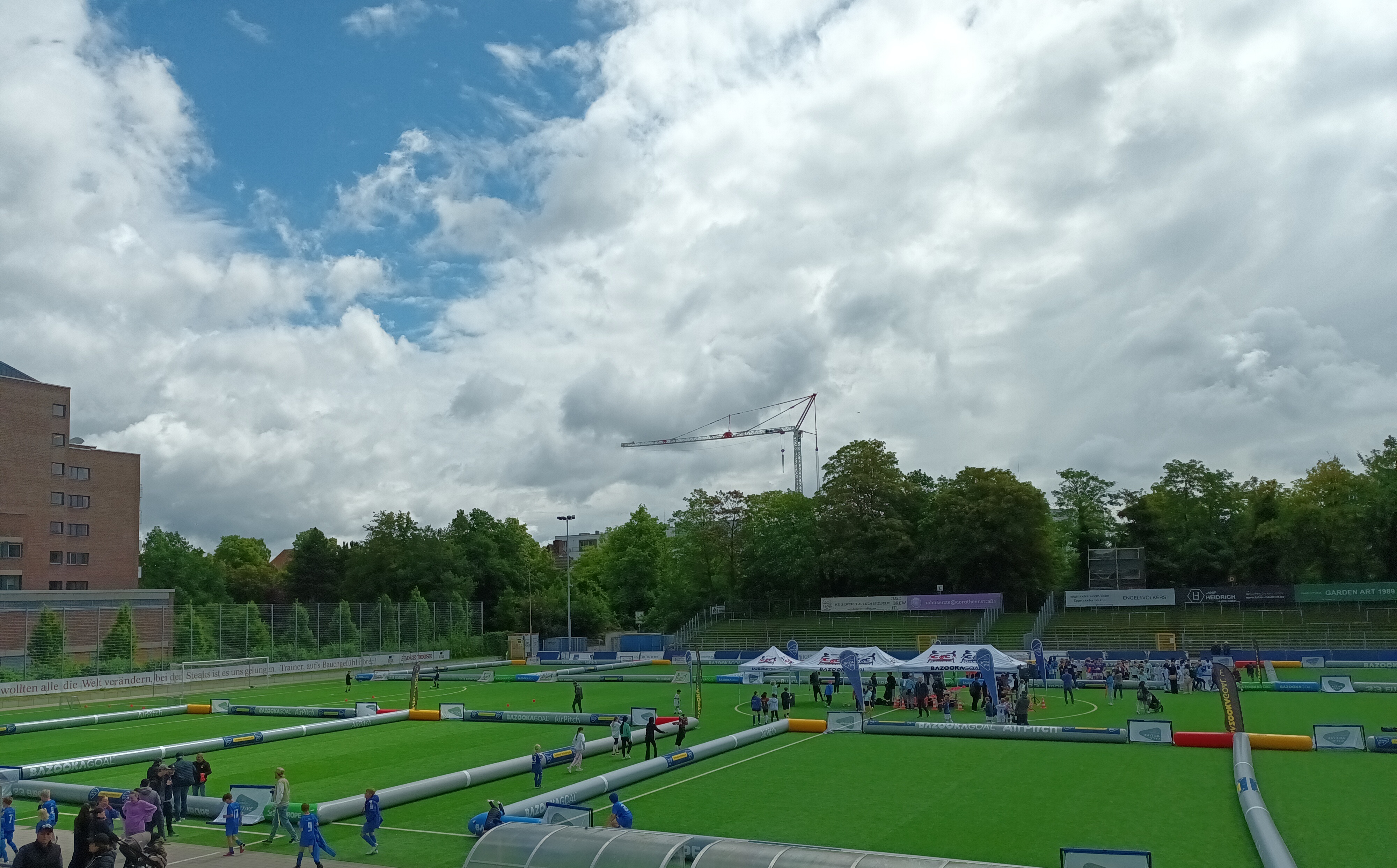 Begeistert staunten wir bei unserer Ankunft über das Spielfeld. Auf dem großen Kunstrasenplatz waren zwölf kleine, von einer aufblasbaren Bande begrenzte Felder aufgebaut. Der Modus des Turniers war nach den Regeln der Spielform "Funino" initiiert: Drei gegen Drei auf jeweils zwei Minitore ohne Schiedsrichter.